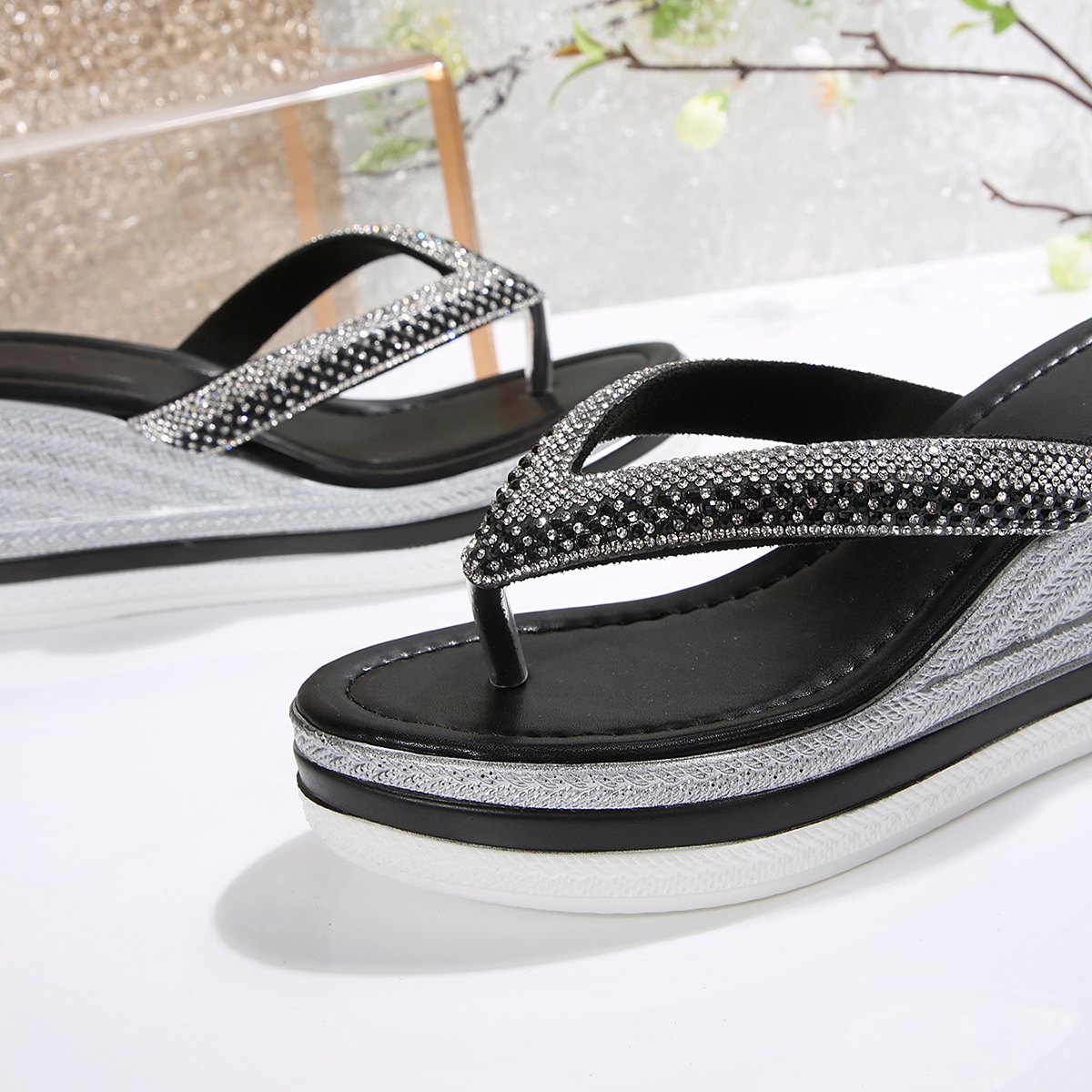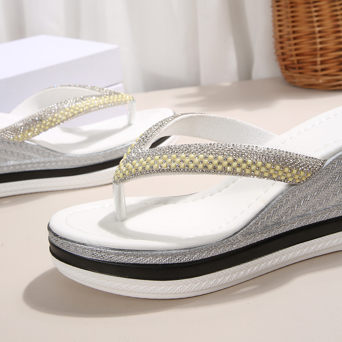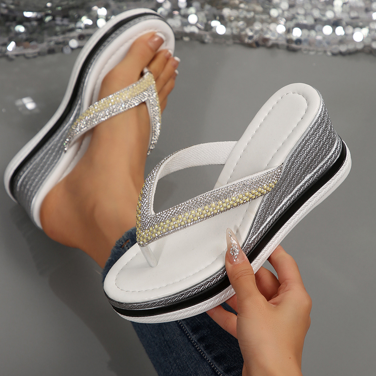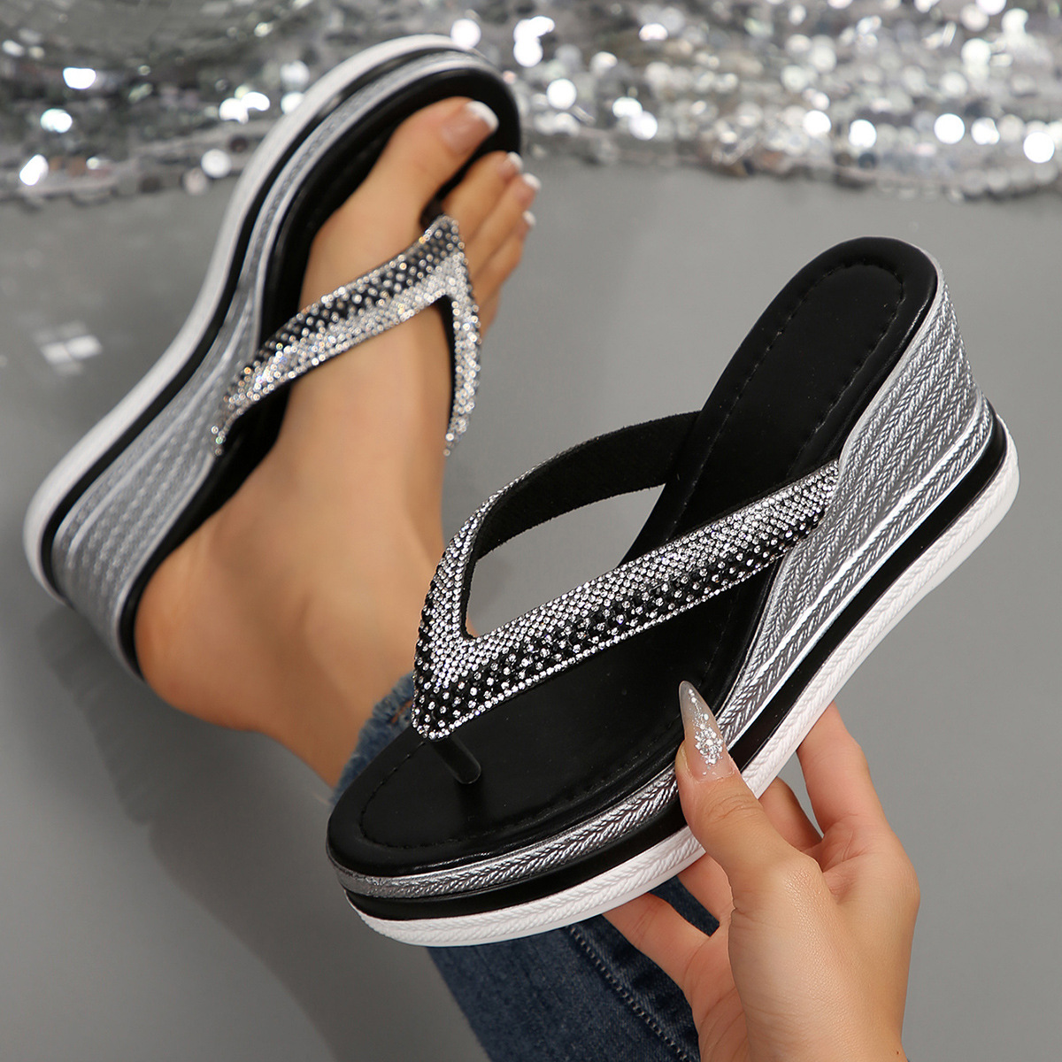 국경 간 2025 대외 무역 새로운 단색 헤링본 유럽과 미국 스타일의 대형 여성 라운드 발가락 두꺼운 밑창 웨지 샌들