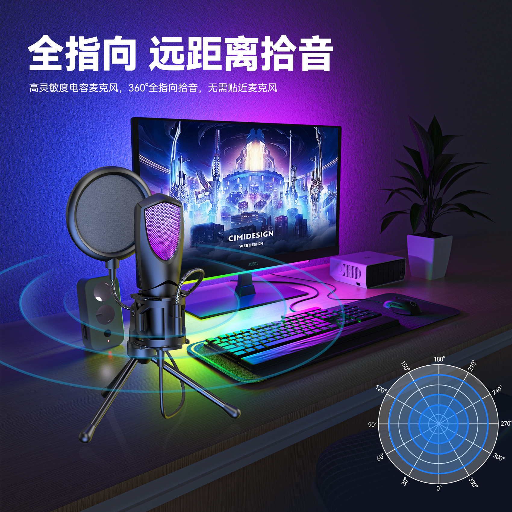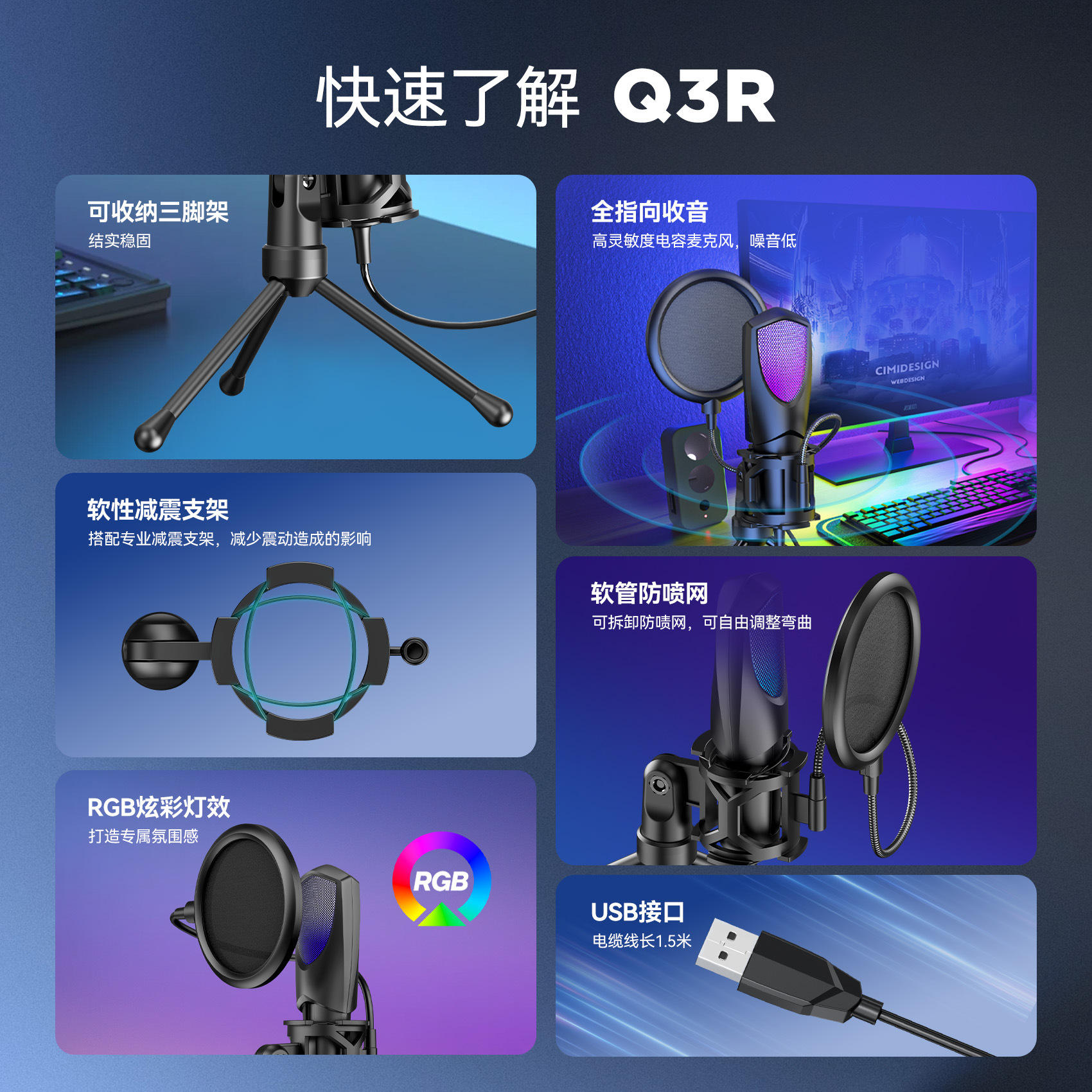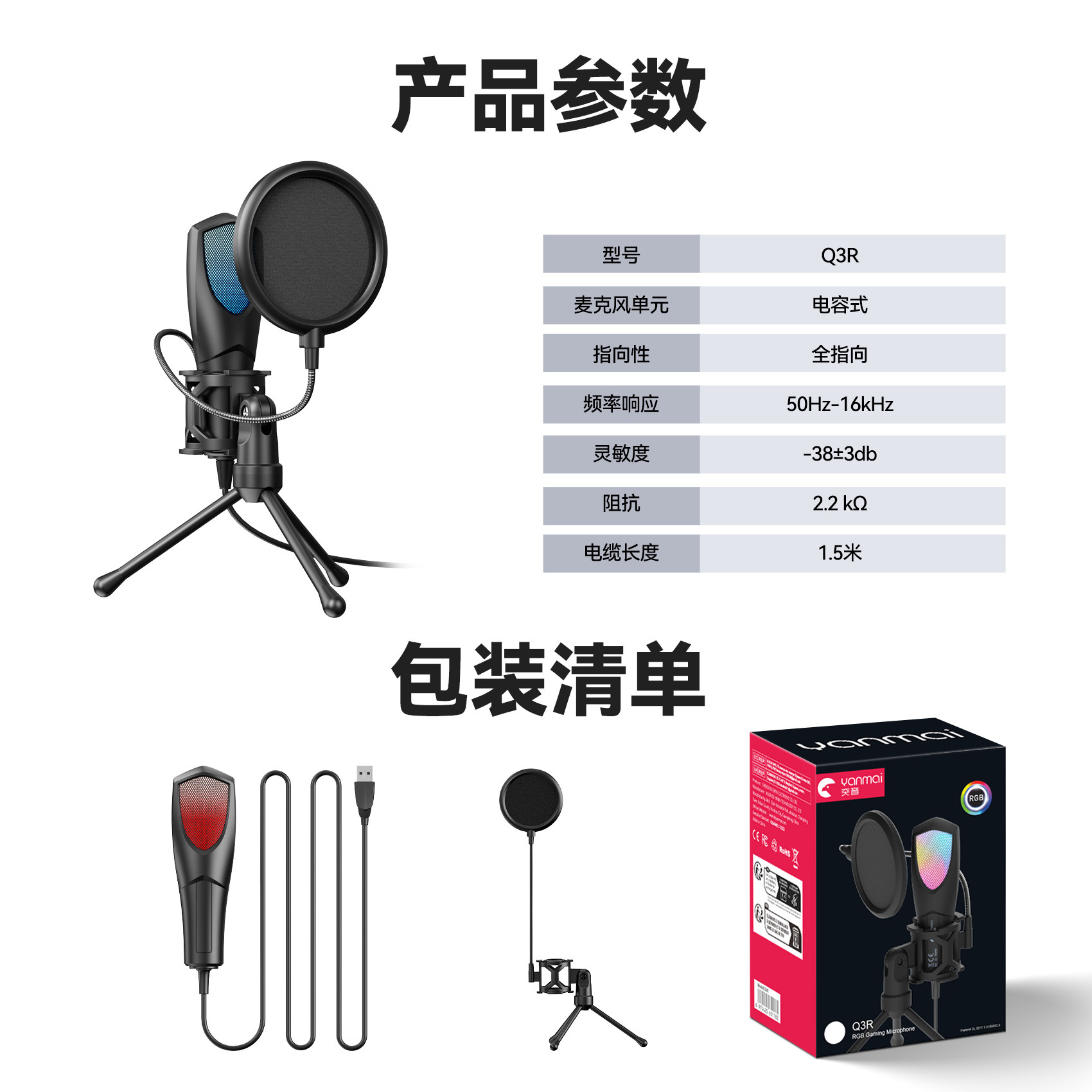 2025 신제품 크로스보더 무역 전용 RGB 게이밍 e스포츠 컴퓨터 데스크탑 콘덴서 마이크 Q3R/Q3G스토어 가기