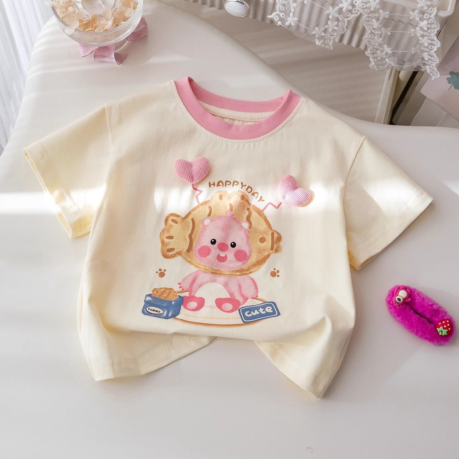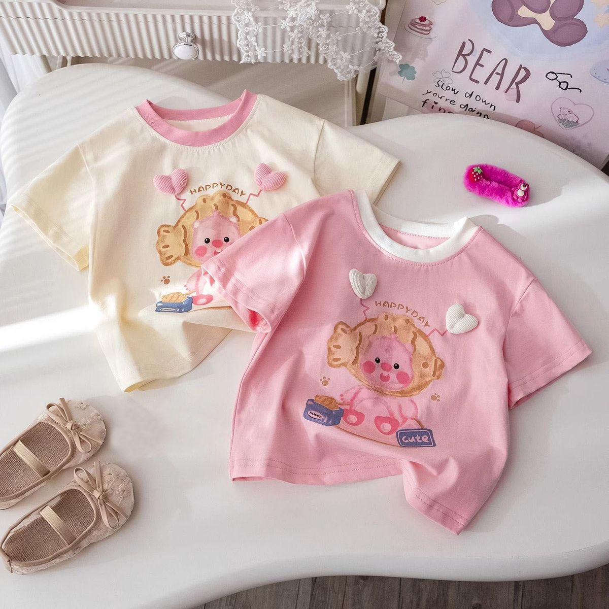 여자 달콤한 반팔 티셔츠 여름 새 아기 귀여운 만화 인쇄 입체 사랑 대비 색상 반팔 탑스토어 가기