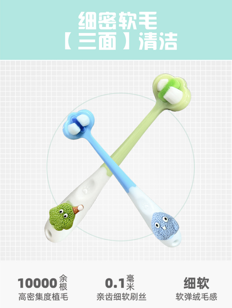 3~12세 유아를 위한 부드러운 모를 갖춘 어린이용 삼면 칫솔, 특수 치아 보호대, 모피 괴물 만화 삼두 칫솔스토어 가기