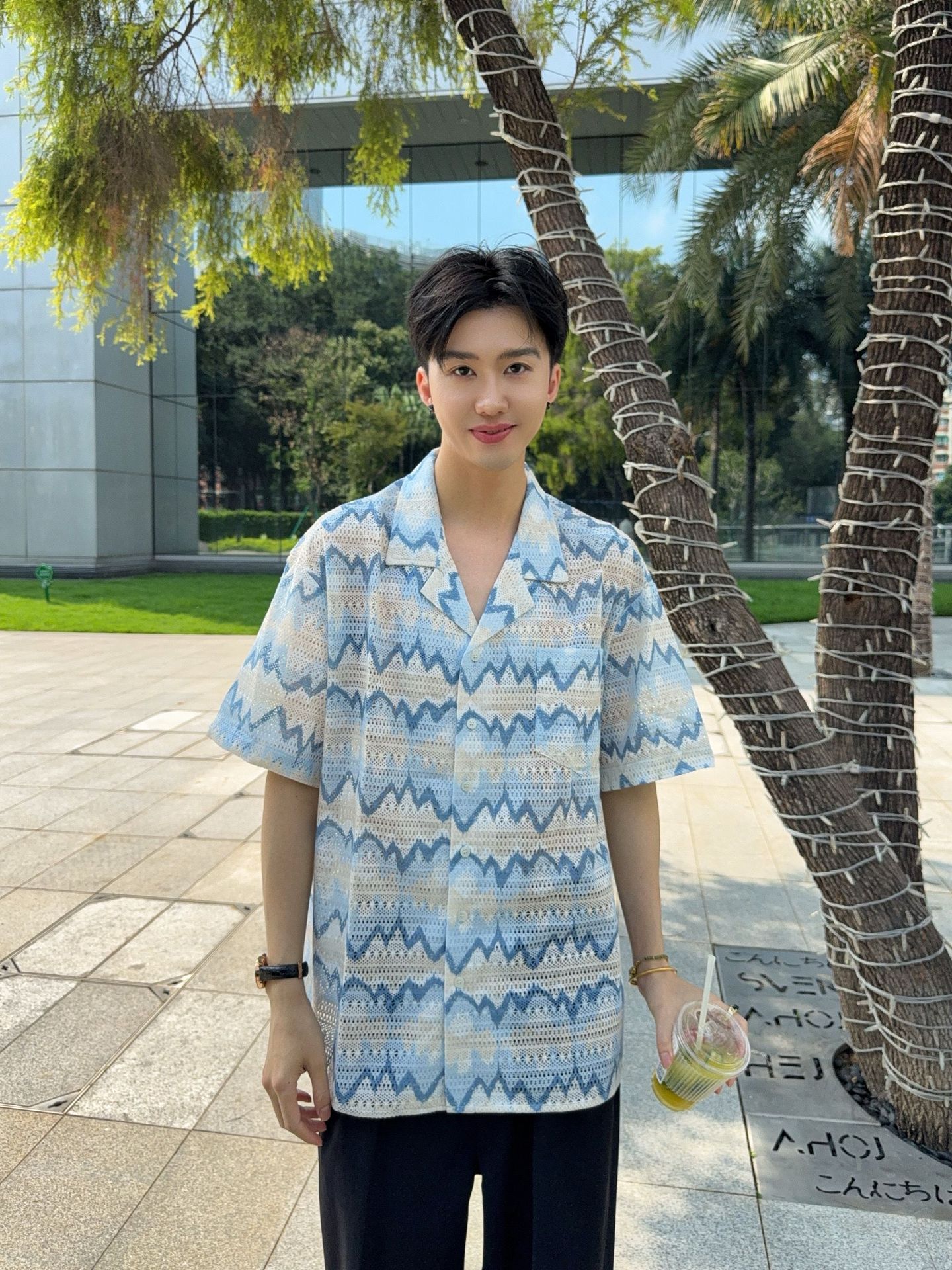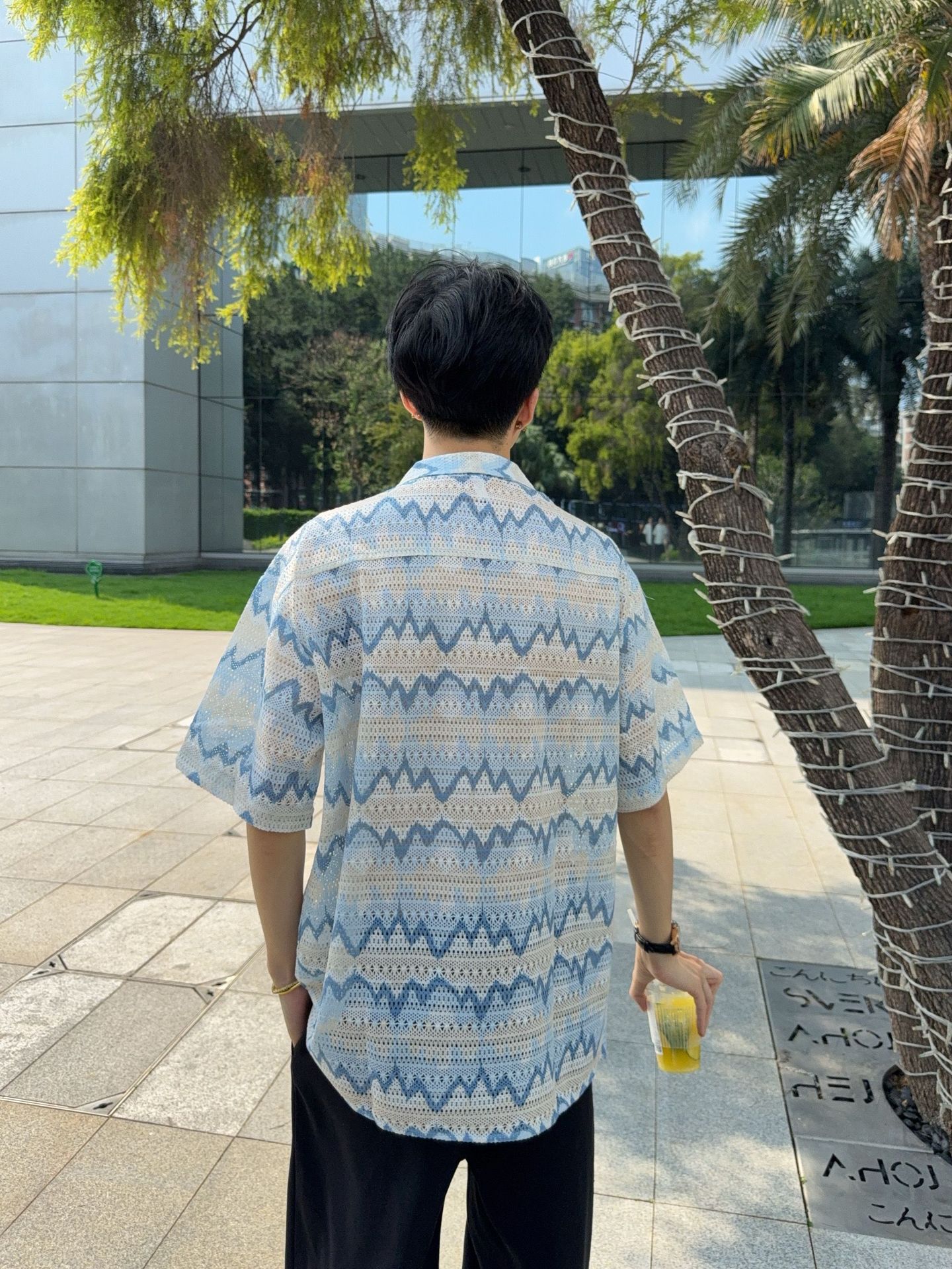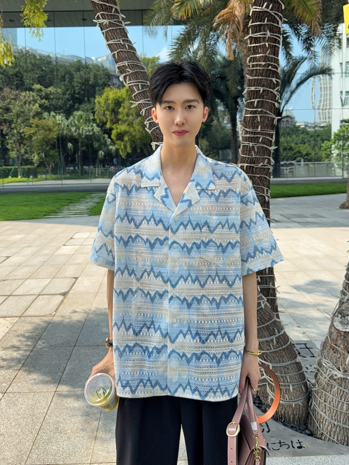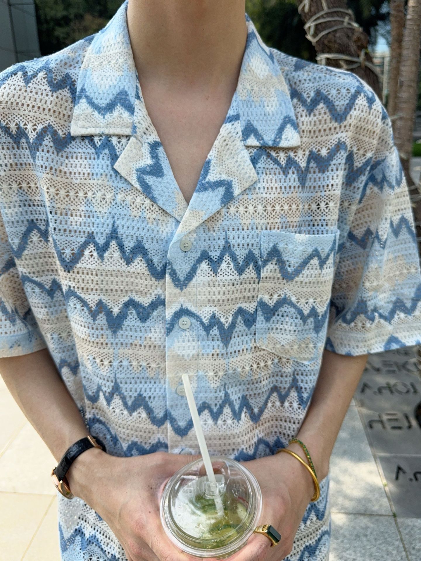 대비 색상 중공 웨이브 패턴 남성용 반팔 셔츠 2025 여름 새로운 휴가 스타일 느슨한 통기성 태양 보호 꽃 셔츠스토어 가기