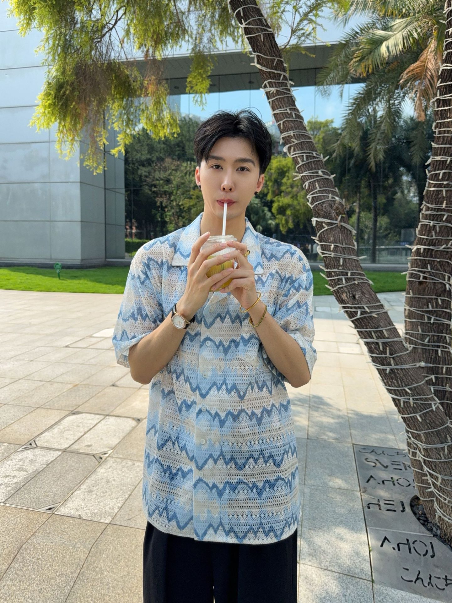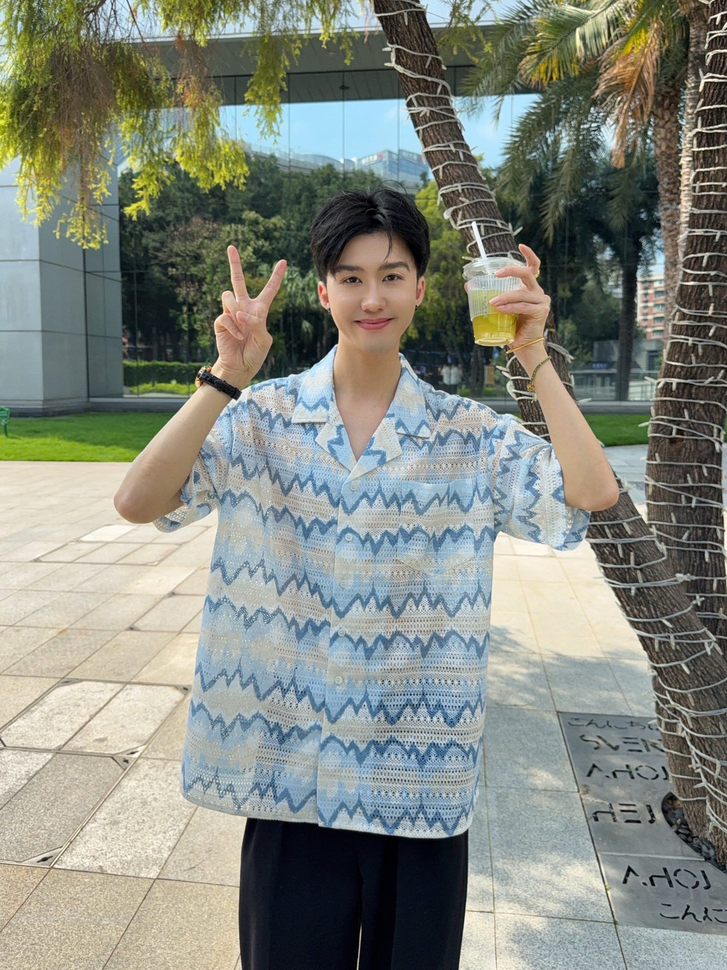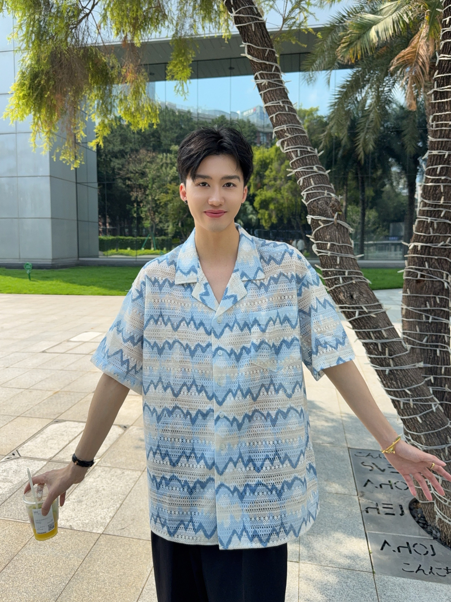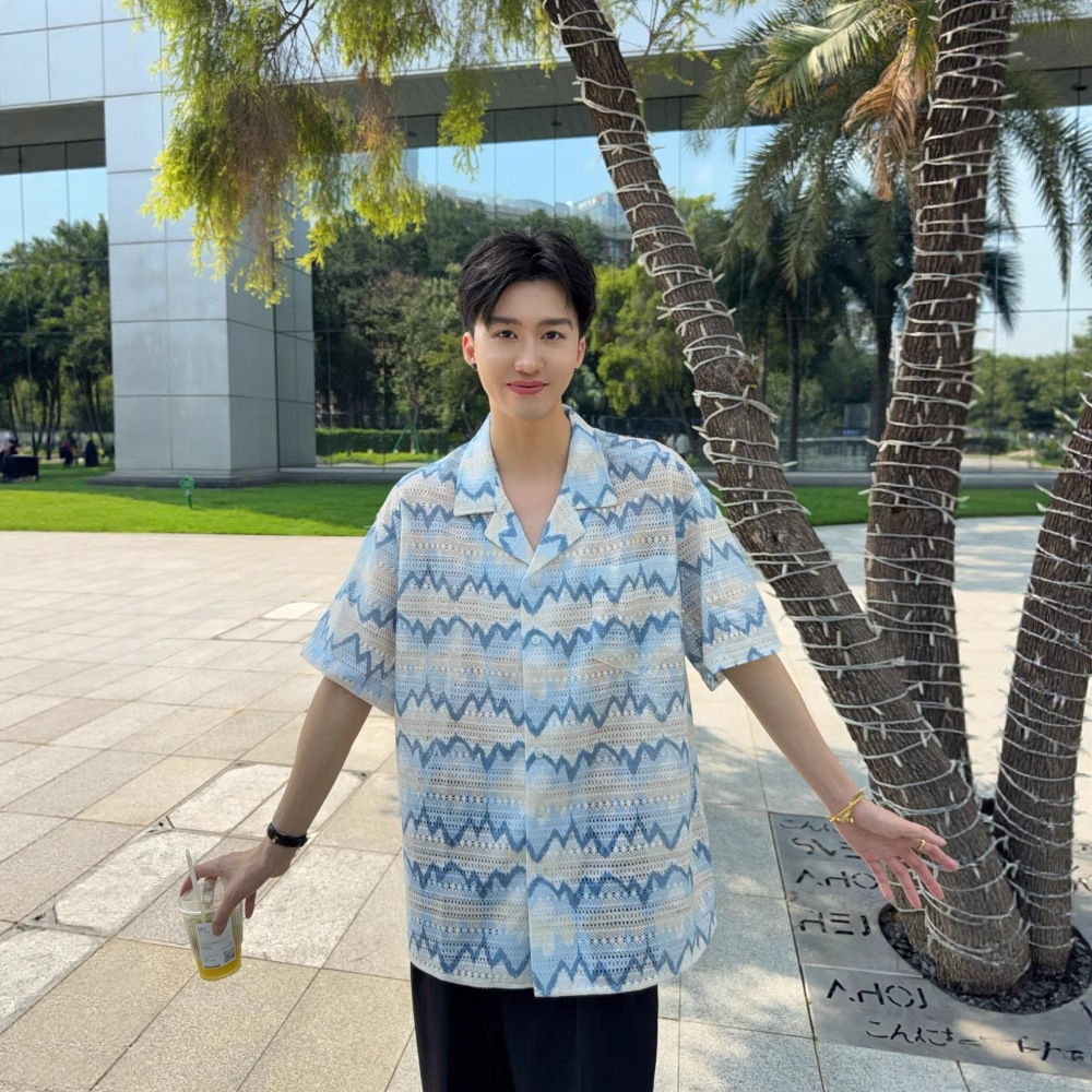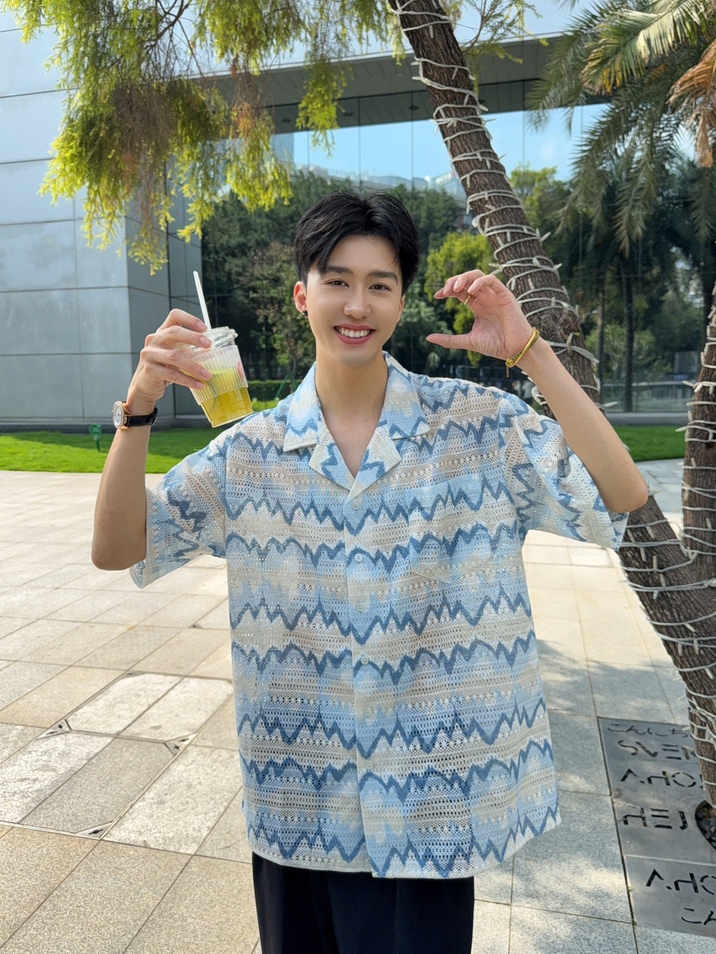 대비 색상 중공 웨이브 패턴 남성용 반팔 셔츠 2025 여름 새로운 휴가 스타일 느슨한 통기성 태양 보호 꽃 셔츠스토어 가기