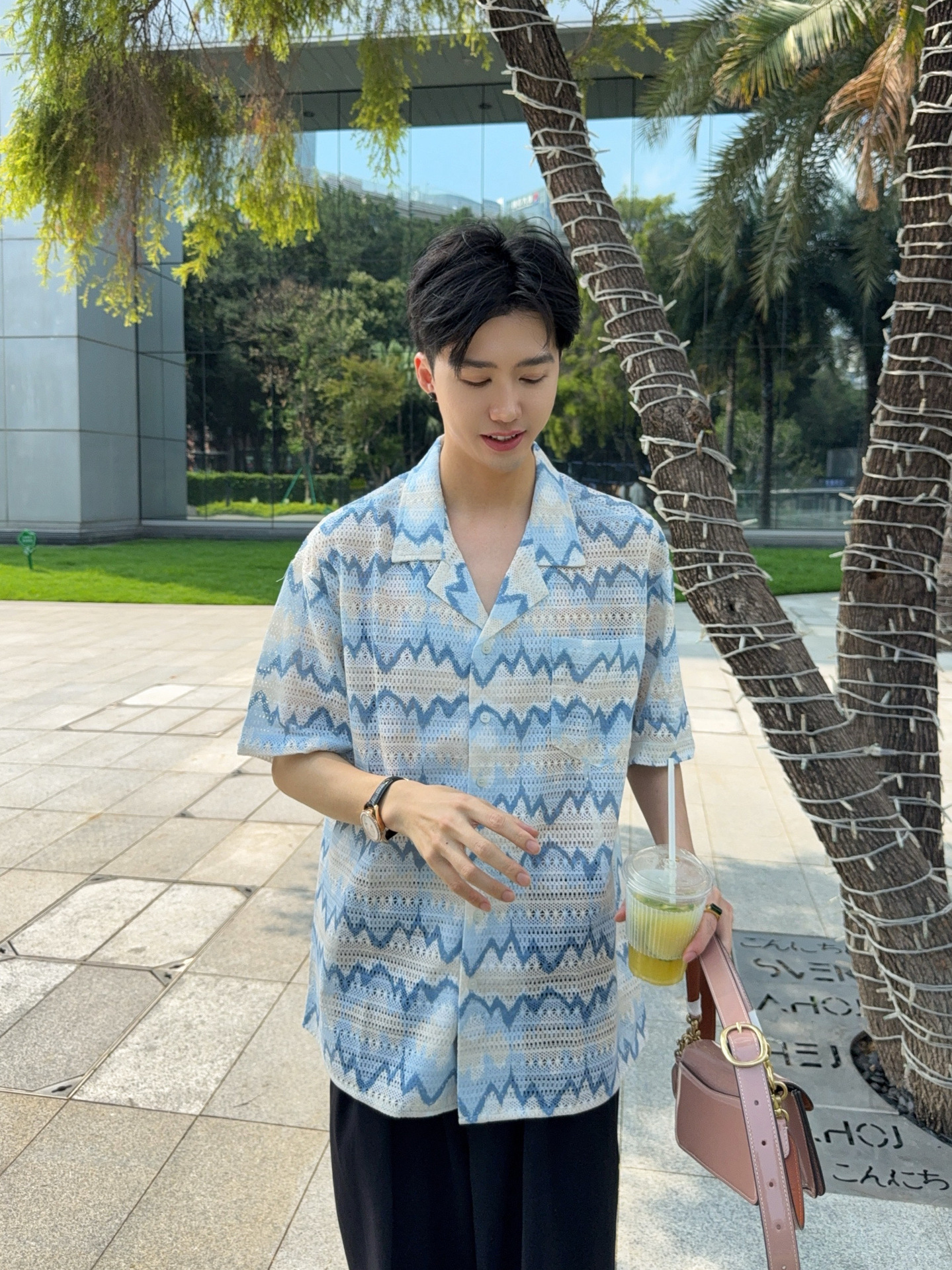 대비 색상 중공 웨이브 패턴 남성용 반팔 셔츠 2025 여름 새로운 휴가 스타일 느슨한 통기성 태양 보호 꽃 셔츠