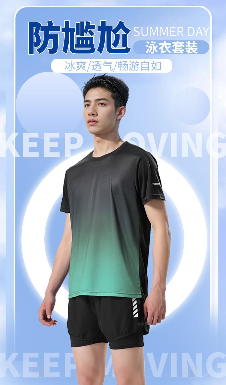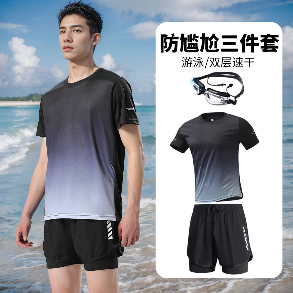 • 블랙 앤 그레이 그라데이션 반팔 + 수영 트렁크 + 수영 모자