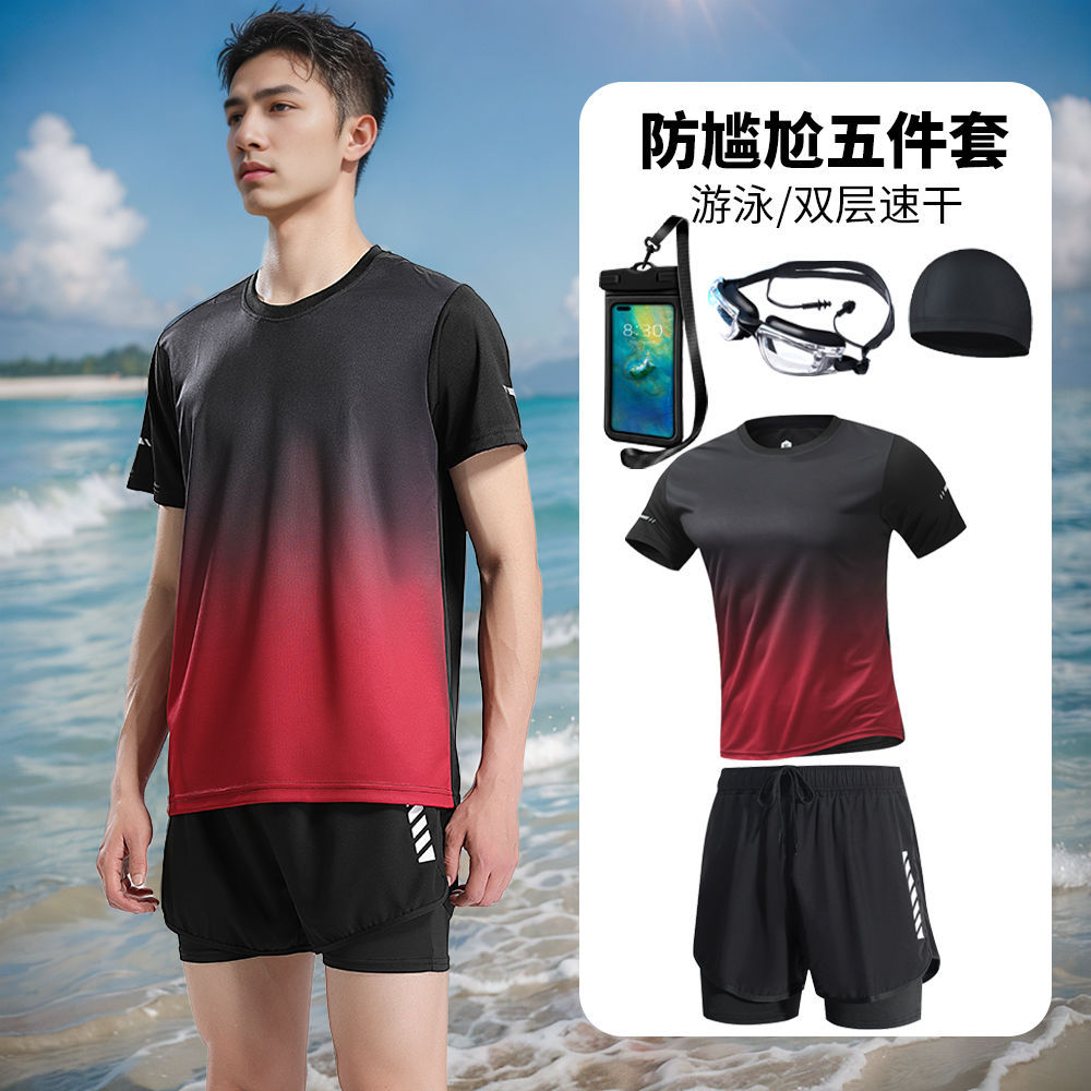 • 검정과 빨강 그라데이션 반팔 + 수영 트렁크 + 수영 모자 + 수영 고글