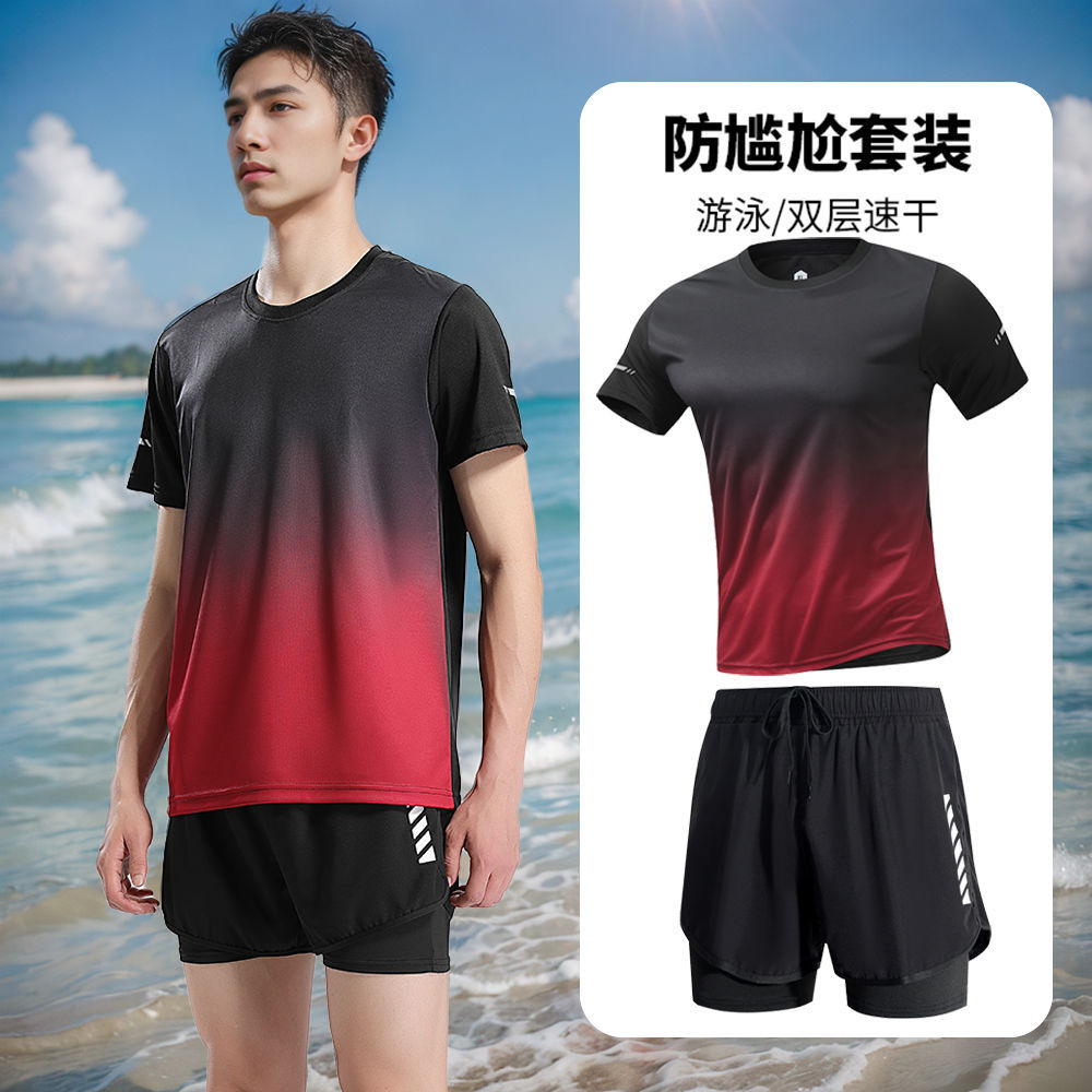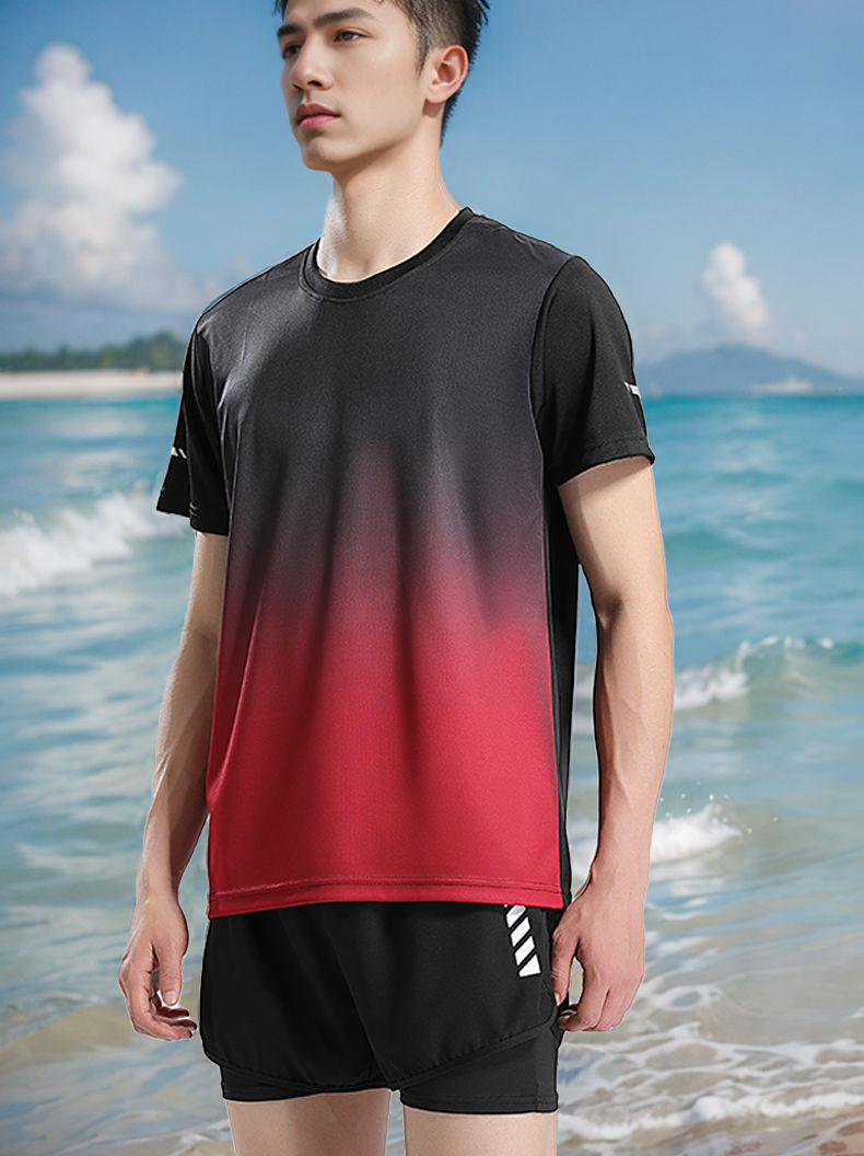 • 검정과 빨강 그라데이션 반팔 + 수영 트렁크