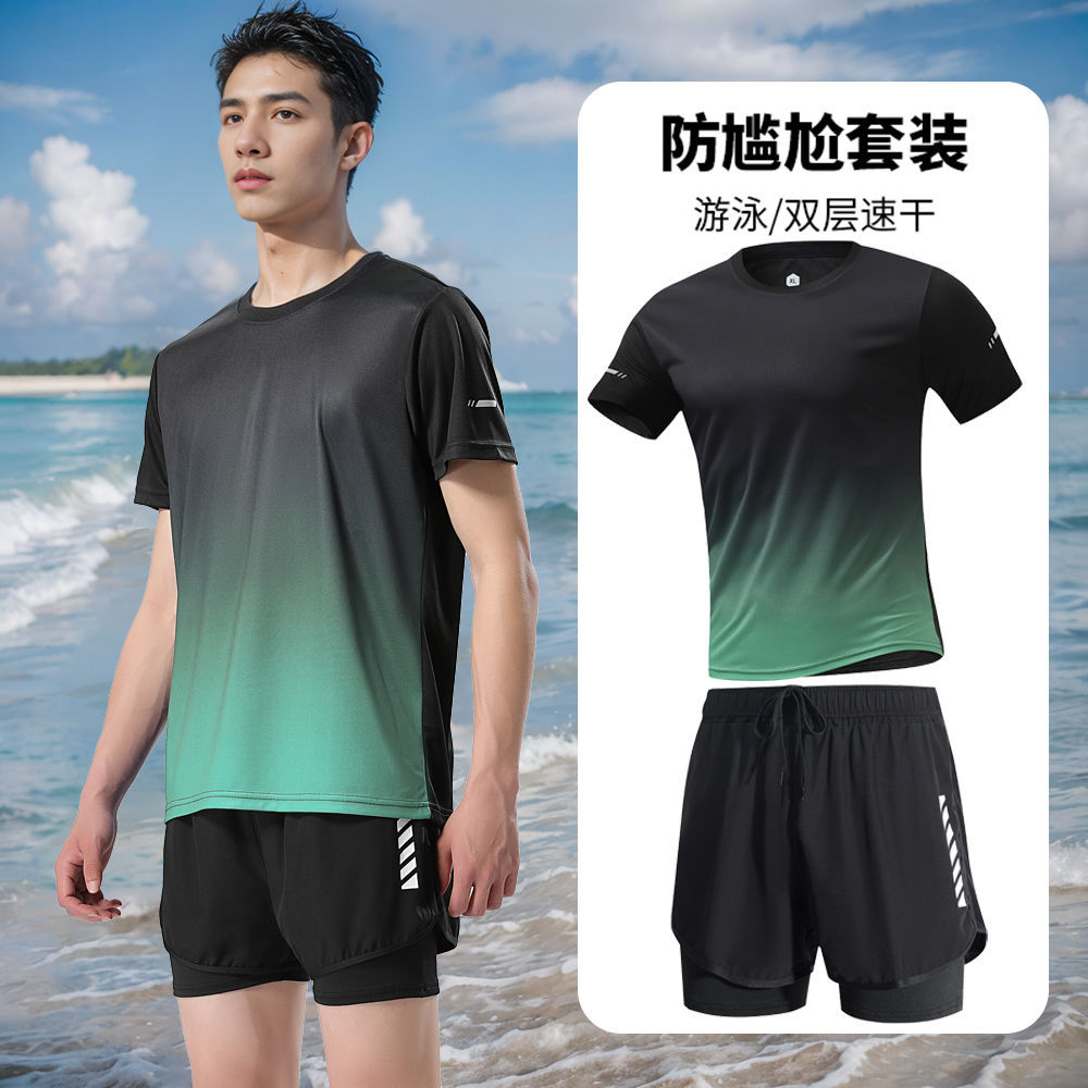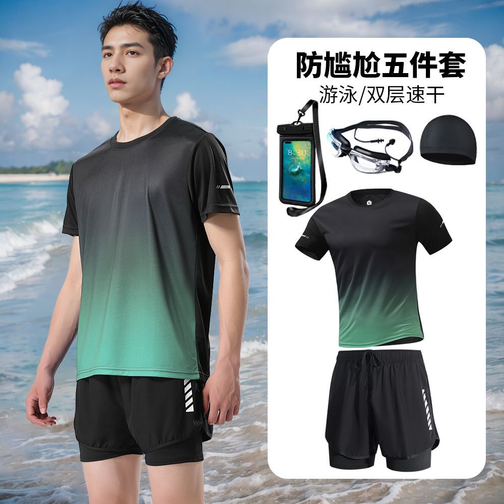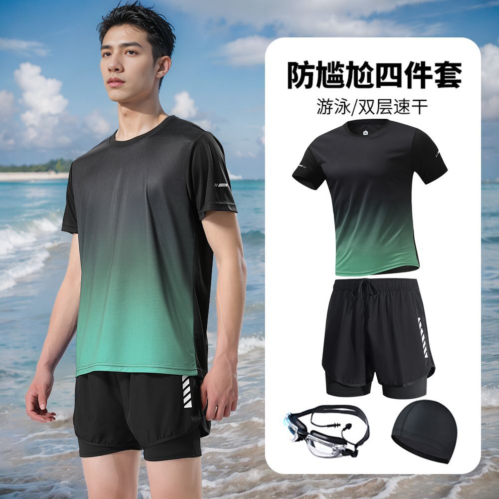 • 블랙 & 그린 그라데이션 반팔 + 수영 트렁크 + 수영 모자 + 수영 고글