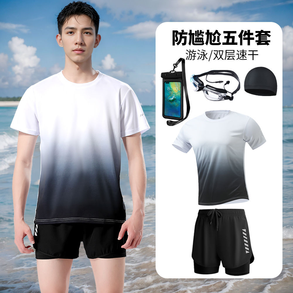• 흰색과 검정색 그라데이션 반팔 + 수영 트렁크 + 수영 모자 + 수영 고글
