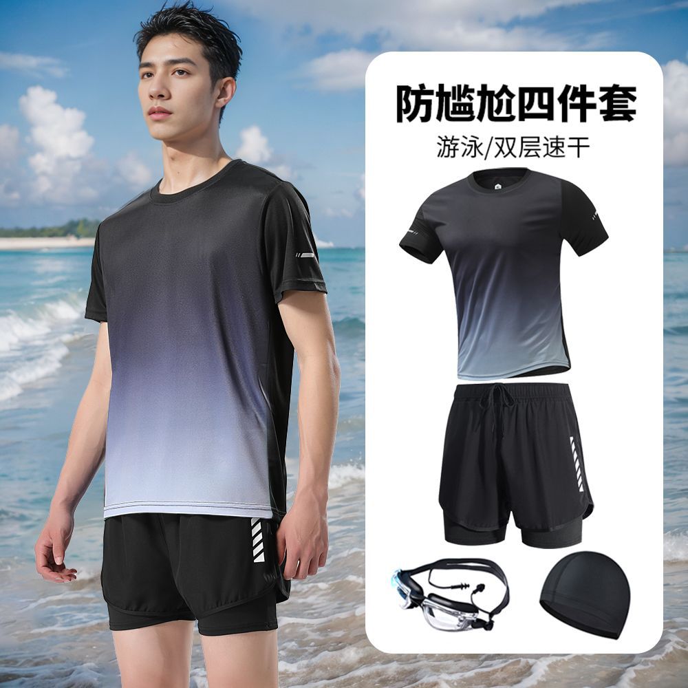 • 블랙 앤 그레이 그라데이션 반팔 + 수영 트렁크 + 수영 모자 + 수영 고글