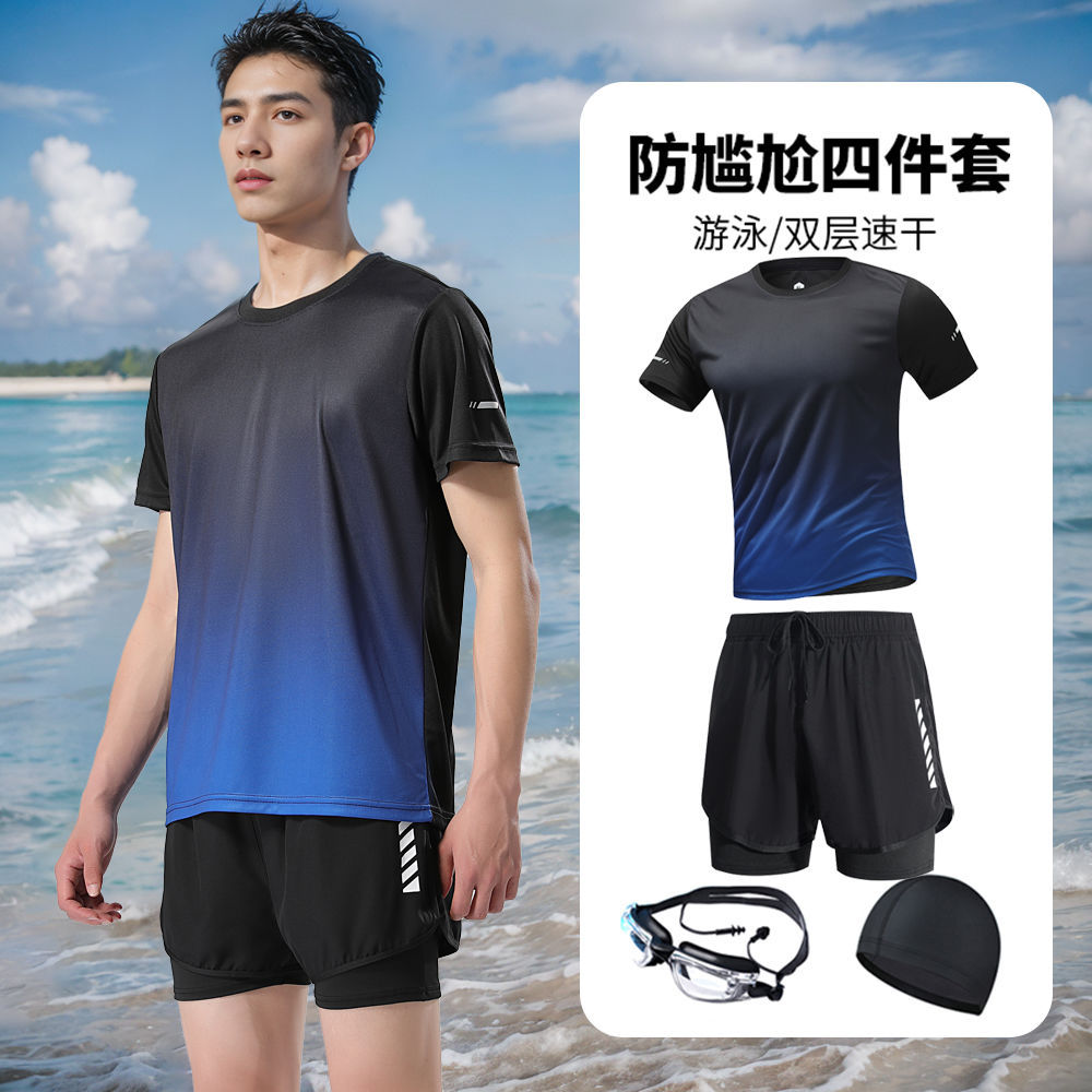 • 검정색과 파란색 그라데이션 반팔 + 수영 트렁크 + 수영 모자 + 수영 고글
