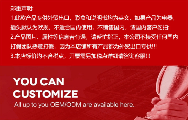 1. 此款产品专供外贸出口,彩盒和说明书均为英文,如果产品为电器,插头默认为欧规,