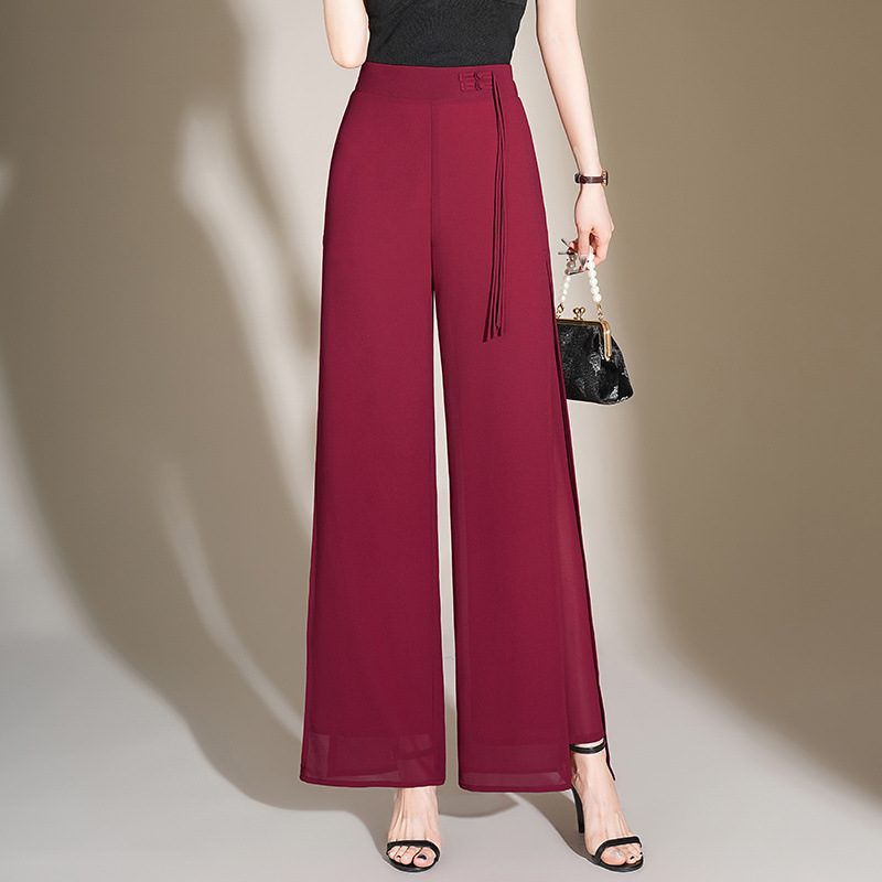 2024 새로운 여름 스타일 중국 스타일 쉬폰 와이드 레그 팬츠 여성 바지 슬릿 드레이프 9 점 캐주얼 스트레이트 팬츠 여성 스커트