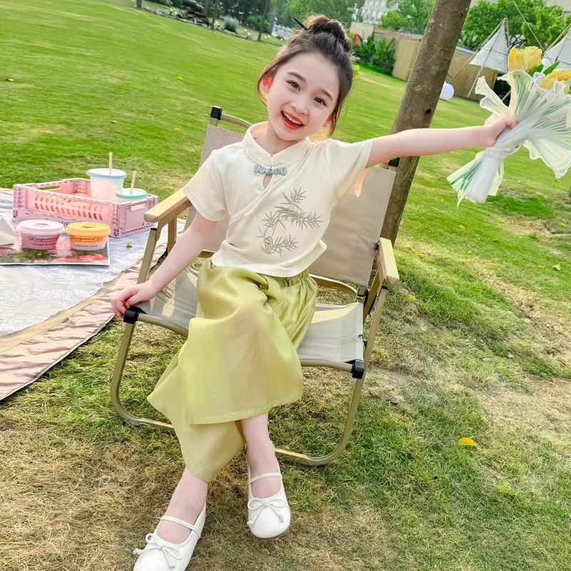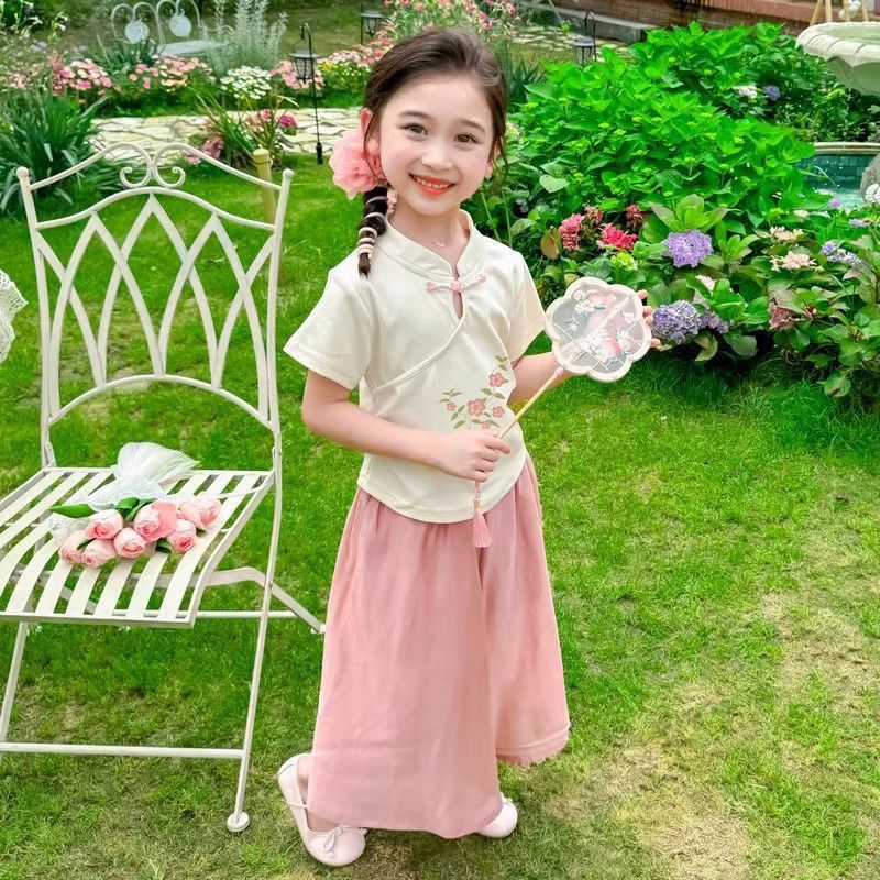 여아 신중국 스타일 정장 2025 여름 신작 중대형 아동 유행 스타일 국산 패션 스타일 버튼 반팔 캐주얼 투피스 세트