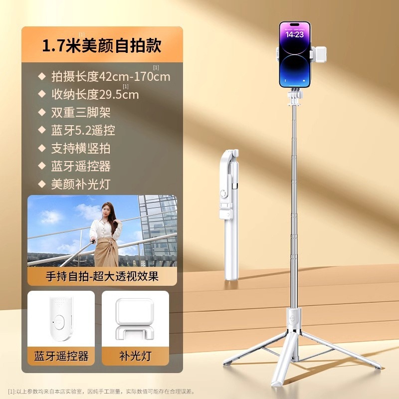 • 1.7m 화이트 [일체형 접이식 + 이중 안정 삼각대 지지대] + 15m 블루투스 리모콘.