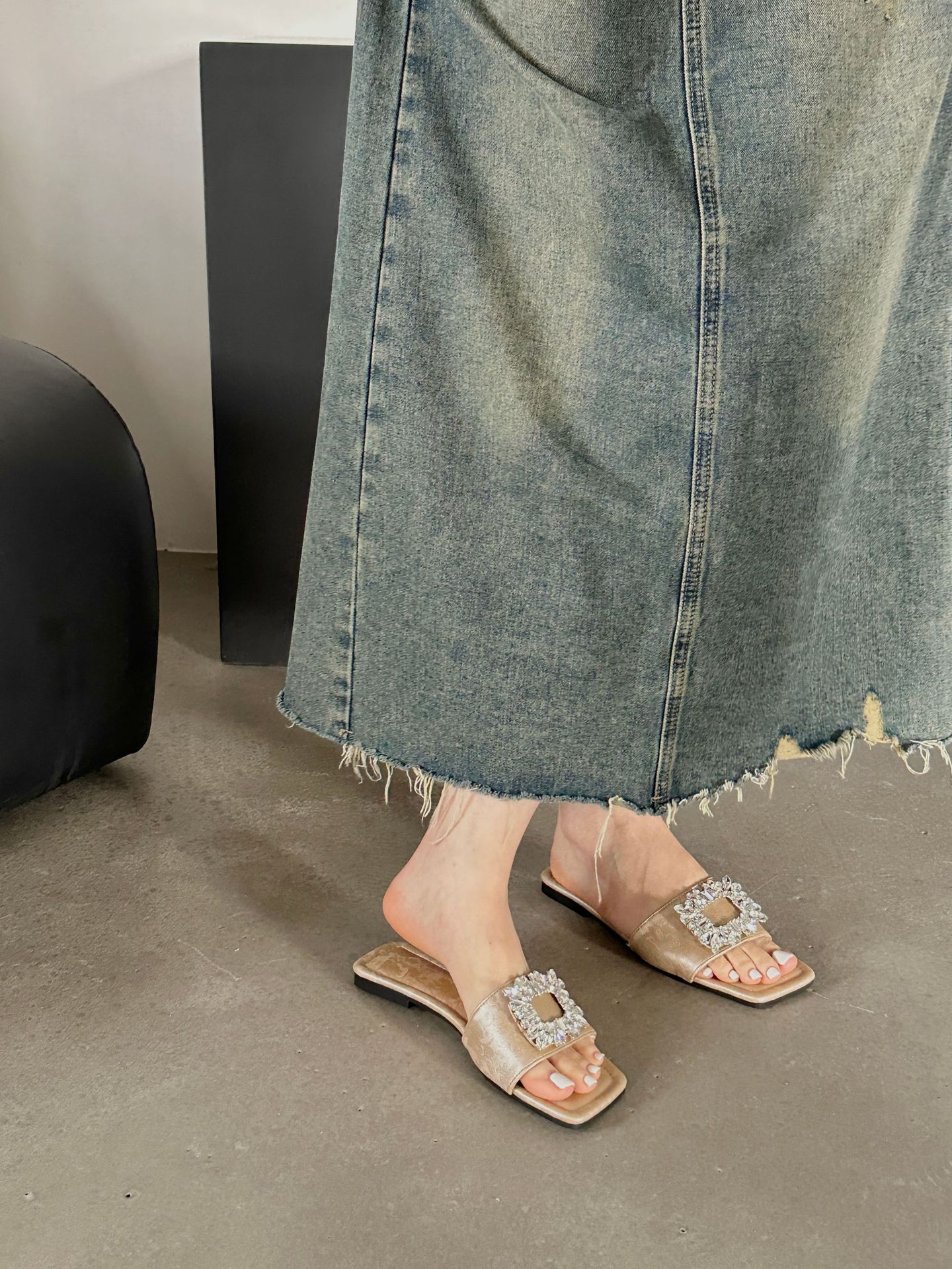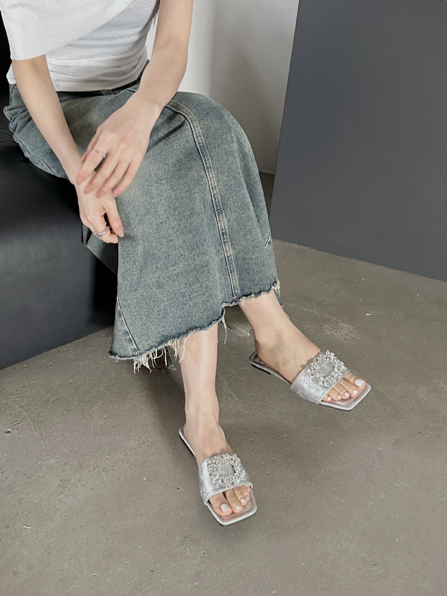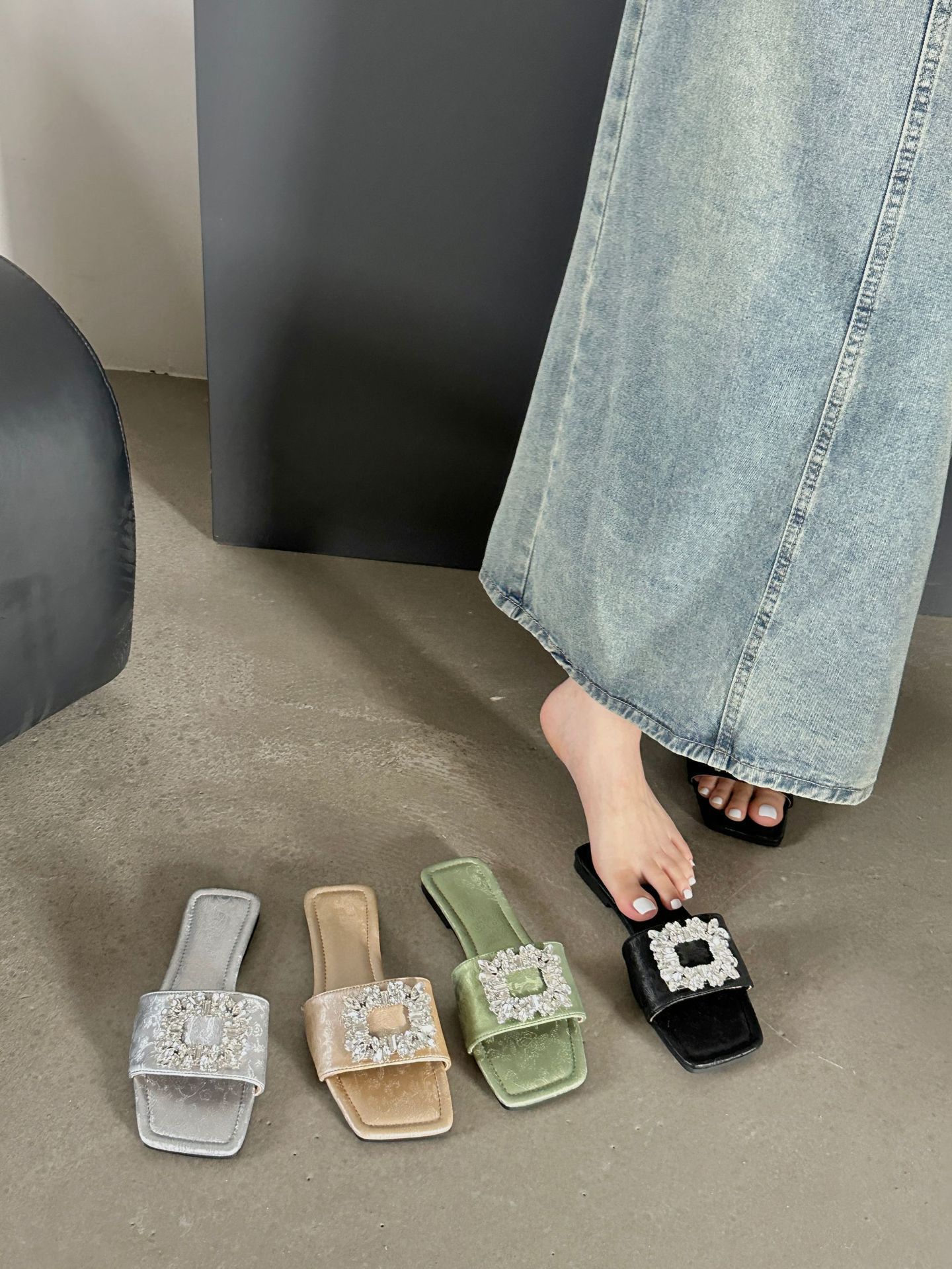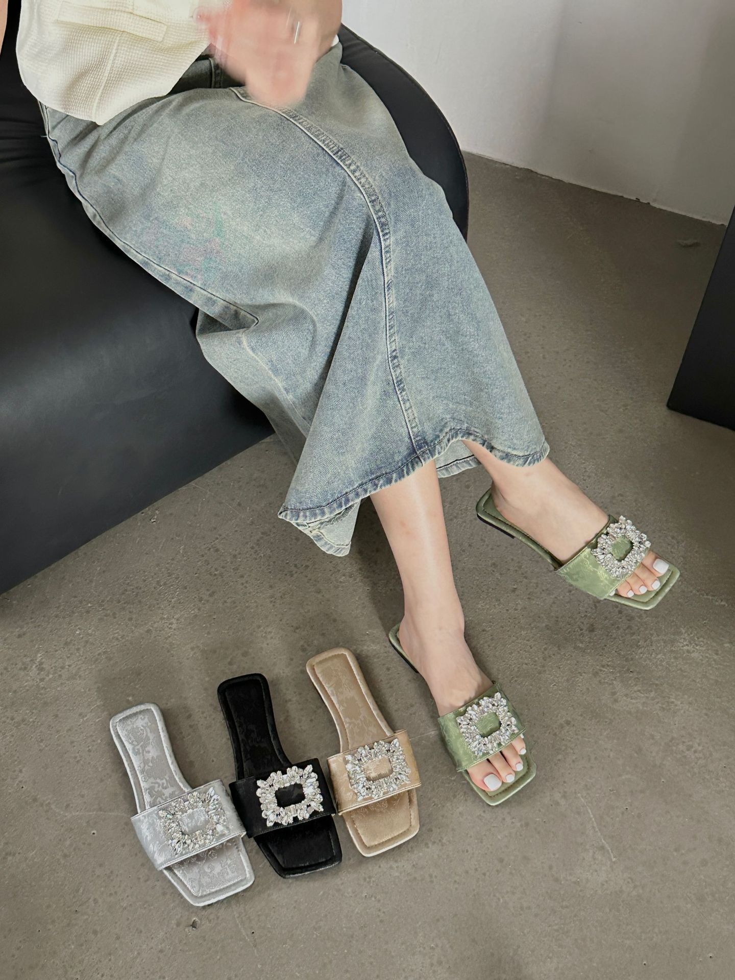 1938-9 ~ 평면 프랑스 모조 다이아몬드 사각형 머리 오픈 발가락 샌들 여성 착용 2024 년 여름 새