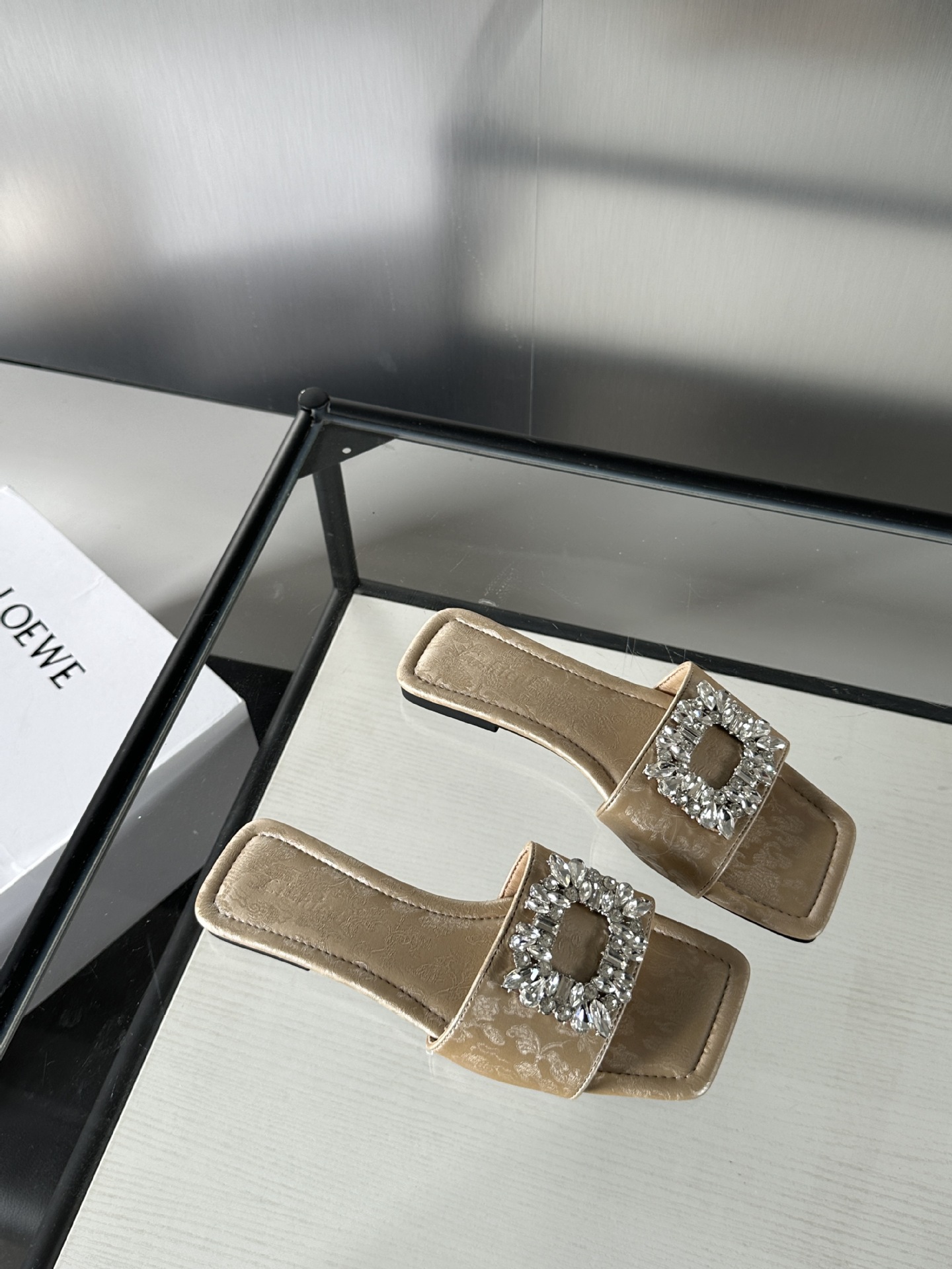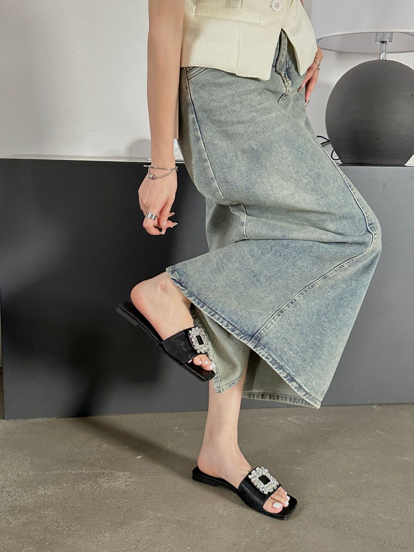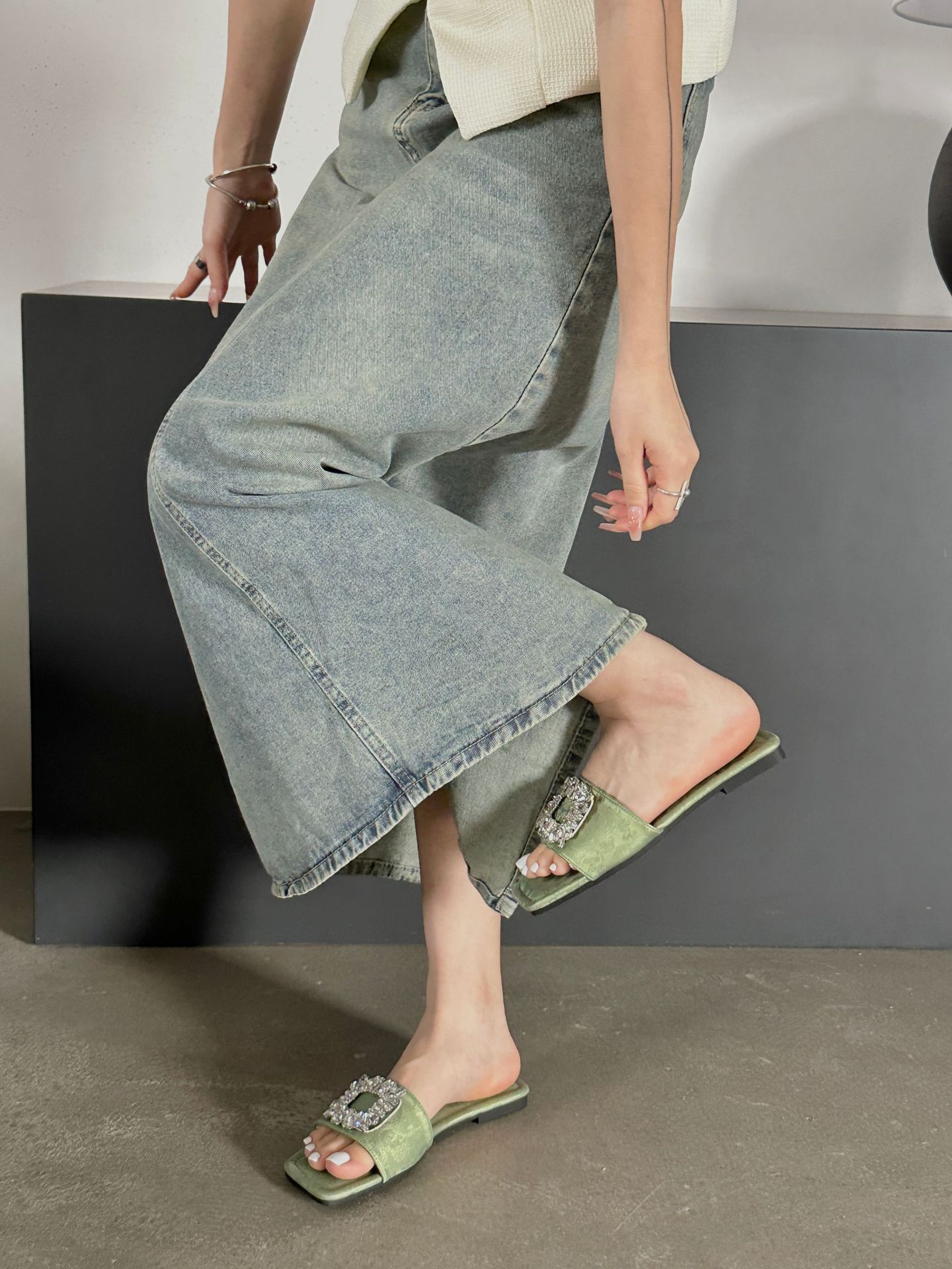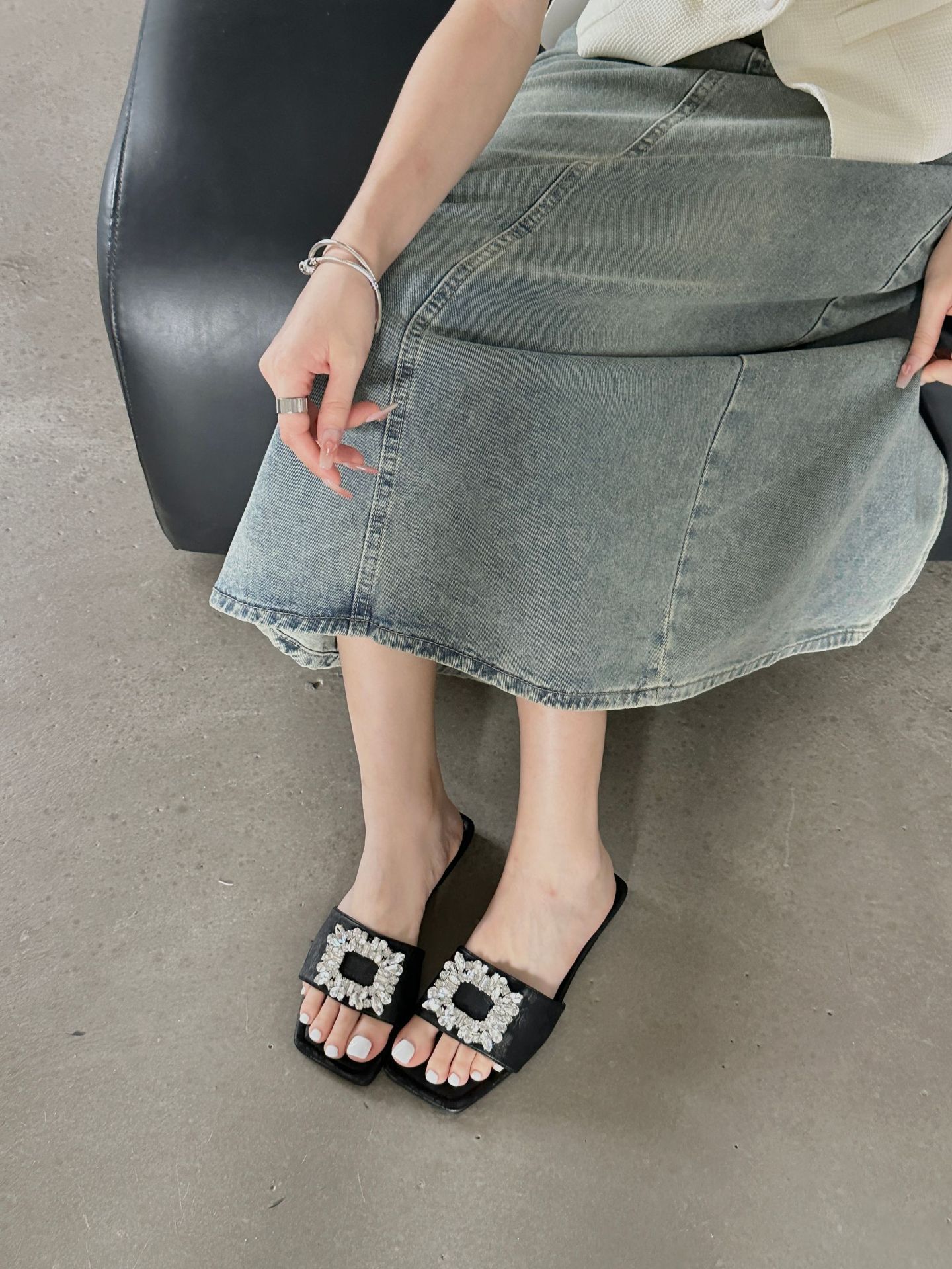 1938-9 ~ 평면 프랑스 모조 다이아몬드 사각형 머리 오픈 발가락 샌들 여성 착용 2024 년 여름 새