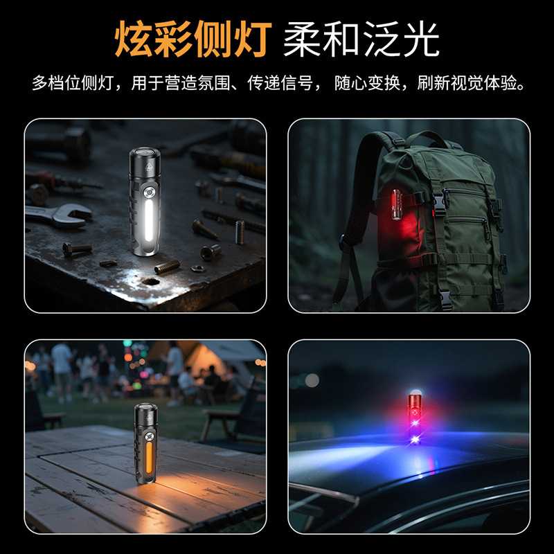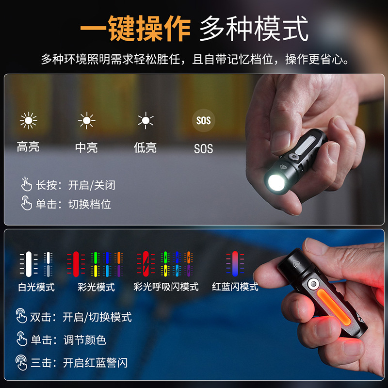 白光长亮状态,双击切换模式,RGB彩光(单击切换:红-绿-蓝-橙-黄-青-紫)-彩光呼吸闪(单击切换:红-绿-蓝-橙-黄-青-紫)。三击红蓝对闪
