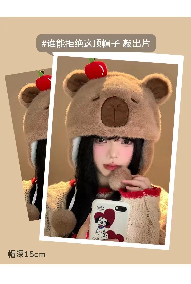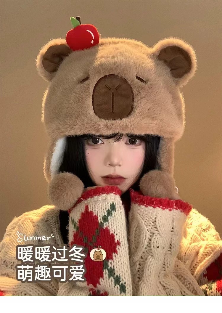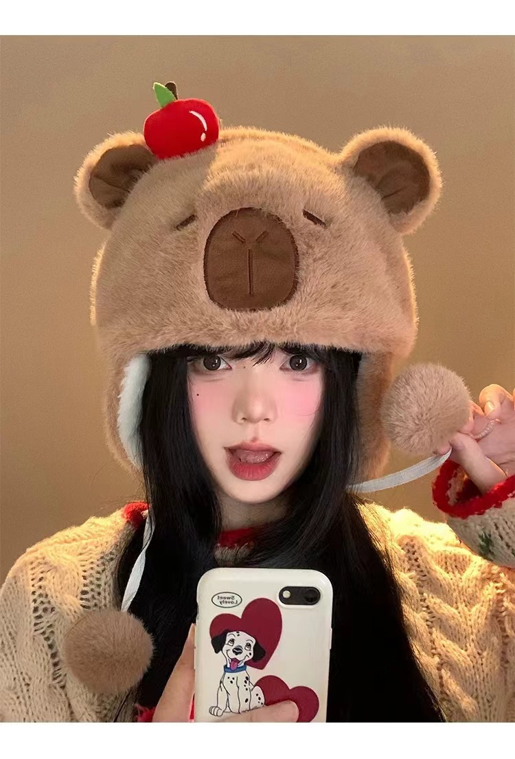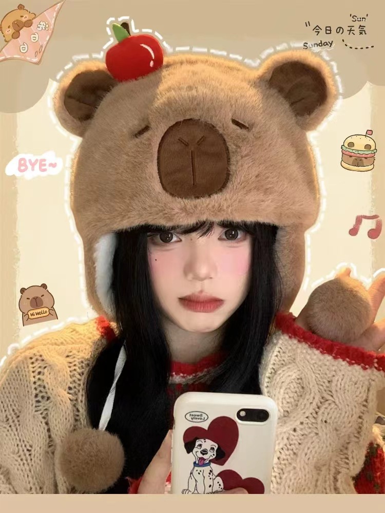 가을과 겨울 사이클링을위한 여성용 귀여운 만화 Kapibara 플러시 모자, 방한 모피 따뜻한 귀 보호 후드, Lei Feng 모자스토어 가기