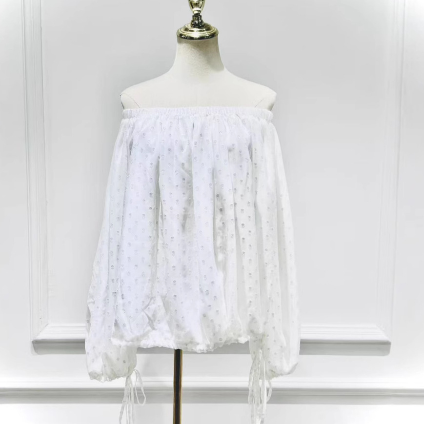 한국 달콤한 폴카 도트 귀 모양의 원라인 칼라 쉬폰 랜턴 슬리브 셔츠 2025 봄 여름 프렌치 긴팔 탑스토어 가기