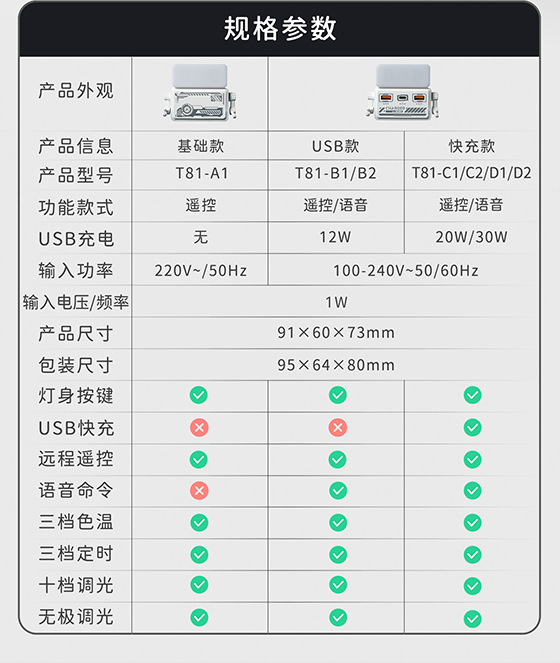 产品型号:T81-A1(夜灯款)\T81-B1(遥控款-12WUSB款)\T81-B2(语音款-12WUSB款)\T81-C1(遥控款-20W快充)\T81-C2(语音款-20W快充)\T81-D1(遥控款-30W快充)\T81-D2(语音款-30W快充)