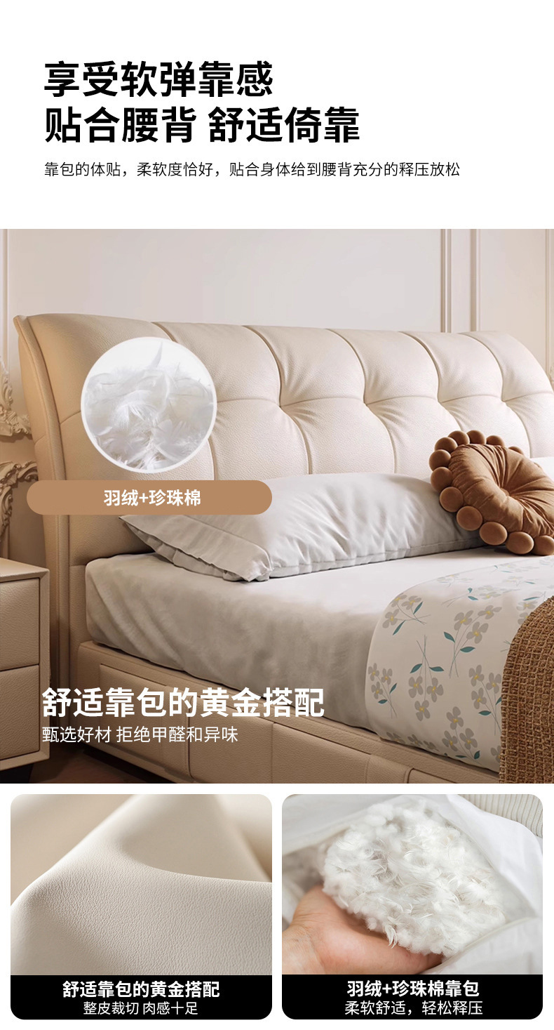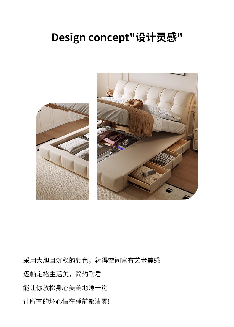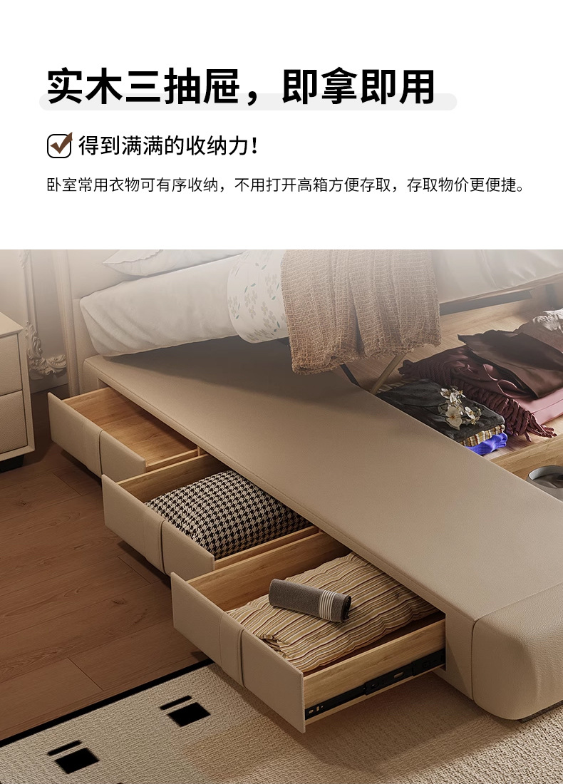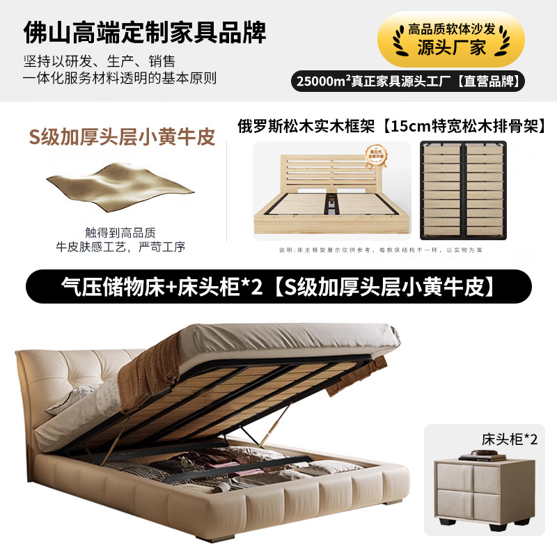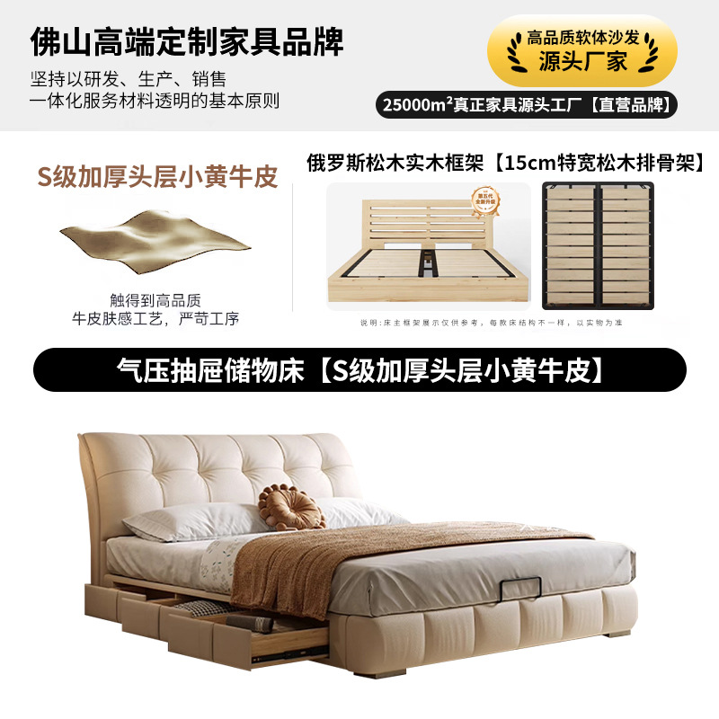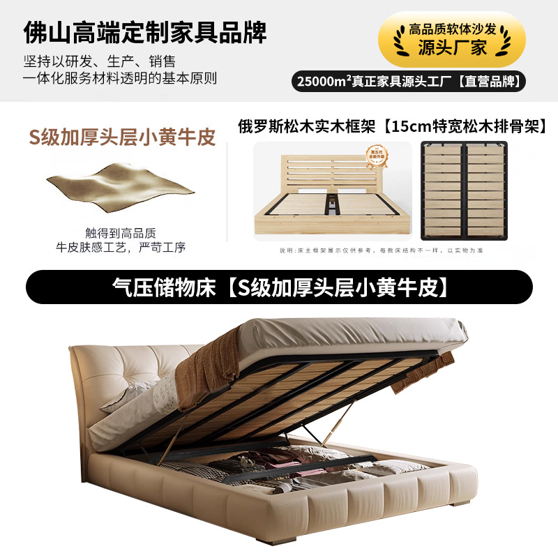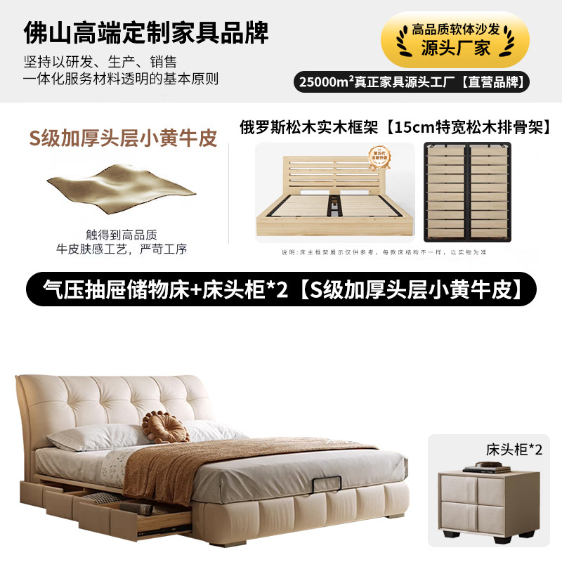모던 라이트 럭셔리 고급 가죽 침대, 더블 사이즈, 1.8m 서랍 수납, 하이박스 수납, 플로어형 고급 침실용 침대