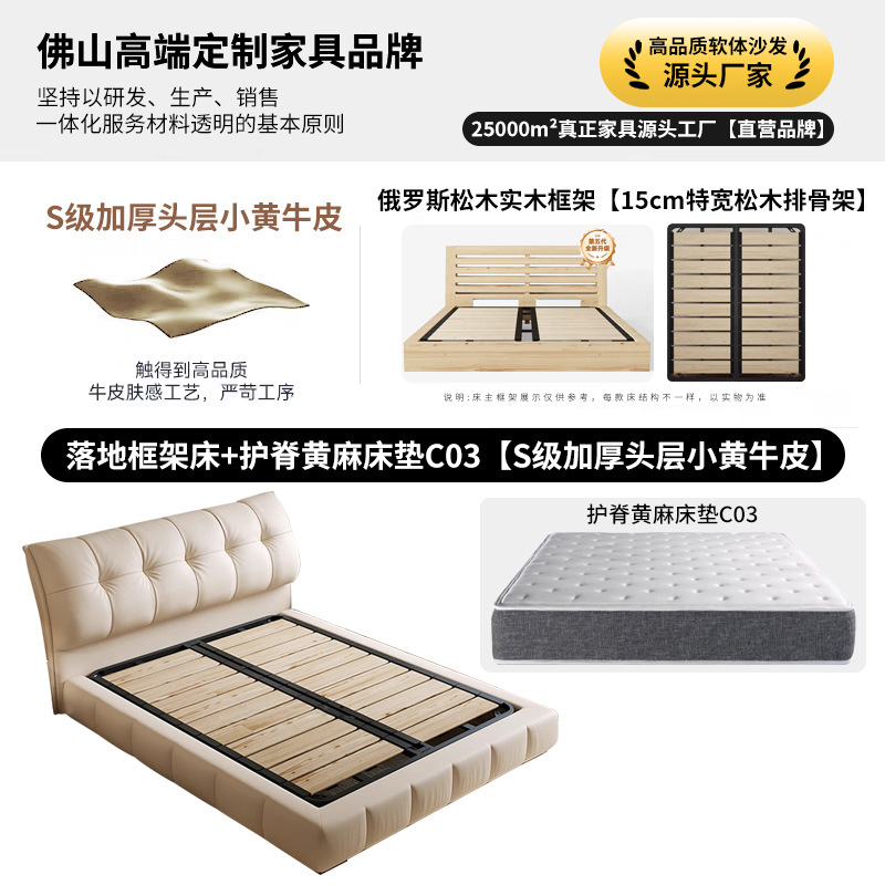 • S급 1층 소형 노란색 소가죽 침대 + 척추 보호 황마 매트리스 [바닥 - 특대 15cm 소나무 프레임]