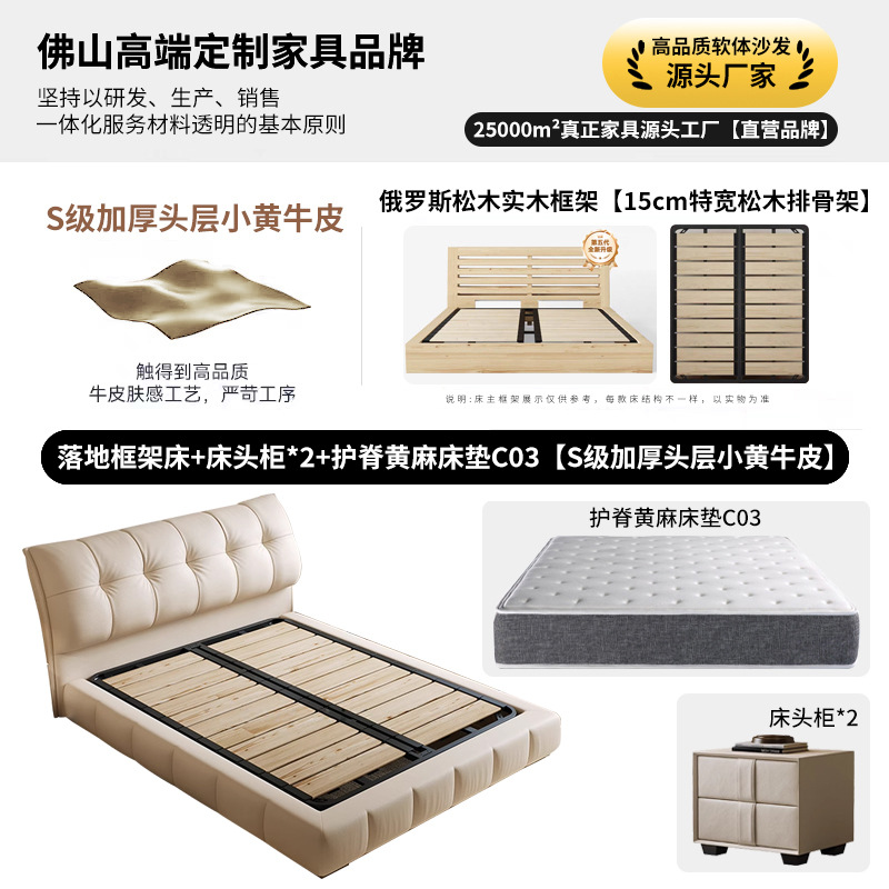 • S급 1층 소형 노란색 소가죽 침대 + 수납장 2개 + 척추 보호 황마 매트리스 [바닥 - 특폭 15cm 소나무 프레임]