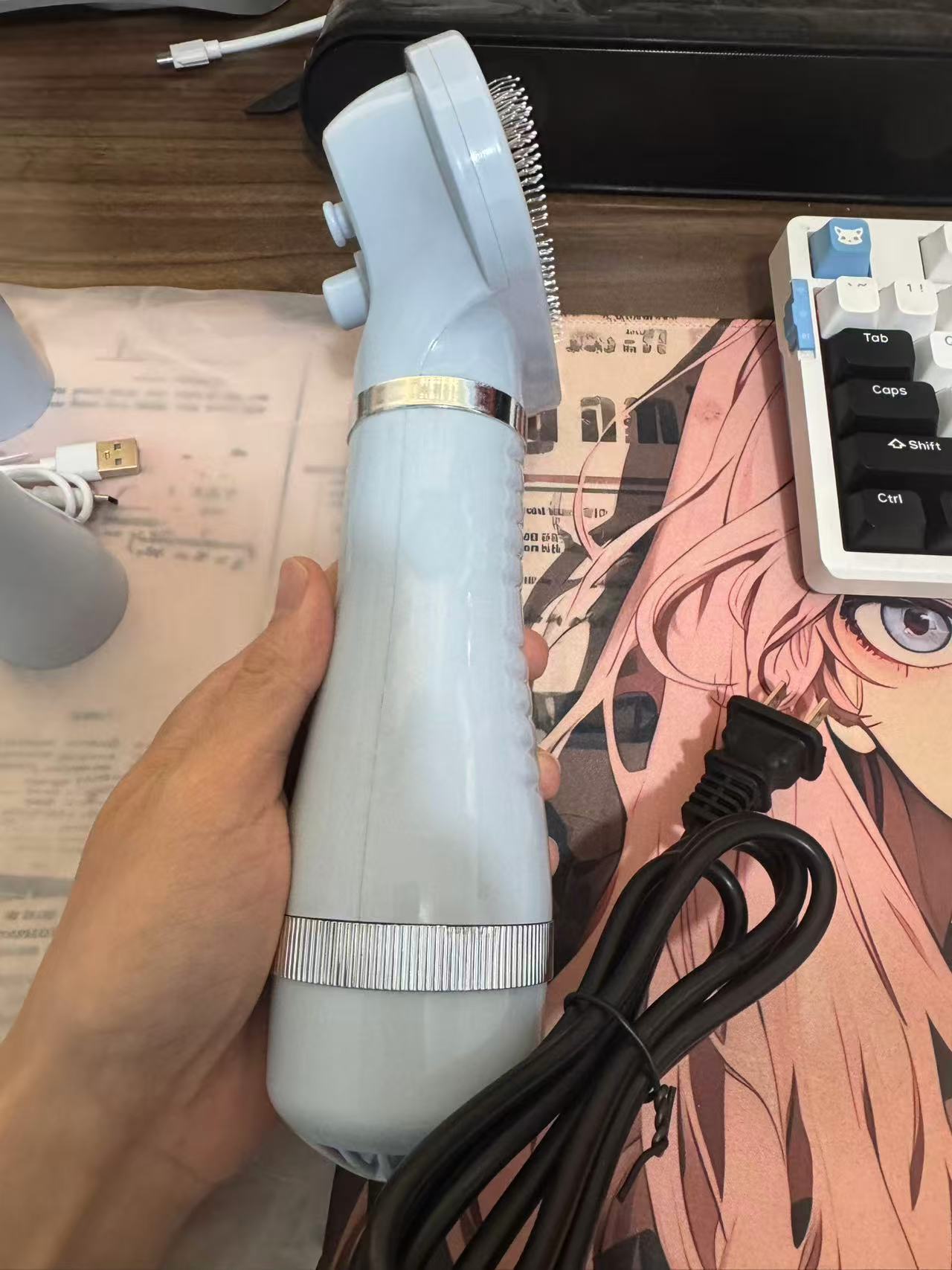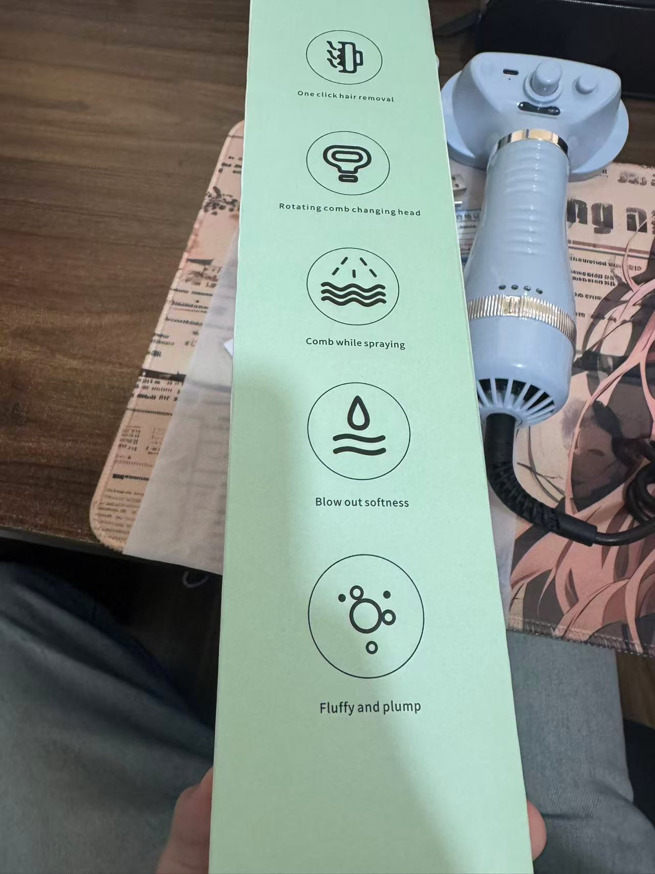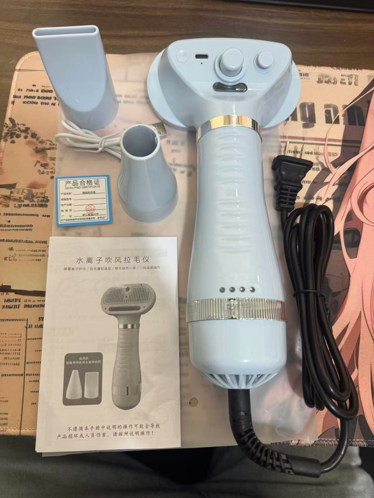 【产品参数】电源线1.5m,三档温控,过热保护,喷雾护毛,50dB低噪运行,一键除毛,可拆卸梳头(一机两用),一机六用(喷雾护毛,吹干,造型,按摩,梳毛,除毛),喷雾充电tpye-c,CE,Fcc,UL,认证齐全