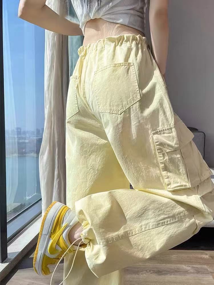 봄 여름 여성용 밀크 옐로우 아메리칸 레깅스 오버올, 키가 큰 사람들을 위한 유럽 스타일, 루즈하고 슬림한 와이드 레그 하이킹 팬츠스토어 가기