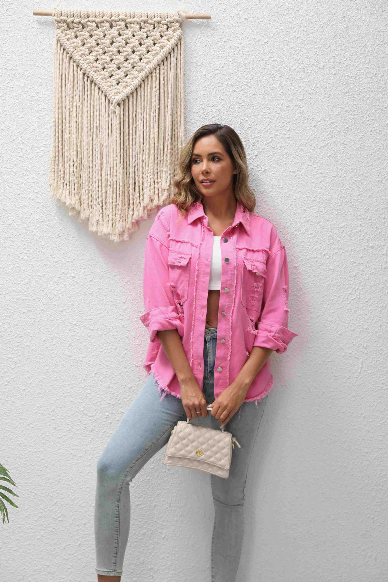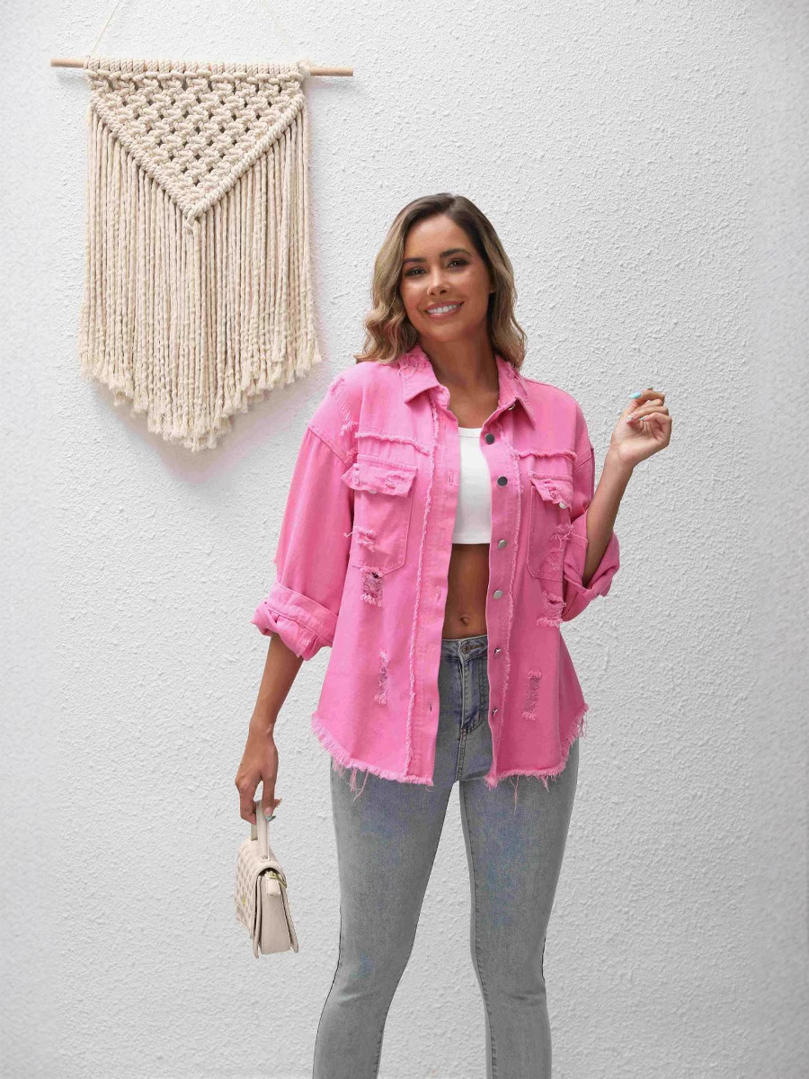 국경 유럽과 미국의 데님 재킷 여성 핑크 느슨한 데님 찢어진 재킷 플러스 사이즈 여성 긴팔 데님 재킷