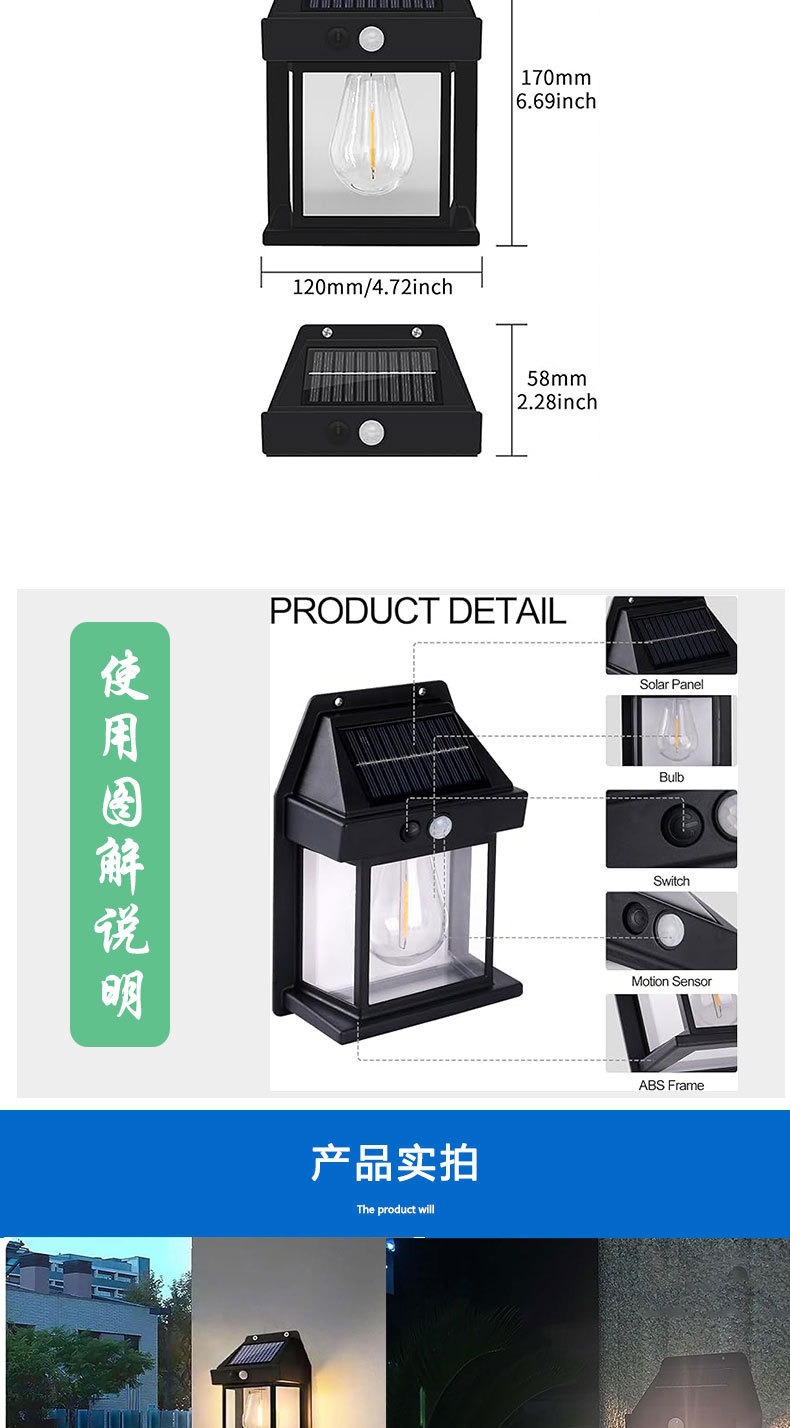 太阳能壁灯 太阳能钨丝壁灯 太阳能人体感应壁灯 太阳能钨丝灯户外庭院灯 人体感应三模式户外庭院灯 太阳能钨丝挂壁灯