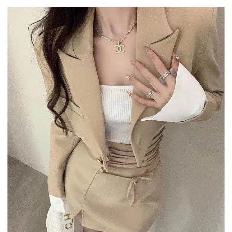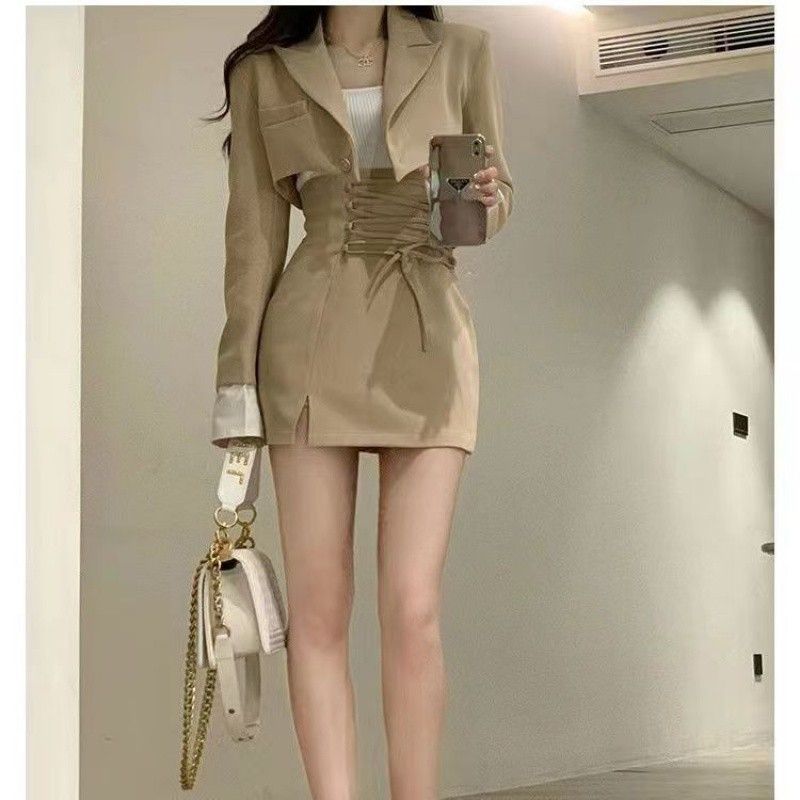 여성을위한 세련된 짧은 정장 재킷 2025 초가을 새로운 허리 틈새 디자인 뜨거운 소녀 짧은 치마 투피스 양복