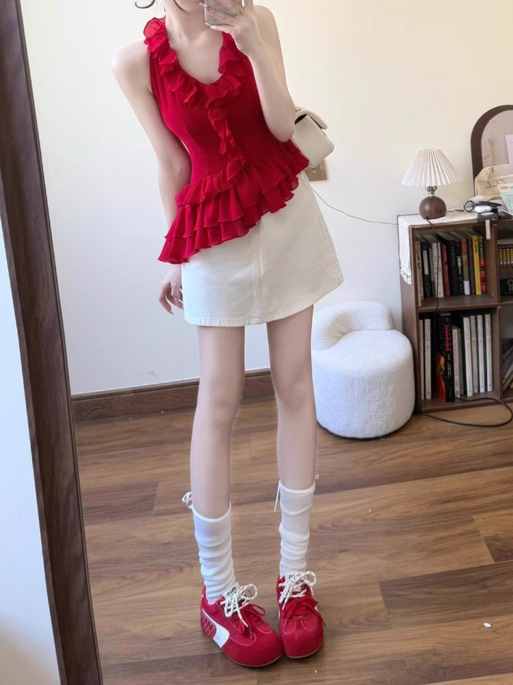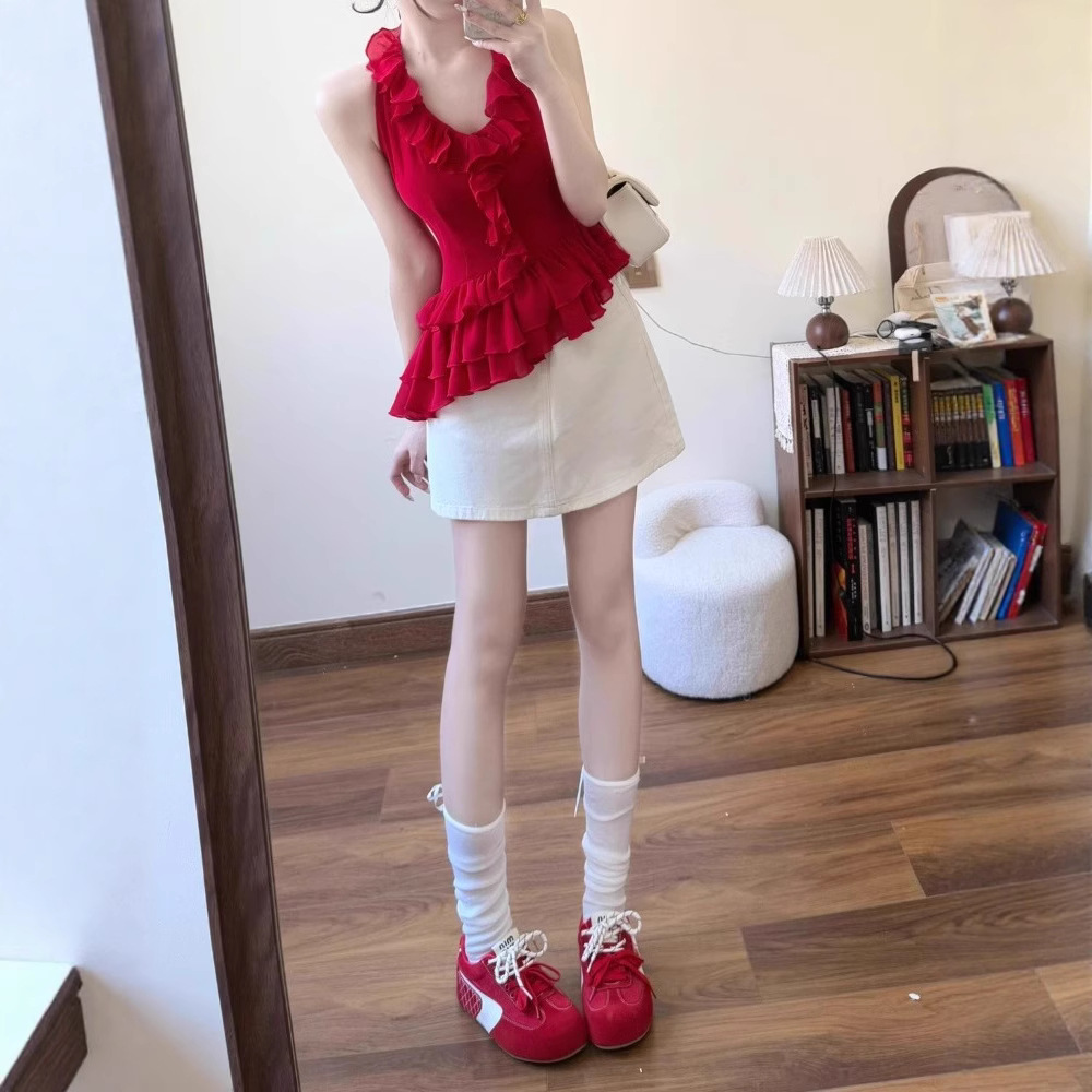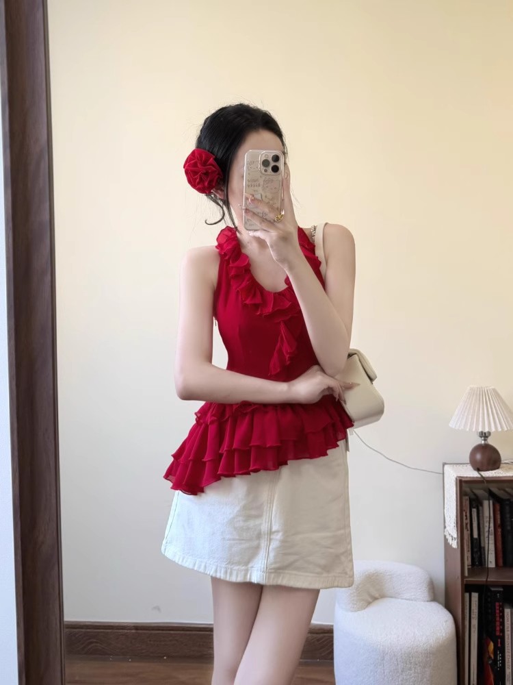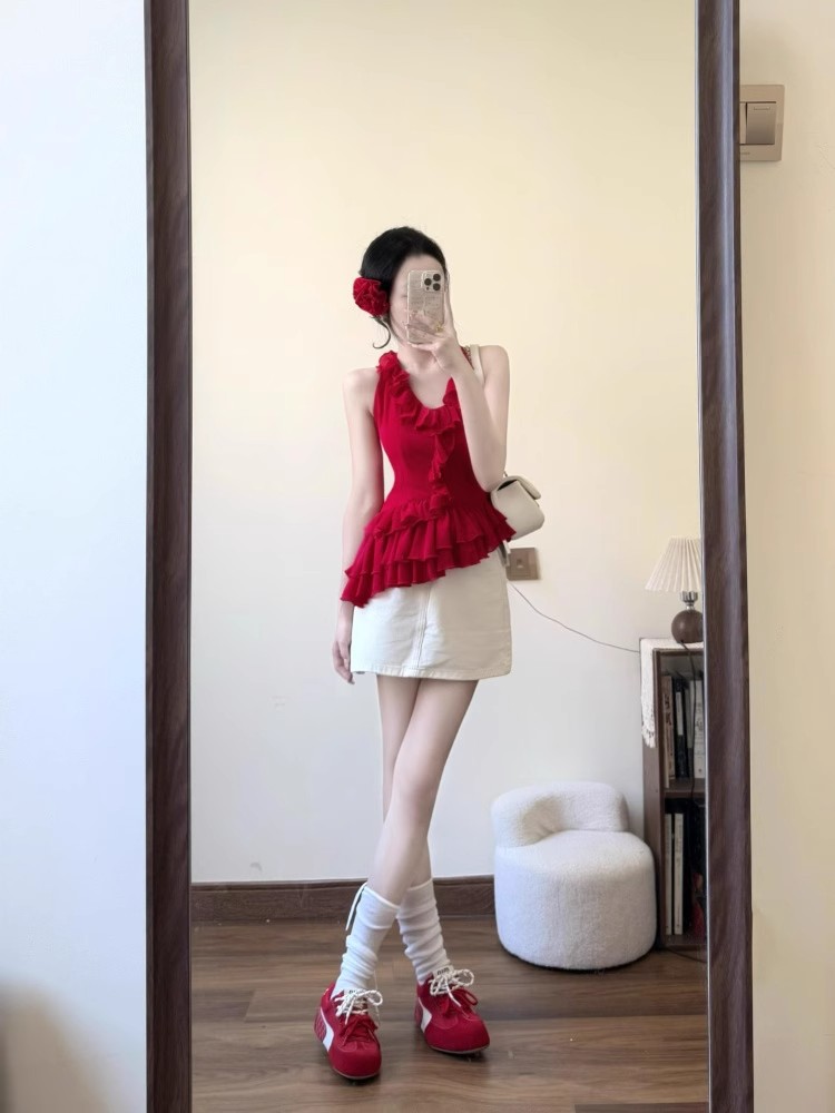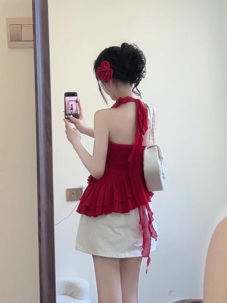 여름 아우터로 입기 좋은 여성을 위한 매우 멋진 홀터넥 러플 레드 캐미솔, 독특하고 시크한 슬림 핫걸 탑 트렌디스토어 가기