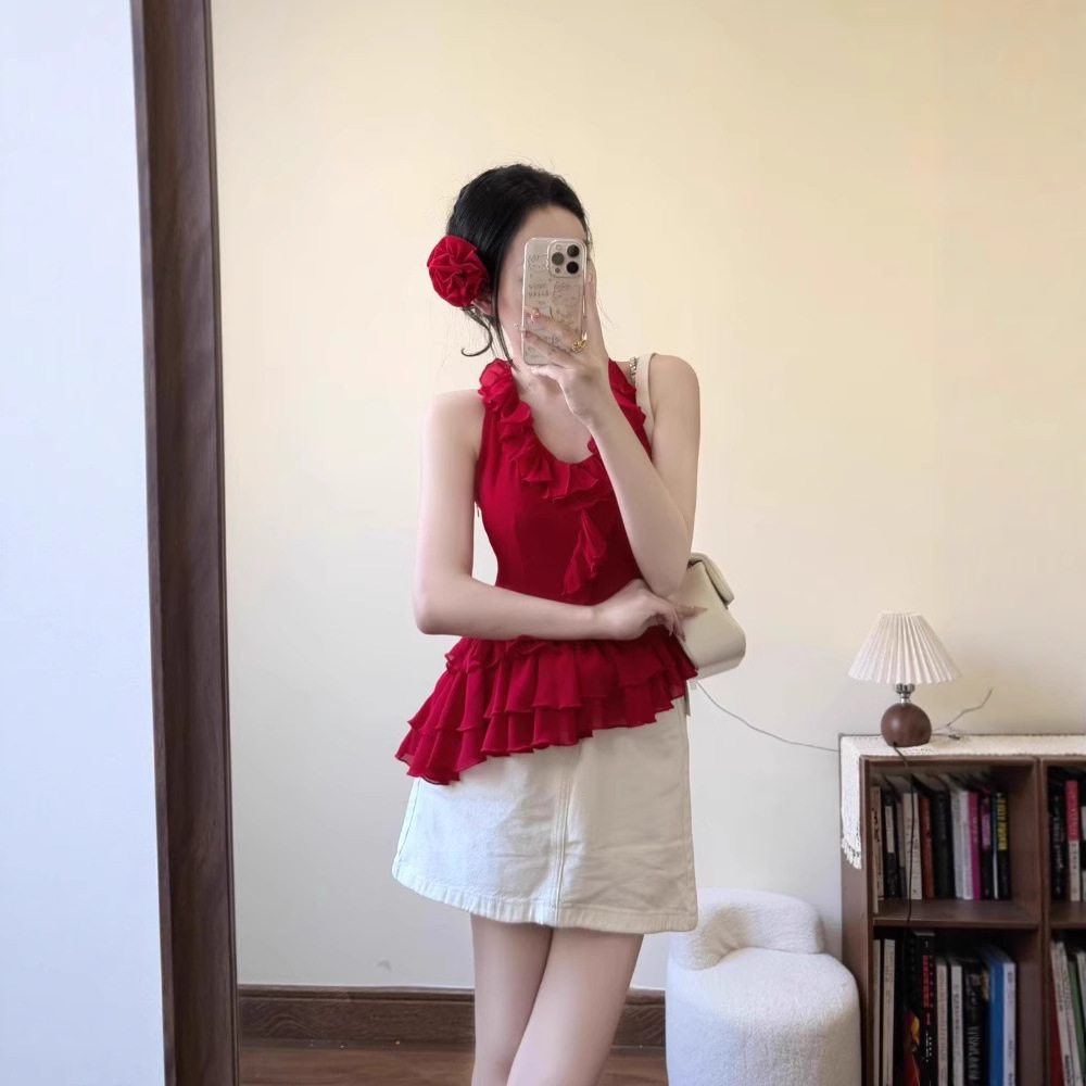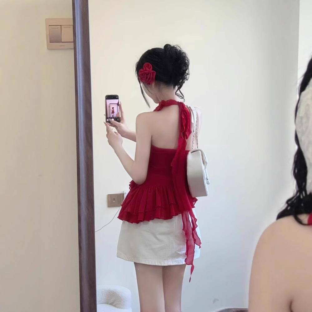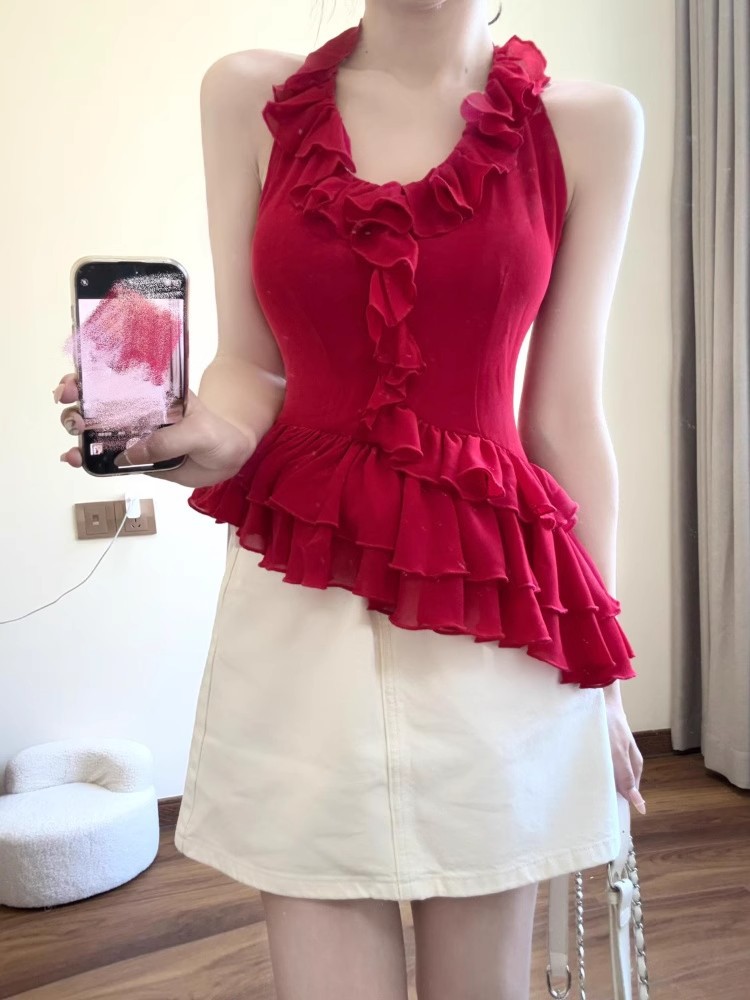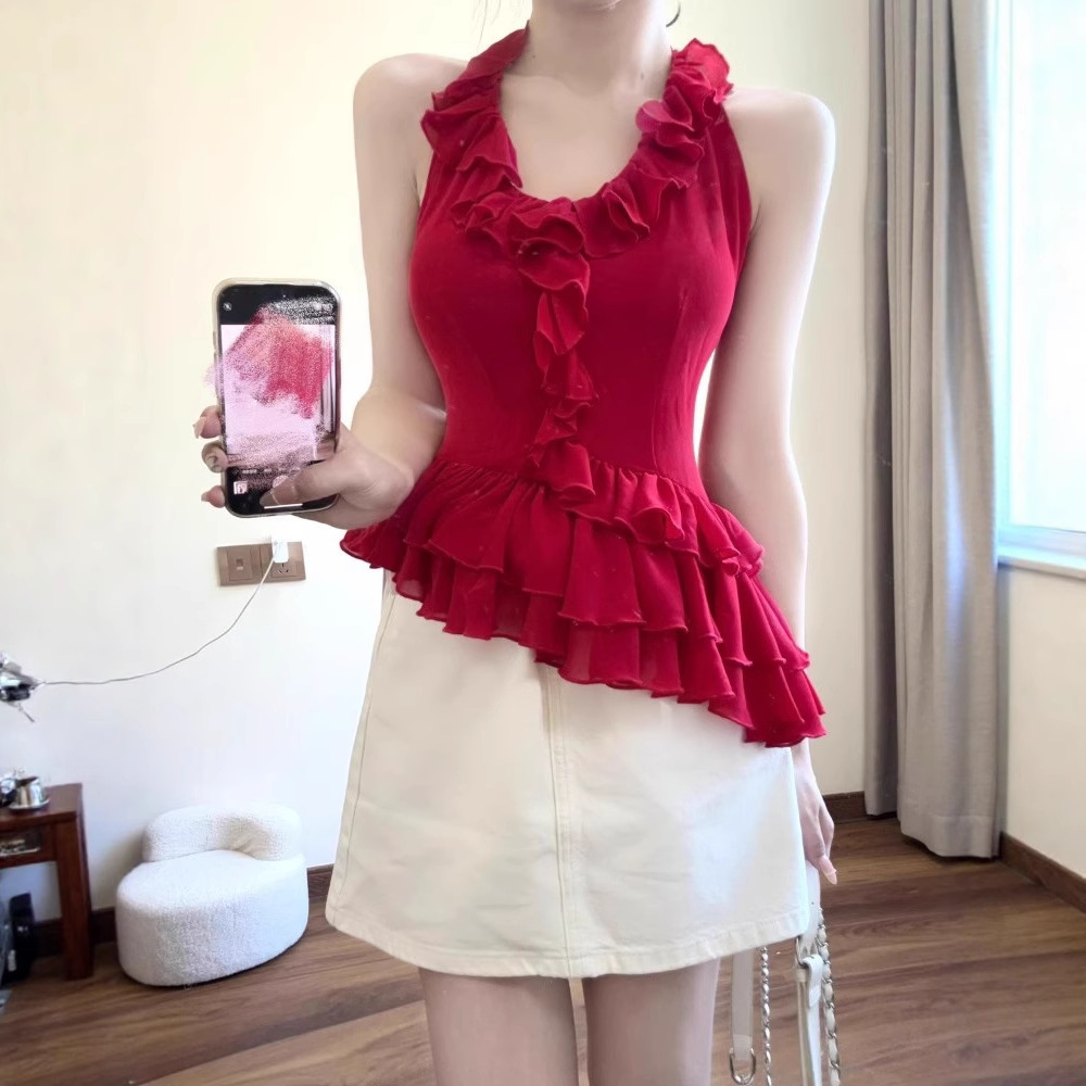 여름 아우터로 입기 좋은 여성을 위한 매우 멋진 홀터넥 러플 레드 캐미솔, 독특하고 시크한 슬림 핫걸 탑 트렌디