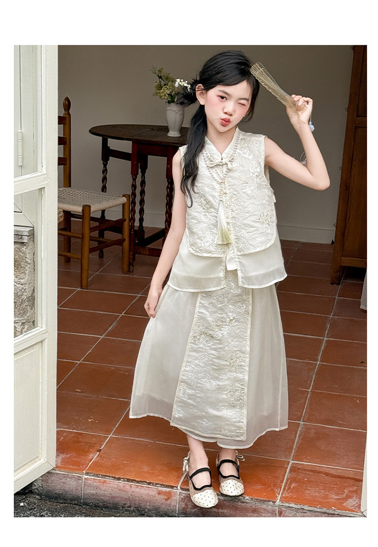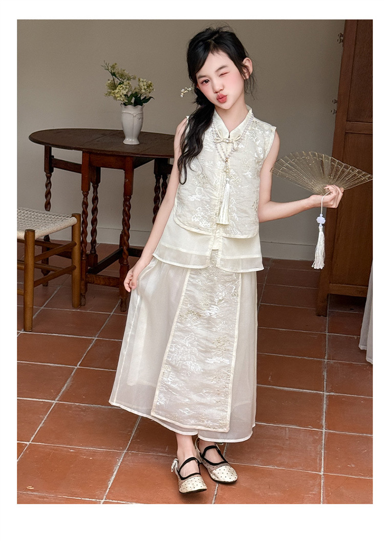 여름 중국 스타일 여아용 새로운 중국 스타일 양복 2025 새로운 큰 어린이 고대 스타일 Hanfu 조끼 스커트 라이트 럭셔리 양복