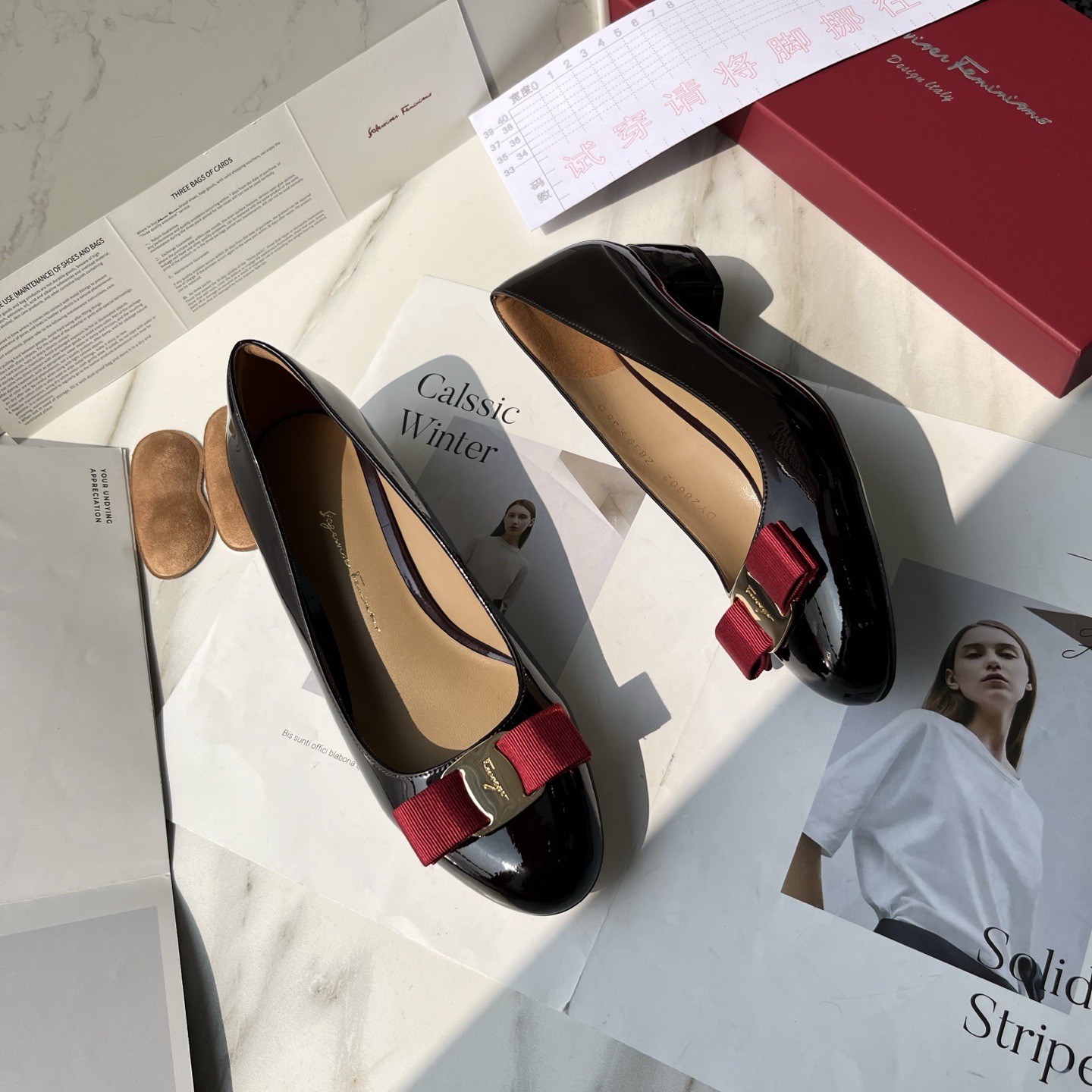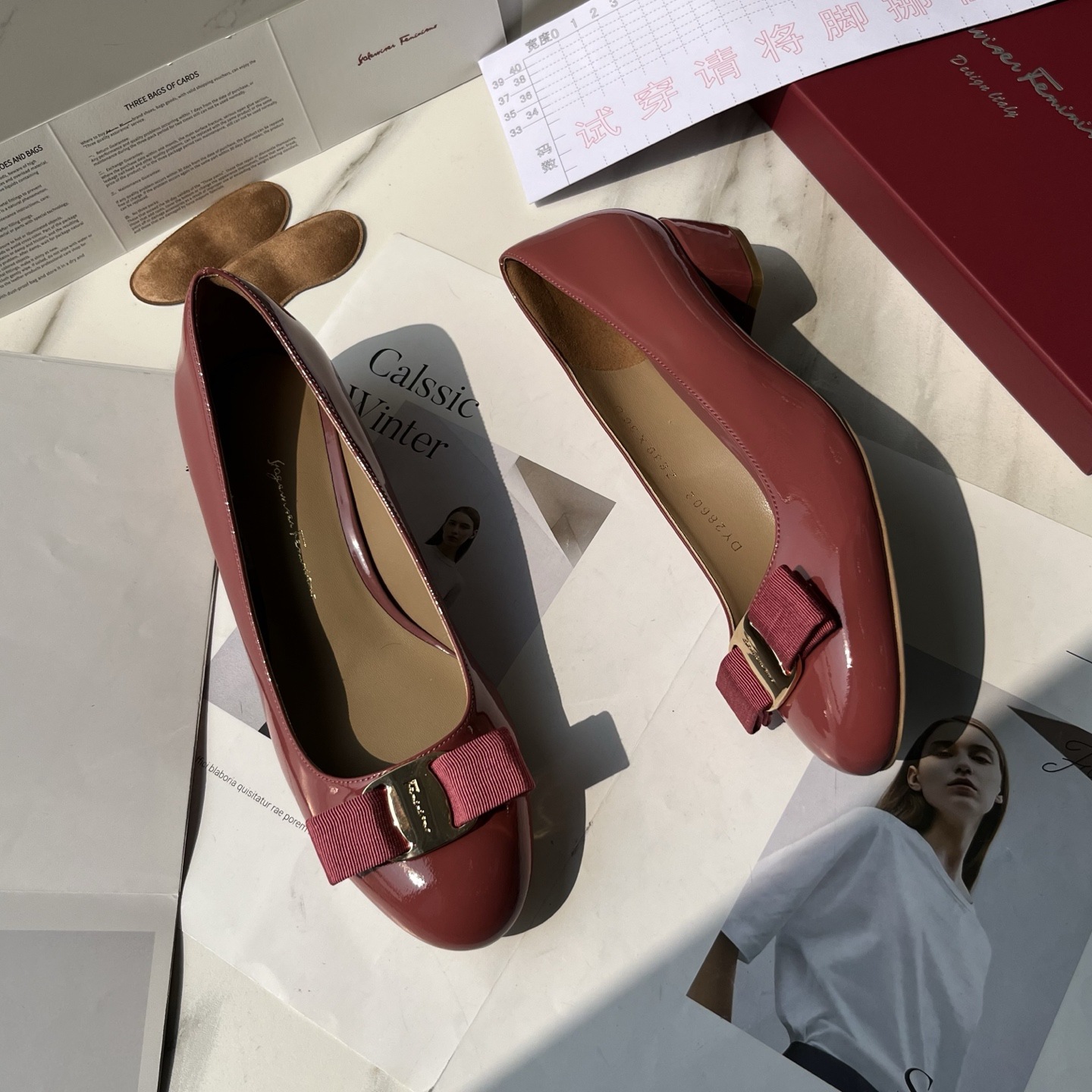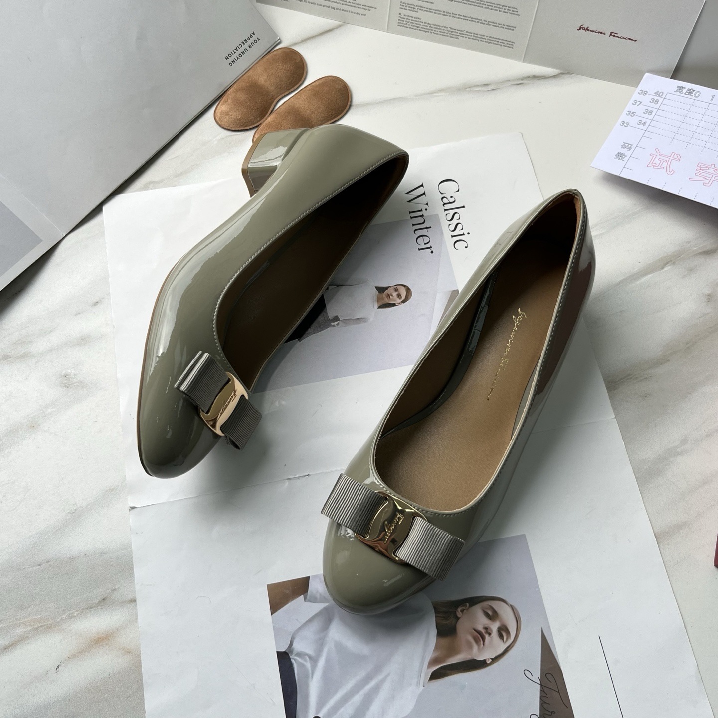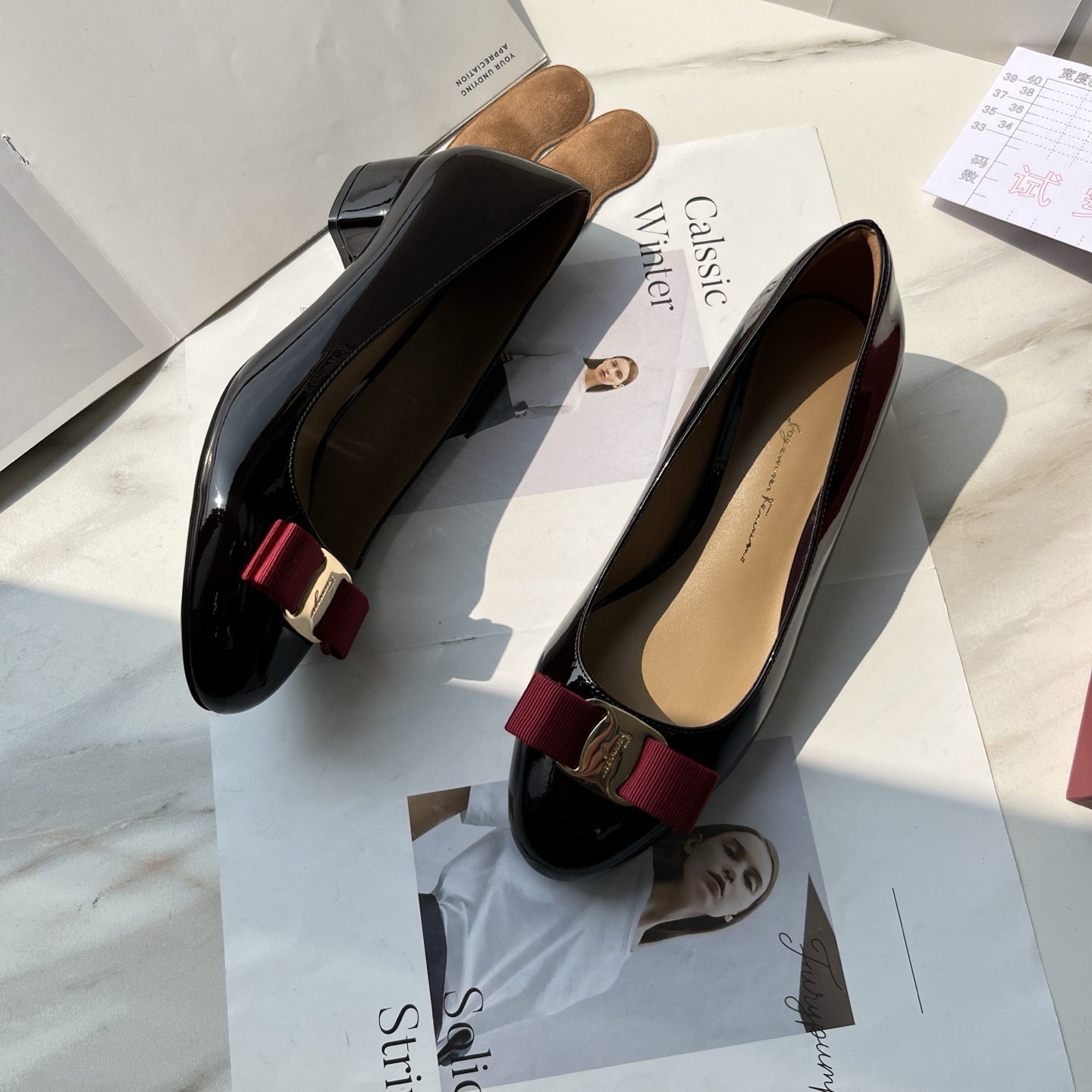 Fila SF 대체 다용도 클래식 패셔너블한 펌프스 라운드 토 보우 페이턴트 가죽 미드 힐 여성용 두꺼운 힐 슈즈