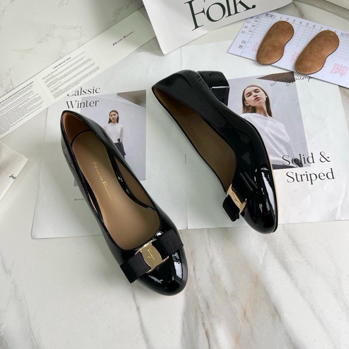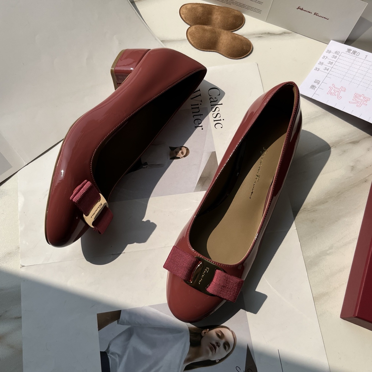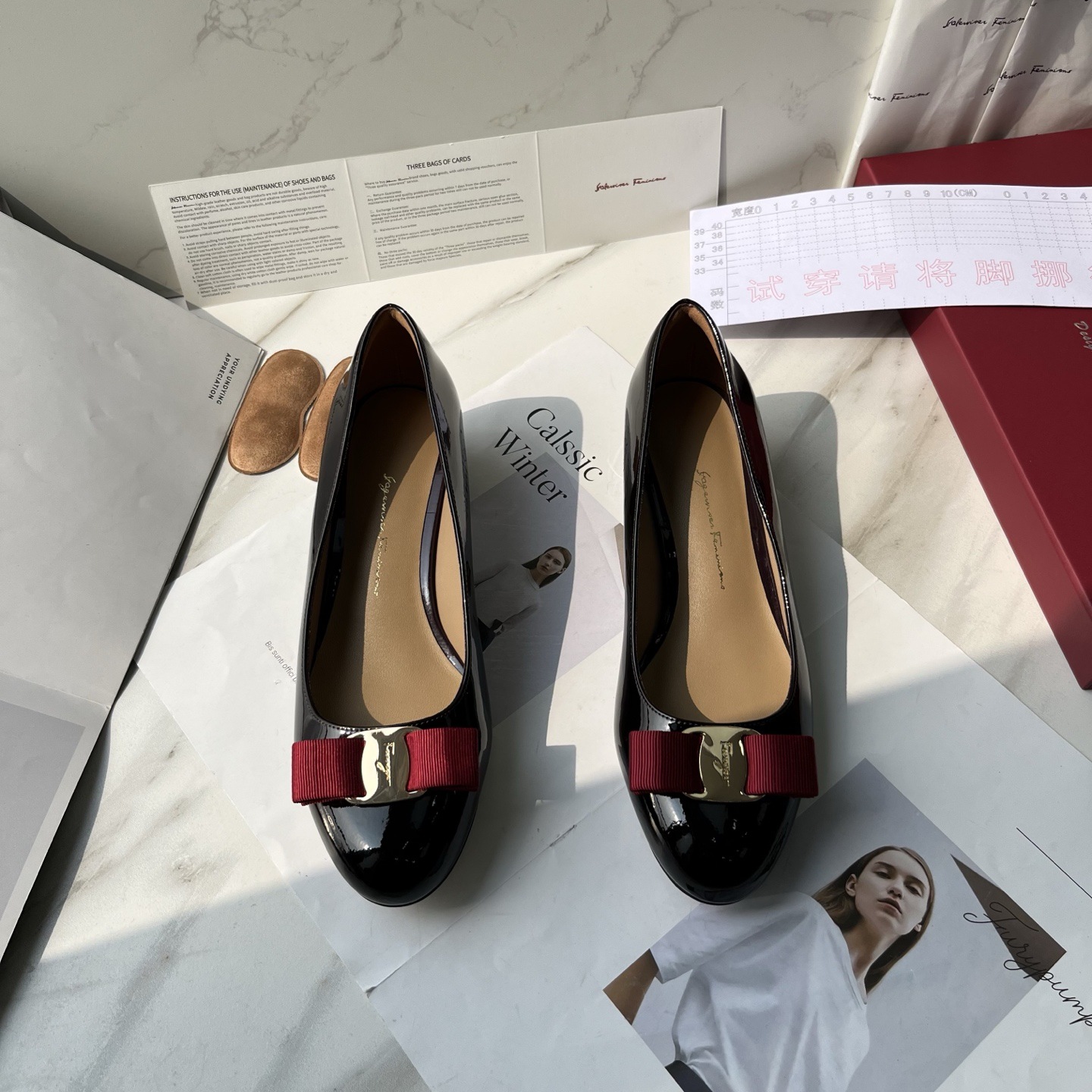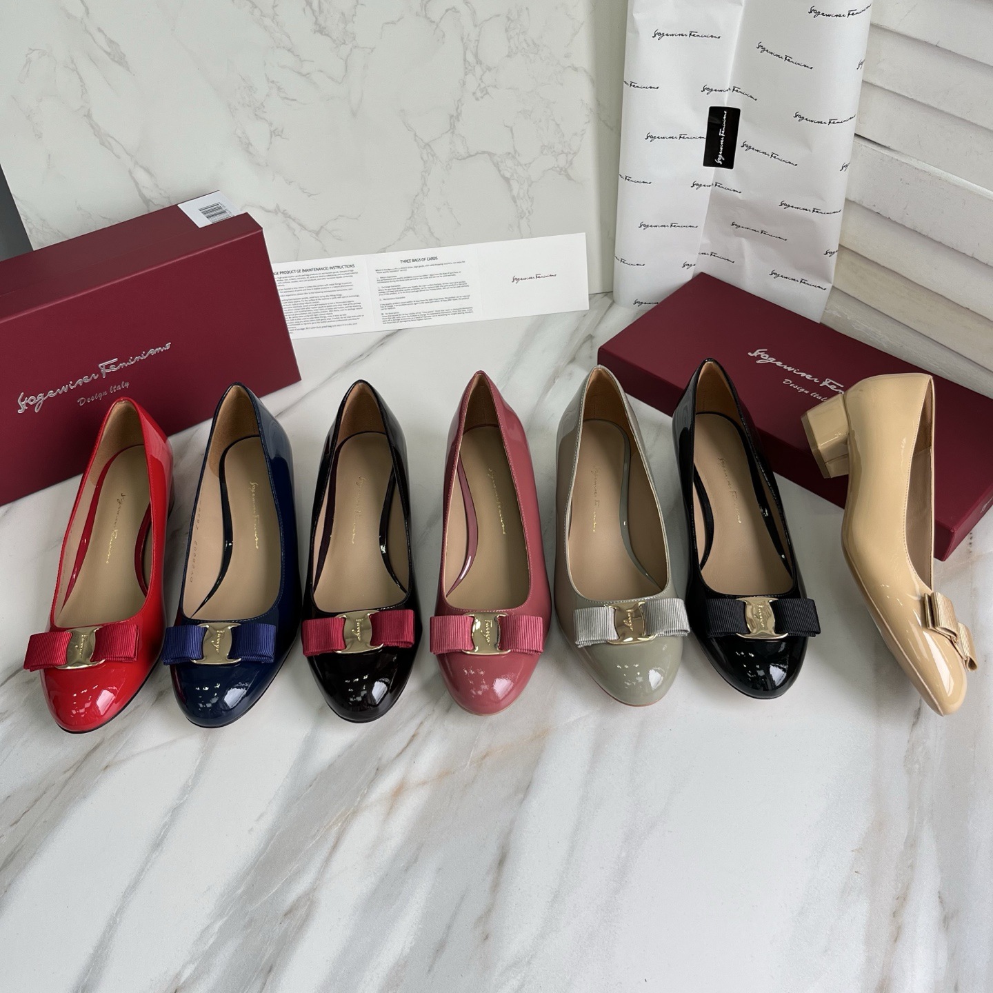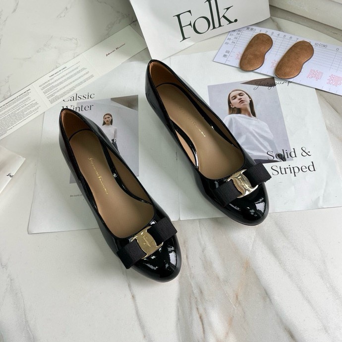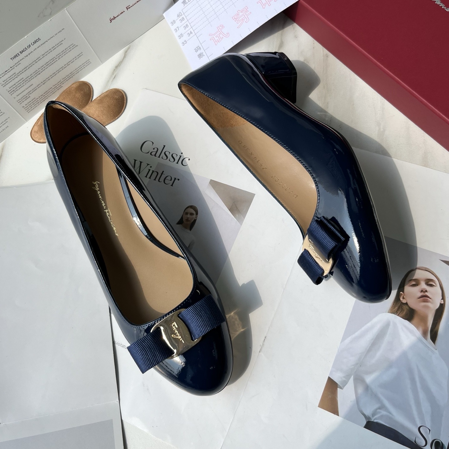 Fila SF 대체 다용도 클래식 패셔너블한 펌프스 라운드 토 보우 페이턴트 가죽 미드 힐 여성용 두꺼운 힐 슈즈