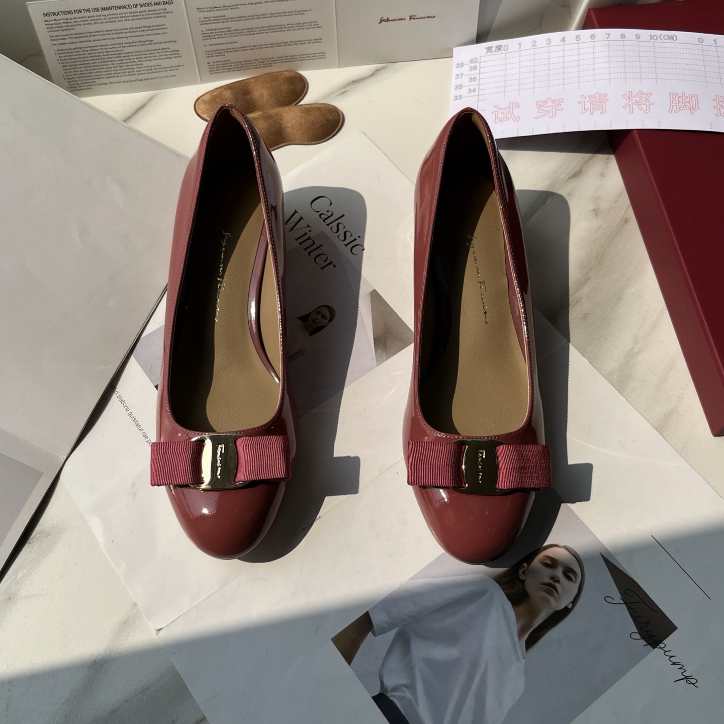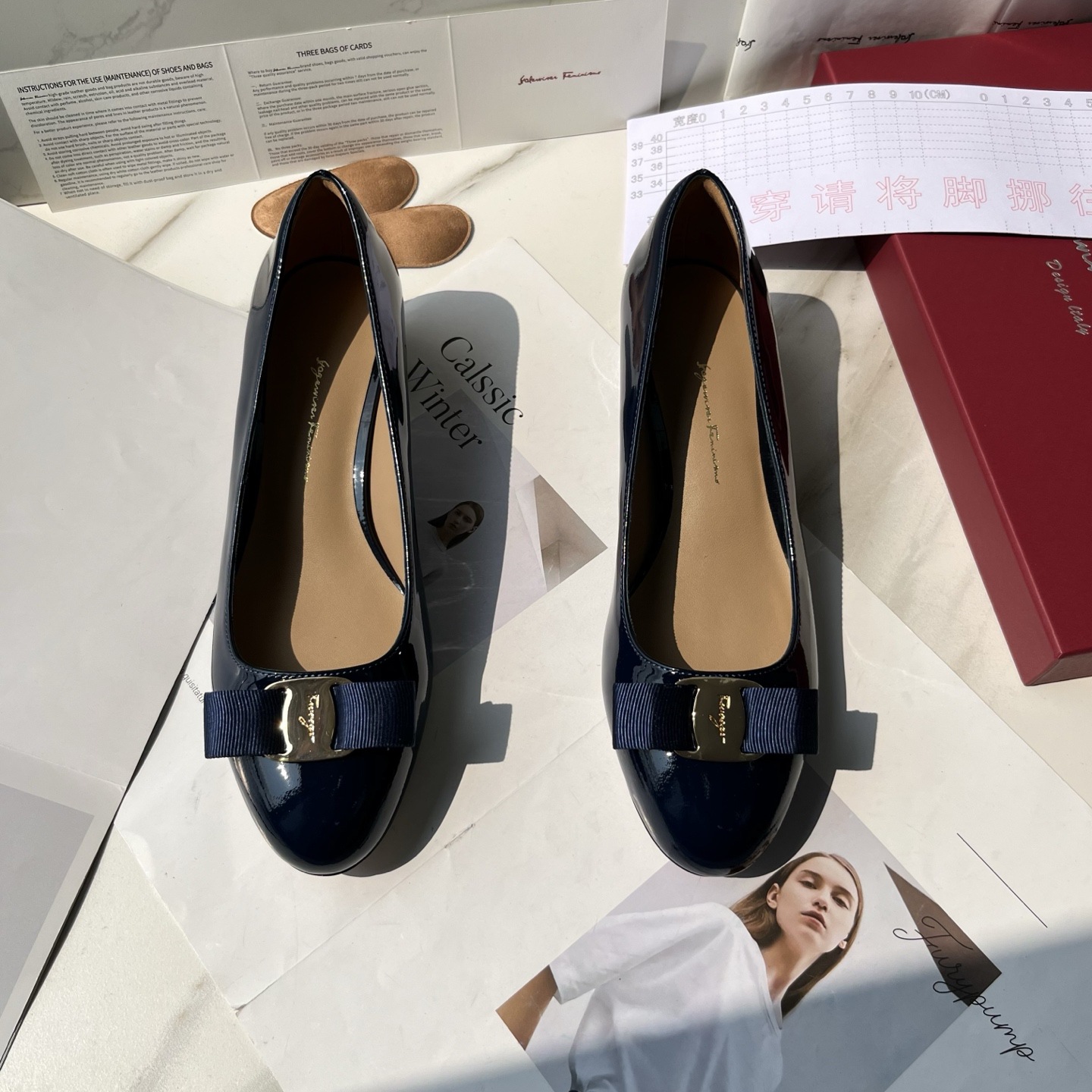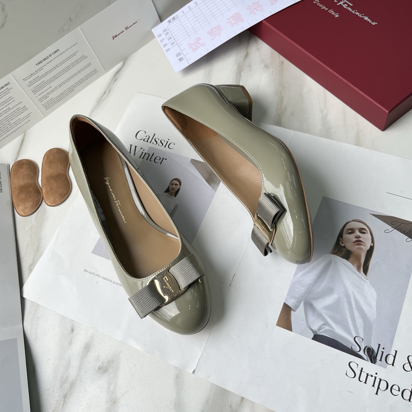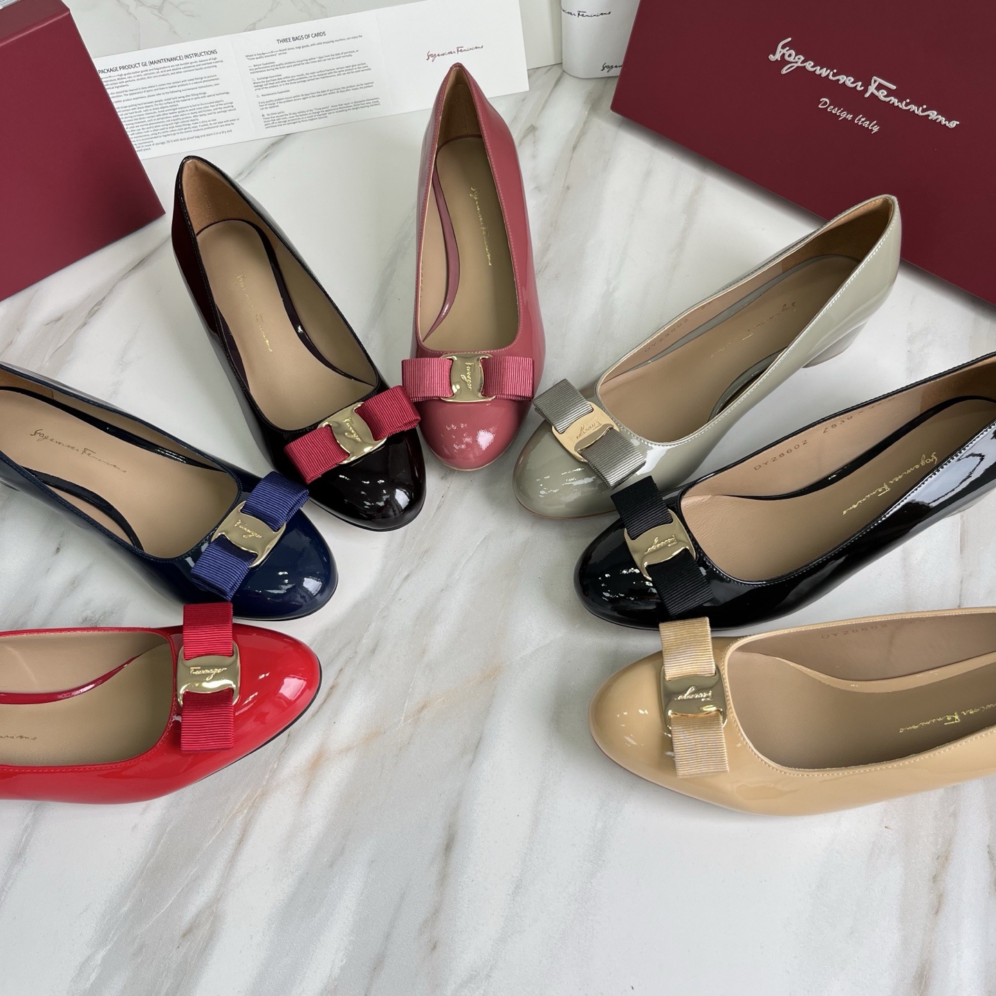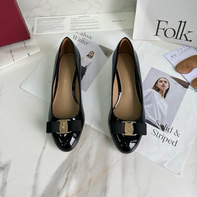 Fila SF 대체 다용도 클래식 패셔너블한 펌프스 라운드 토 보우 페이턴트 가죽 미드 힐 여성용 두꺼운 힐 슈즈
