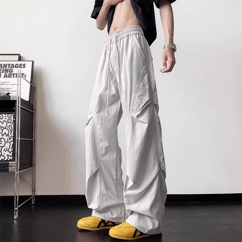 아이스 실크 파라슈트 카고 바지 남성 여름 얇은 와이드 레그 충전 바지 아메리칸 하이 스트리트 디자인 캐주얼 속건 바지