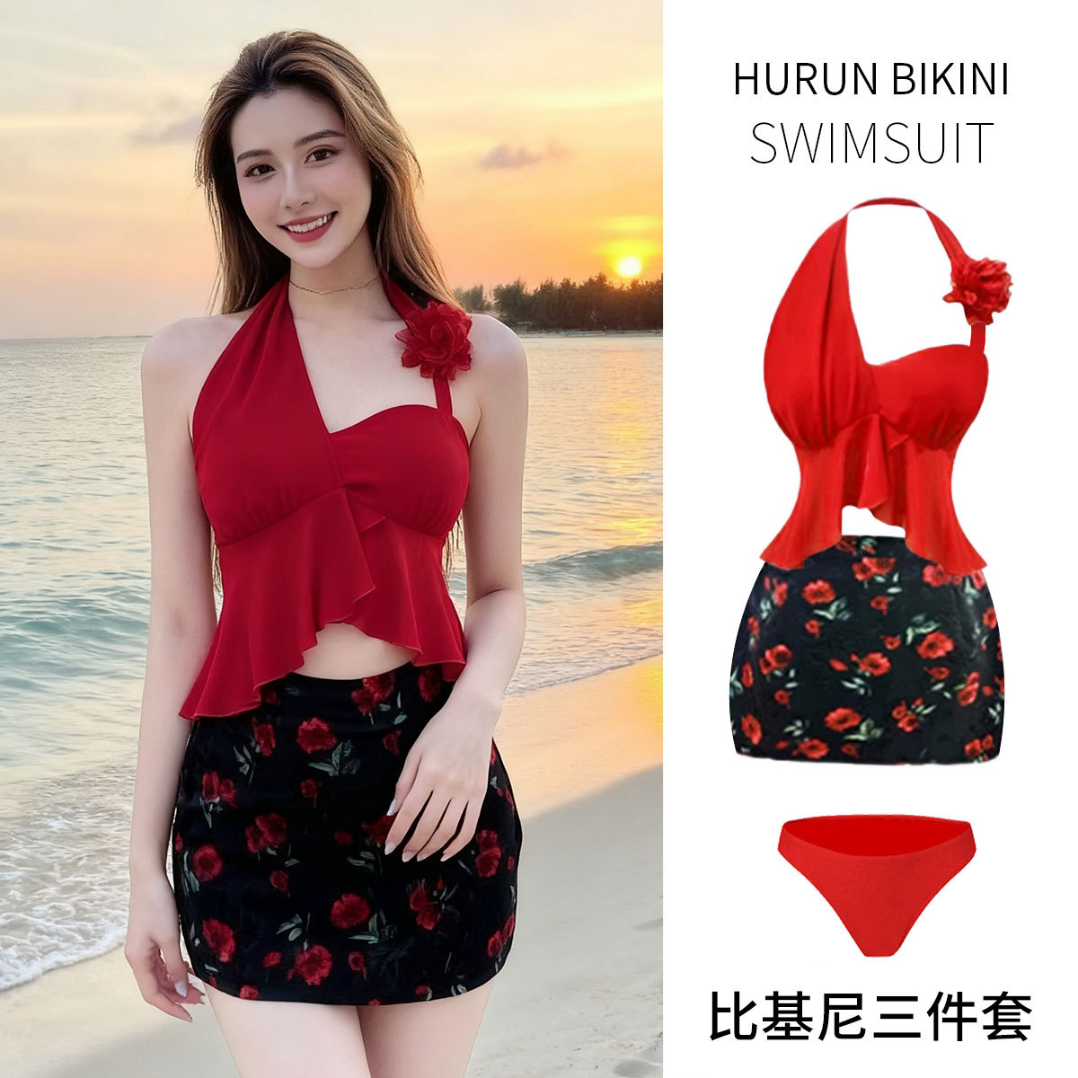 여성용 수영복 2025 새로운 핫 스타일 슈퍼 섹시한 레드 스플릿 소형 비키니 여성용 온천 3 피스 세트