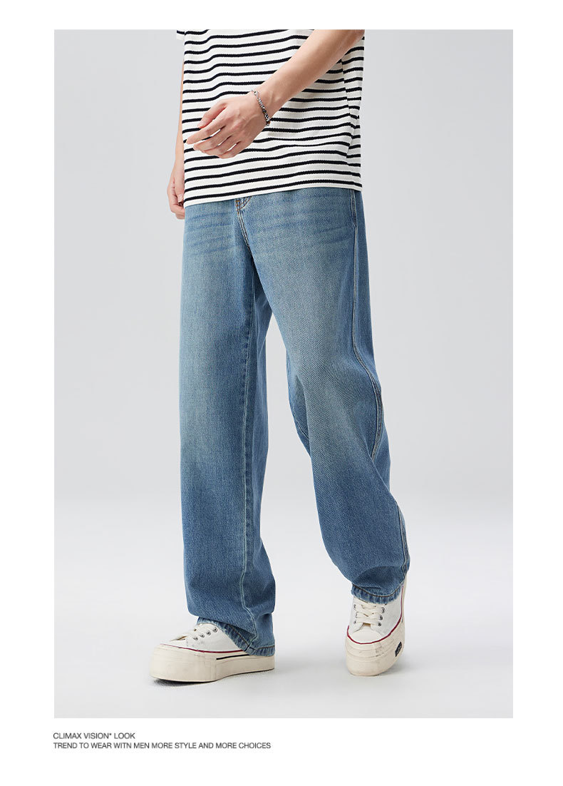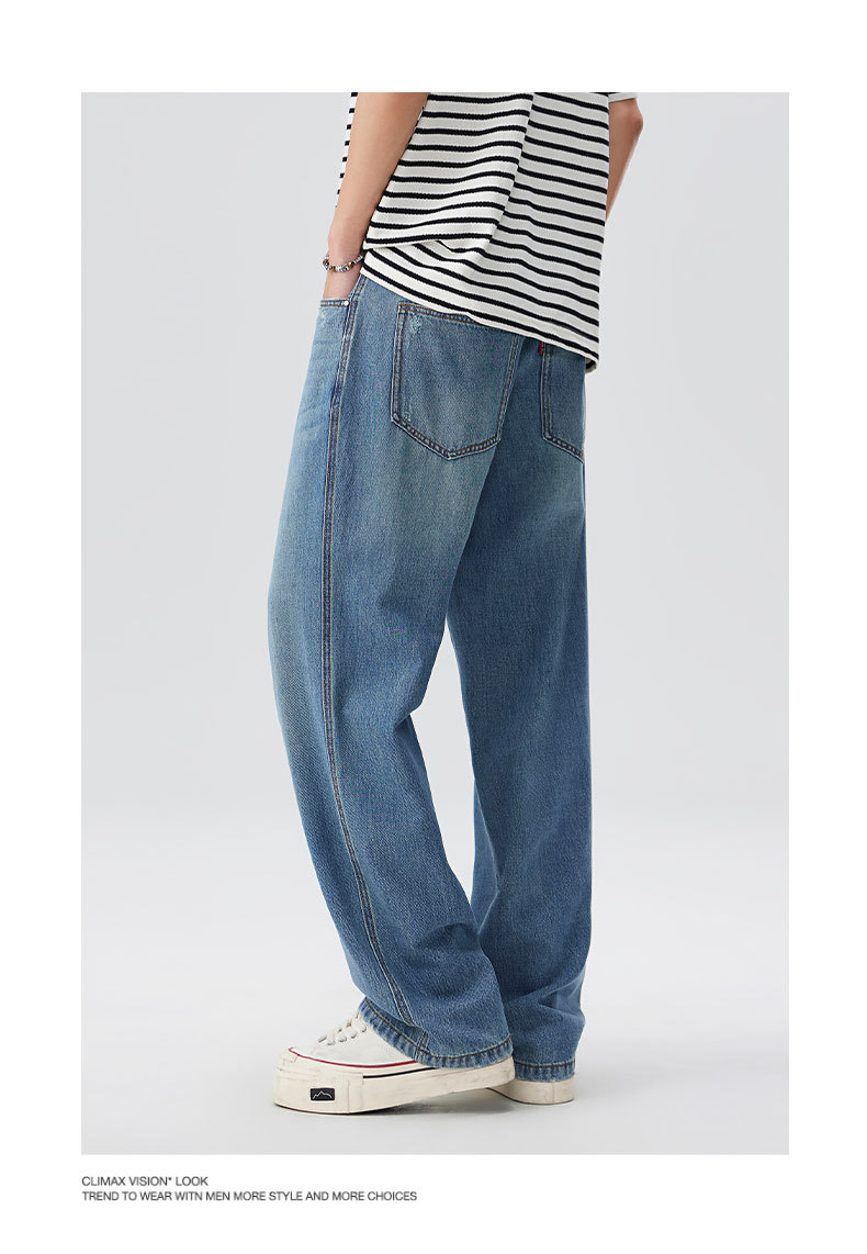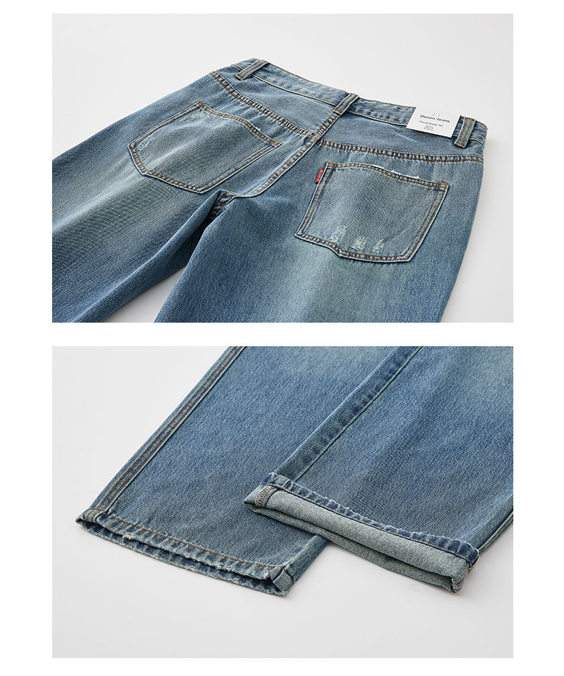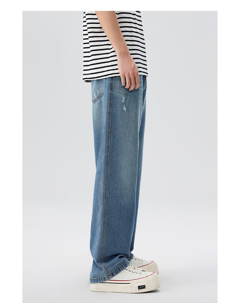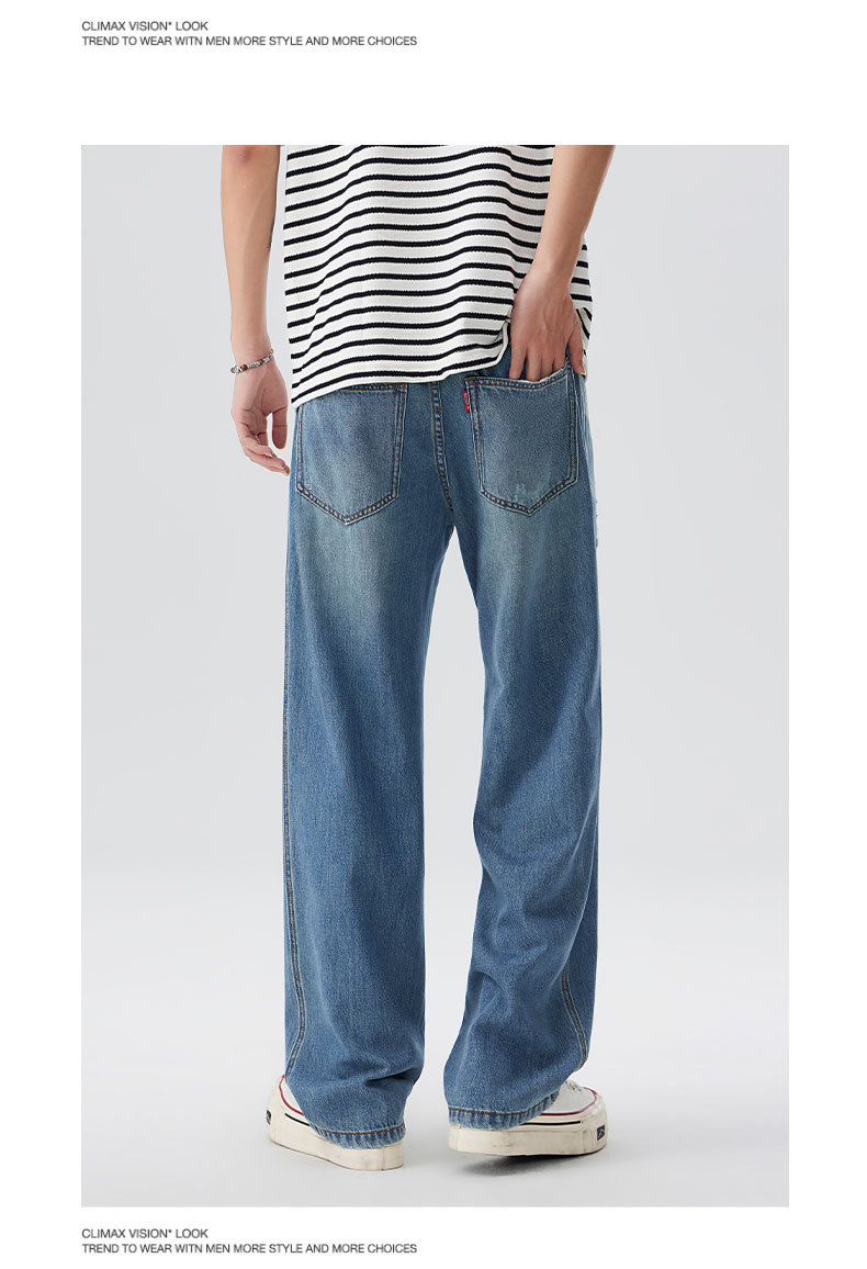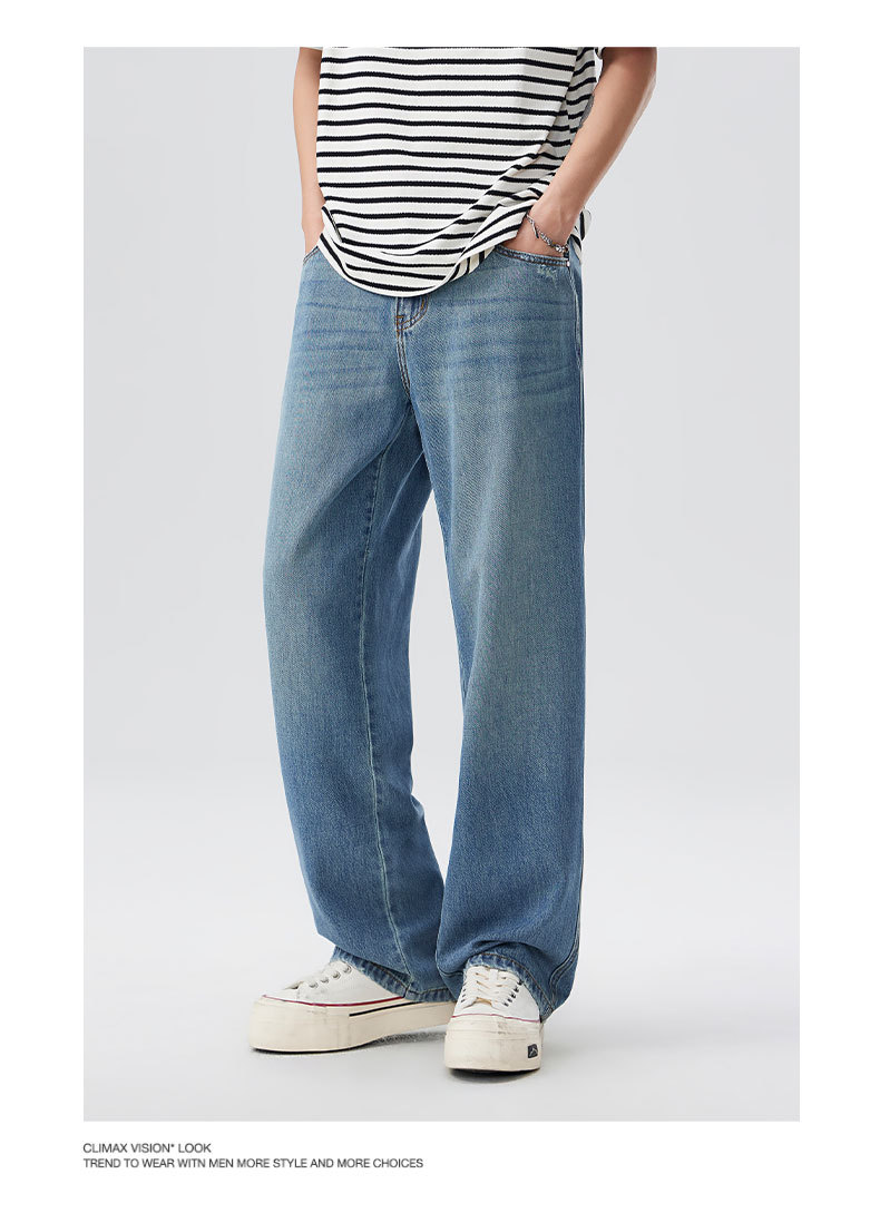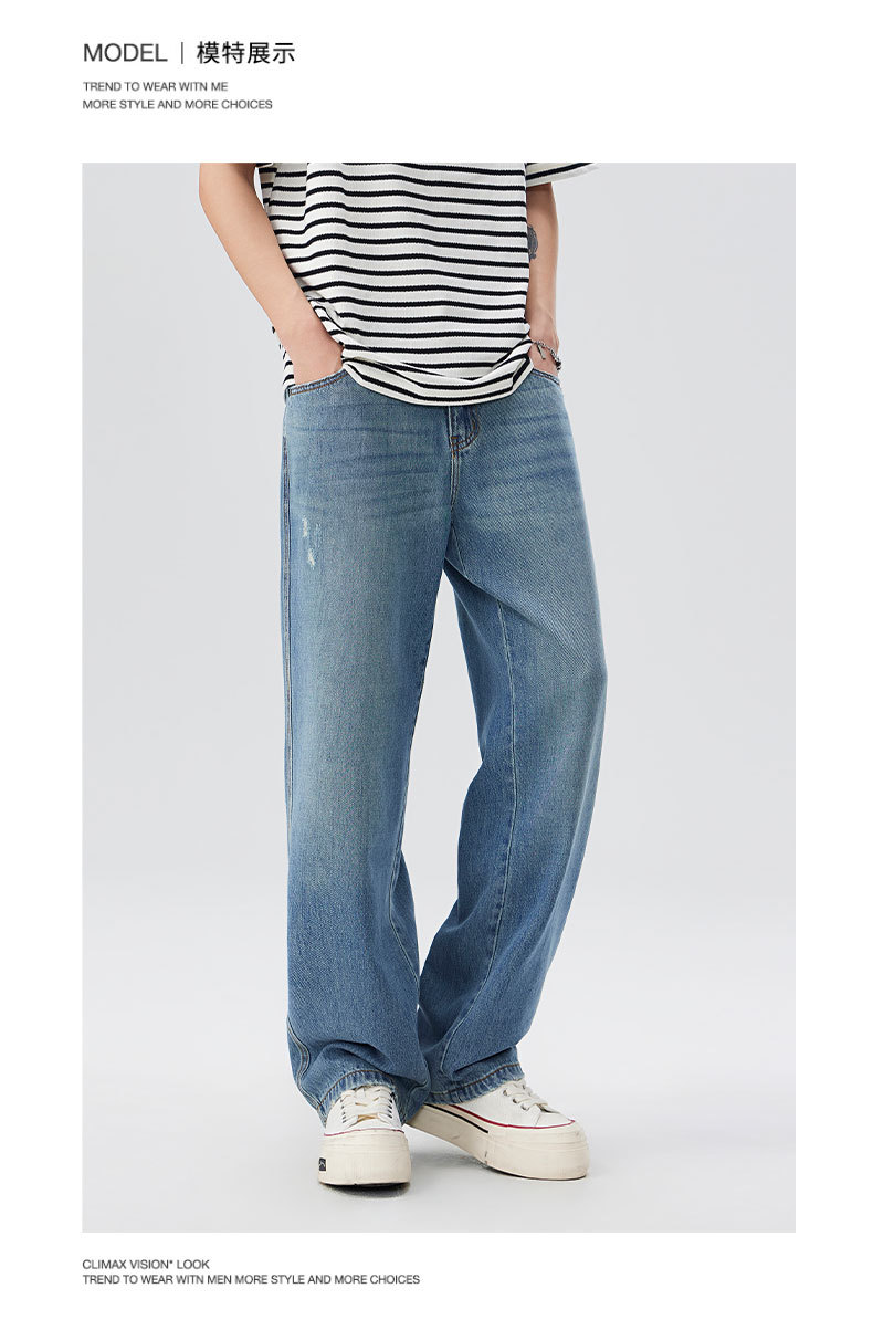 Muqiu 남성복 | Lyocell Tencel 찢어진 청바지 남성용 미국 여름 얇은 드레이프 루즈 스트레이트 바지