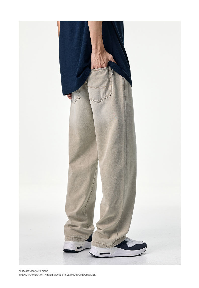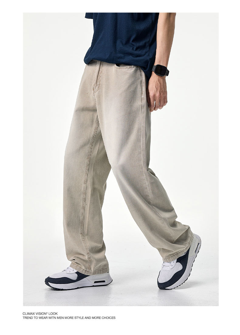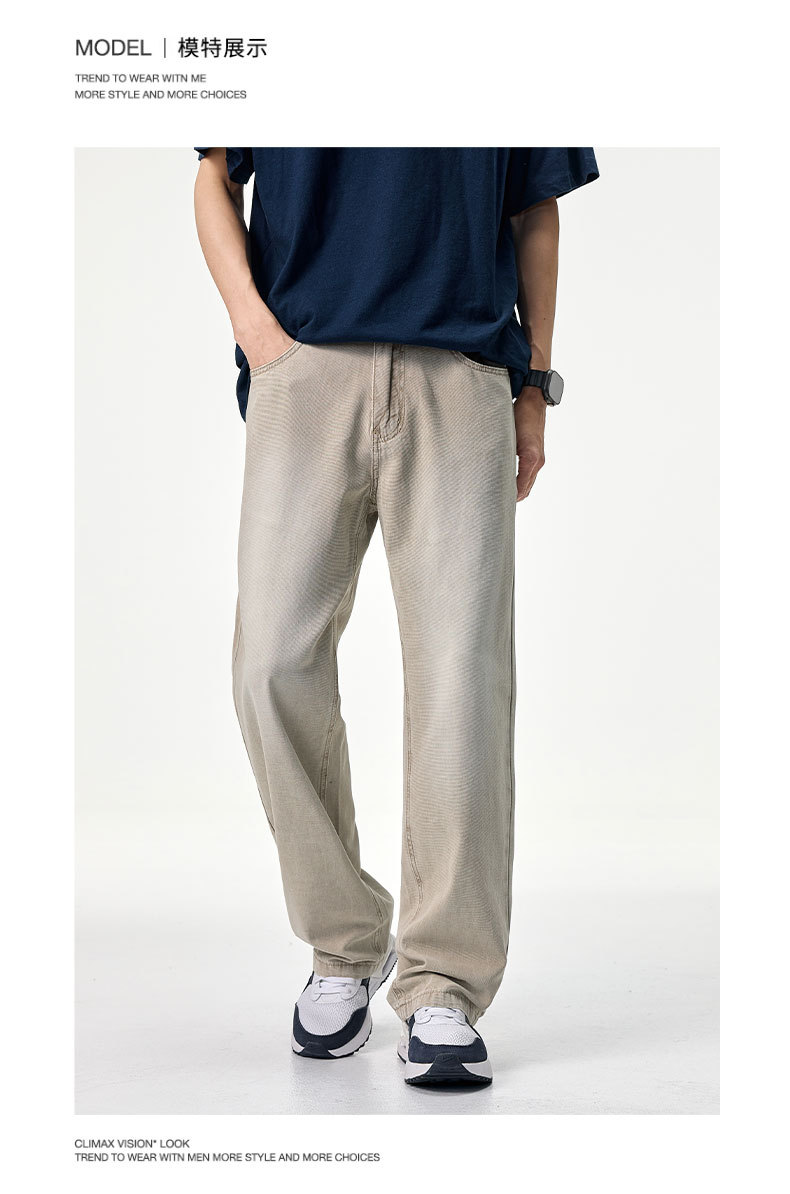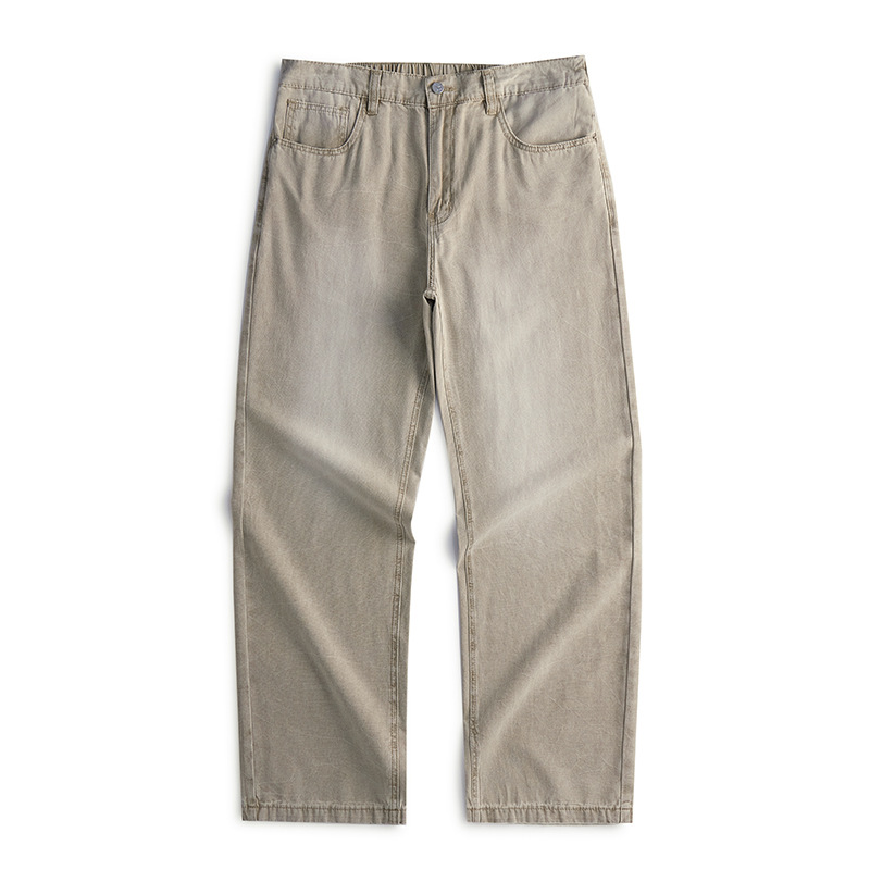 Muqiu 남성복 | 여름 아메리칸 레트로 워싱 비드 캔버스 카키 청바지 남성 루즈 스트레이트 캐주얼 바지
