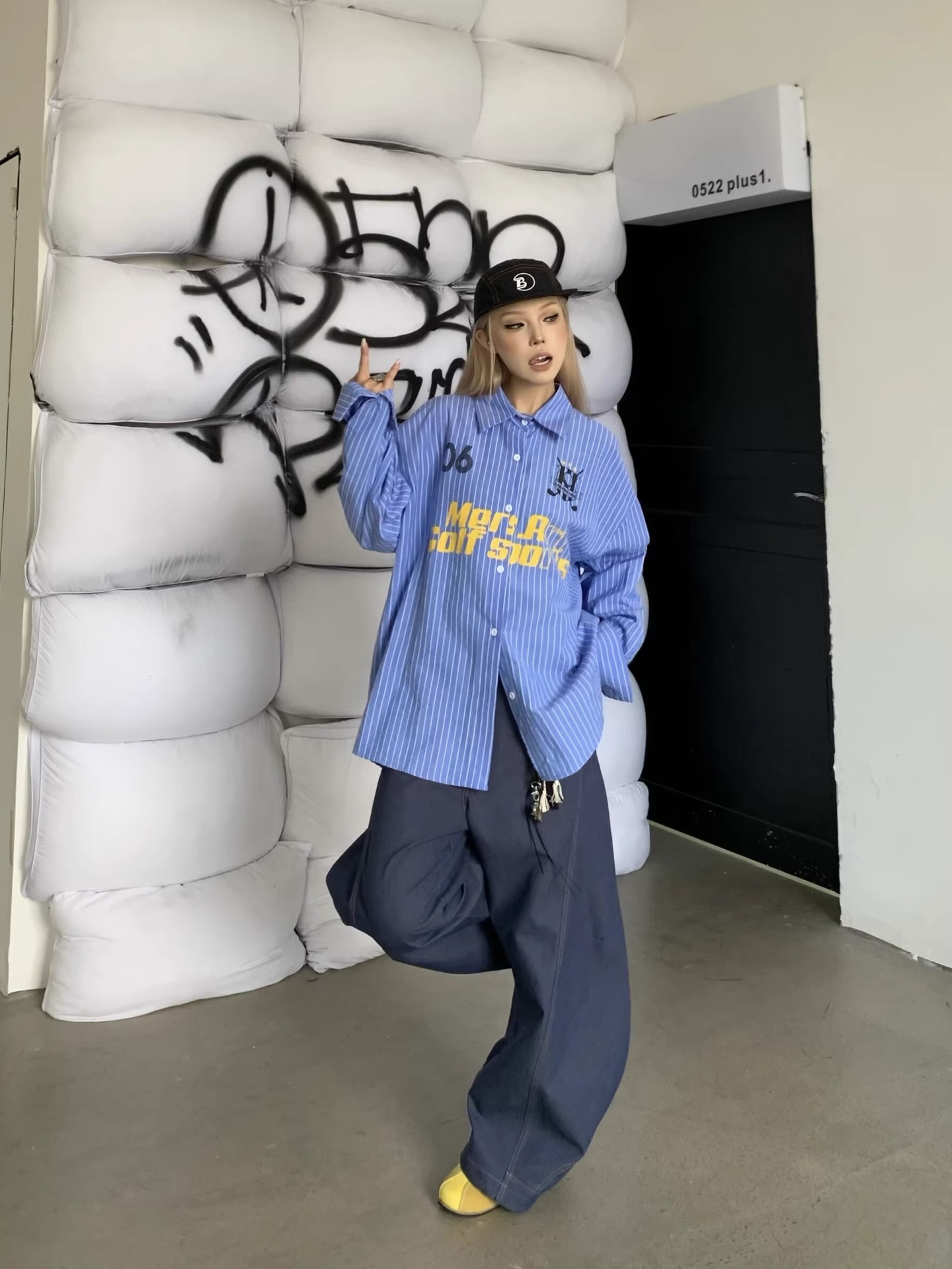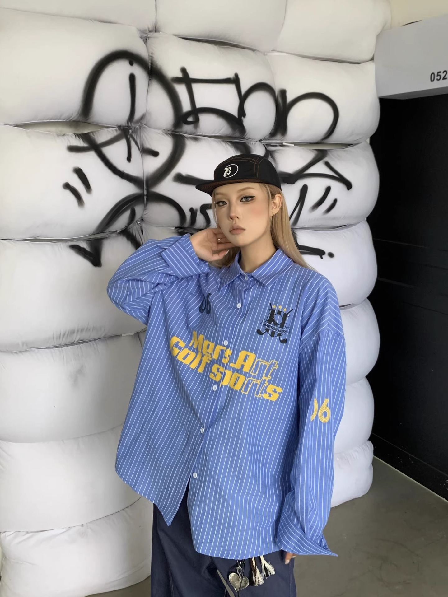 여성을위한 레트로 세로 줄무늬 긴팔 셔츠 봄, 가을 느슨한 캐주얼 대비 문자 인쇄 태양 보호 탑 재킷 유행스토어 가기