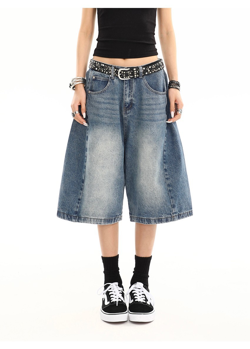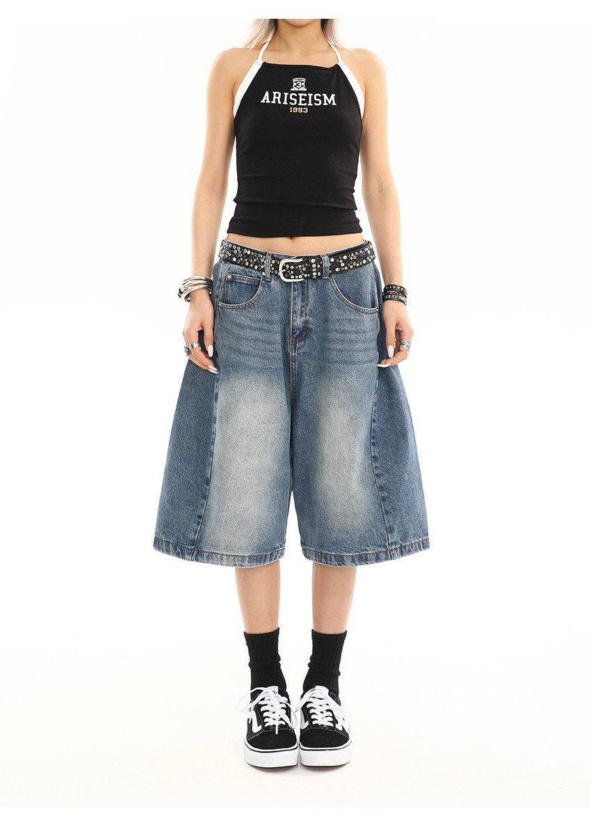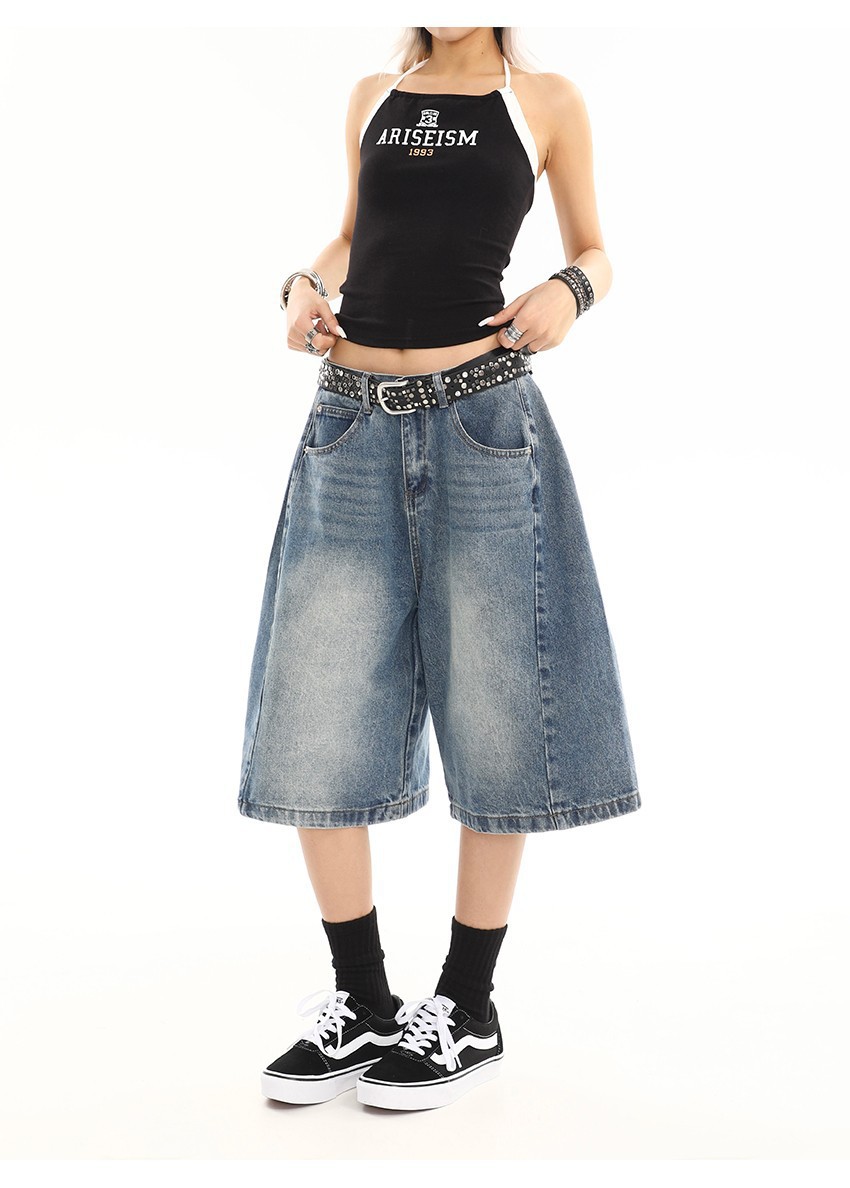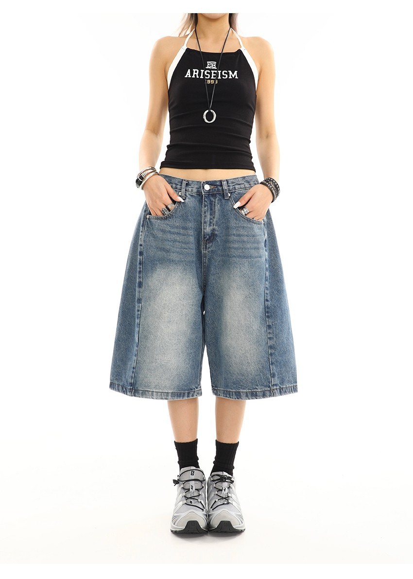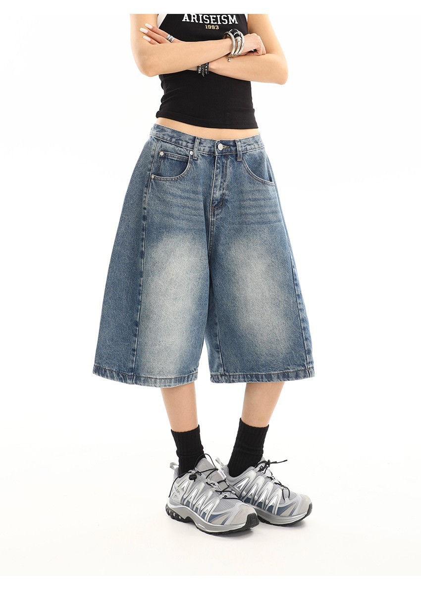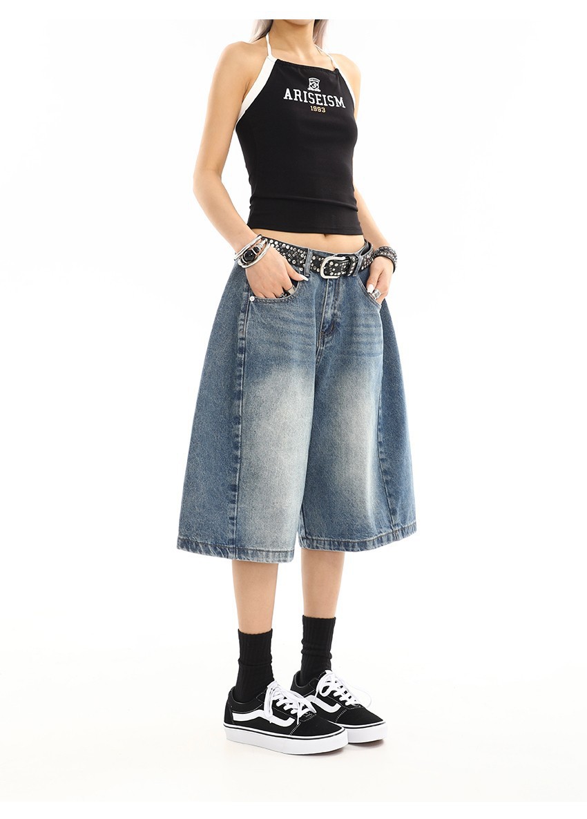 여름 여성을 위한 아메리칸 레트로 워싱 디스트레스드 데님 미드팬츠 새로운 디자인 캐주얼 루즈 와이드 레그 5부 반바지