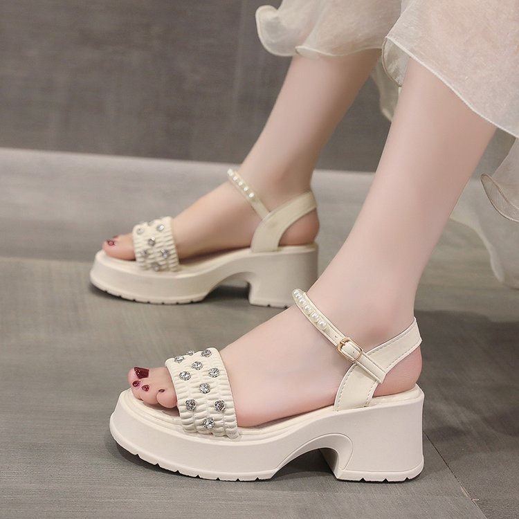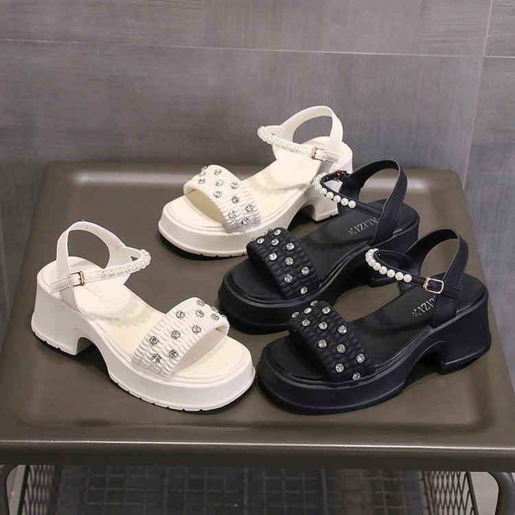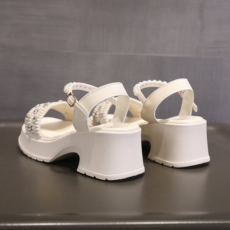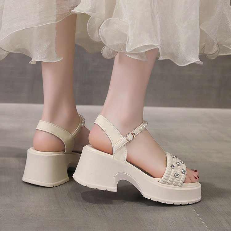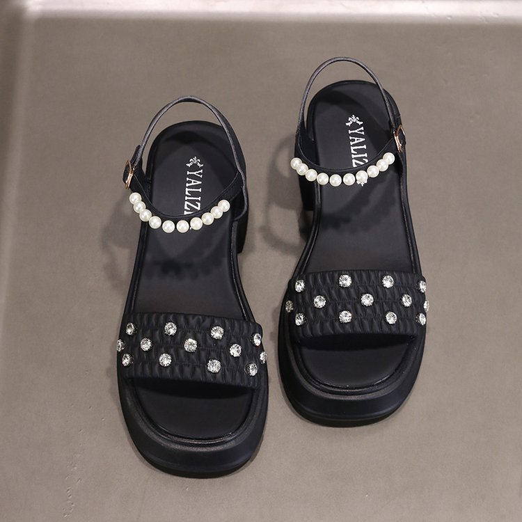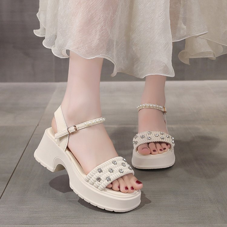 여성용 요정 스타일 라인스톤 샌들 2025 여름 플랫폼 두꺼운 밑창 슬리밍 로마 패션 아우터 비치 샌들