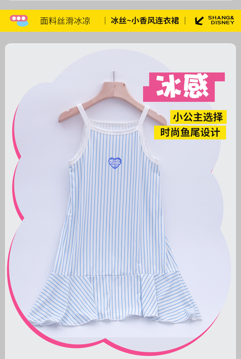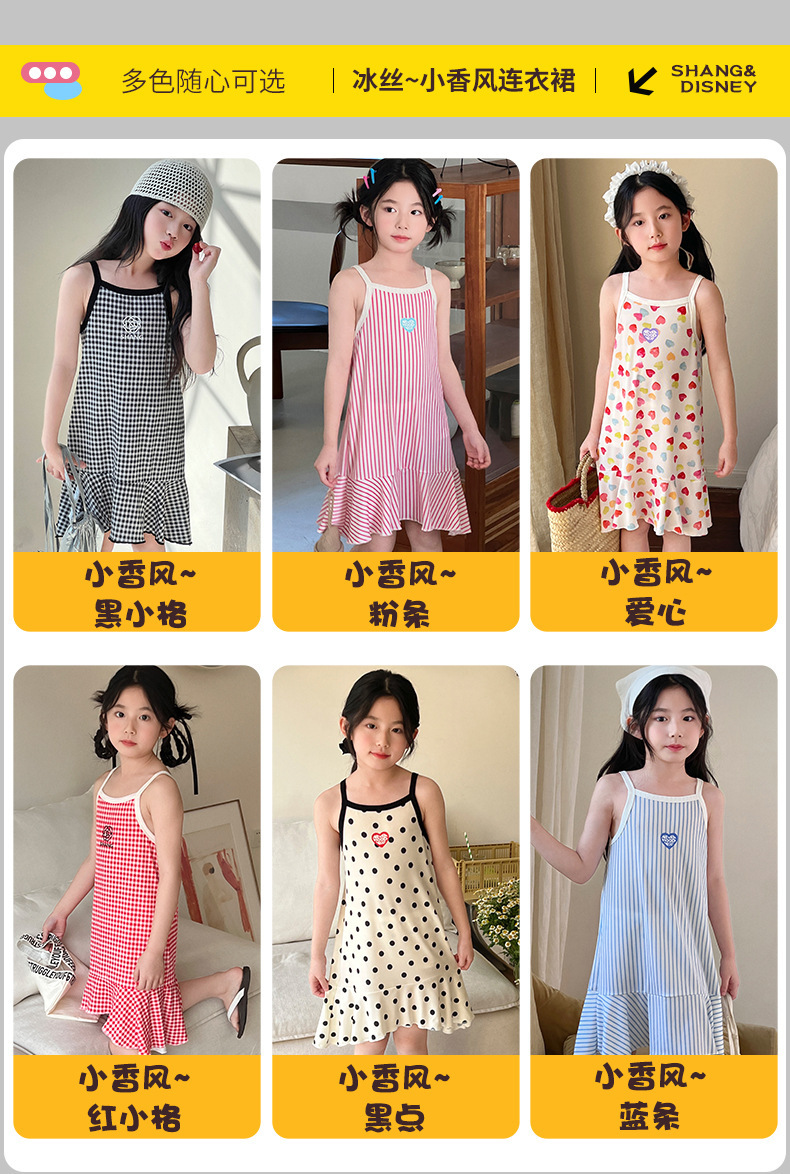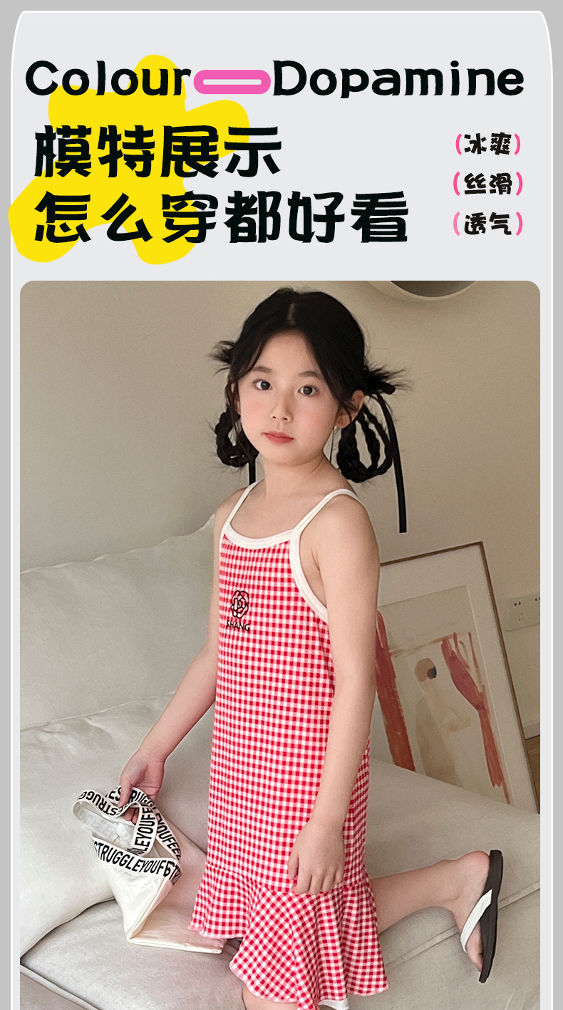여름 새 스타일 소녀의 작은 향기로운 얼음 실크 서스펜더 잠옷 어린이 격자 무늬 사랑 물고기 꼬리 드레스