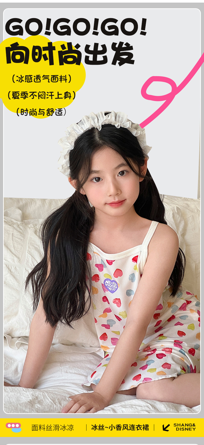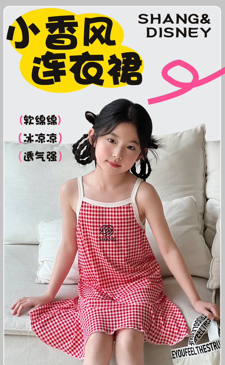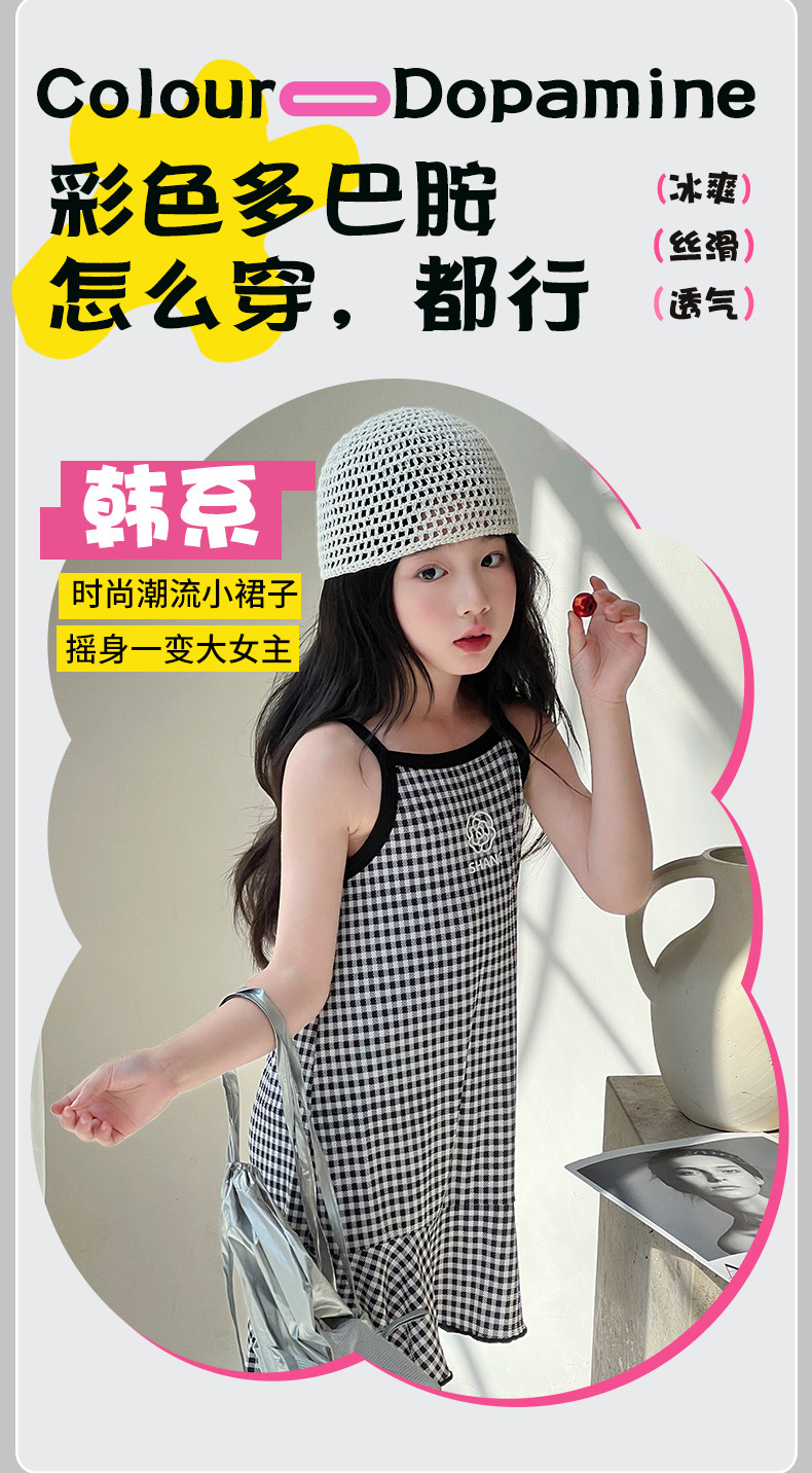 여름 새 스타일 소녀의 작은 향기로운 얼음 실크 서스펜더 잠옷 어린이 격자 무늬 사랑 물고기 꼬리 드레스