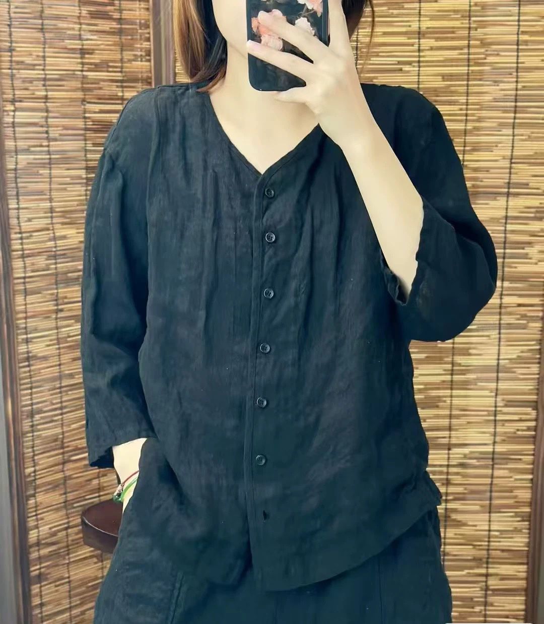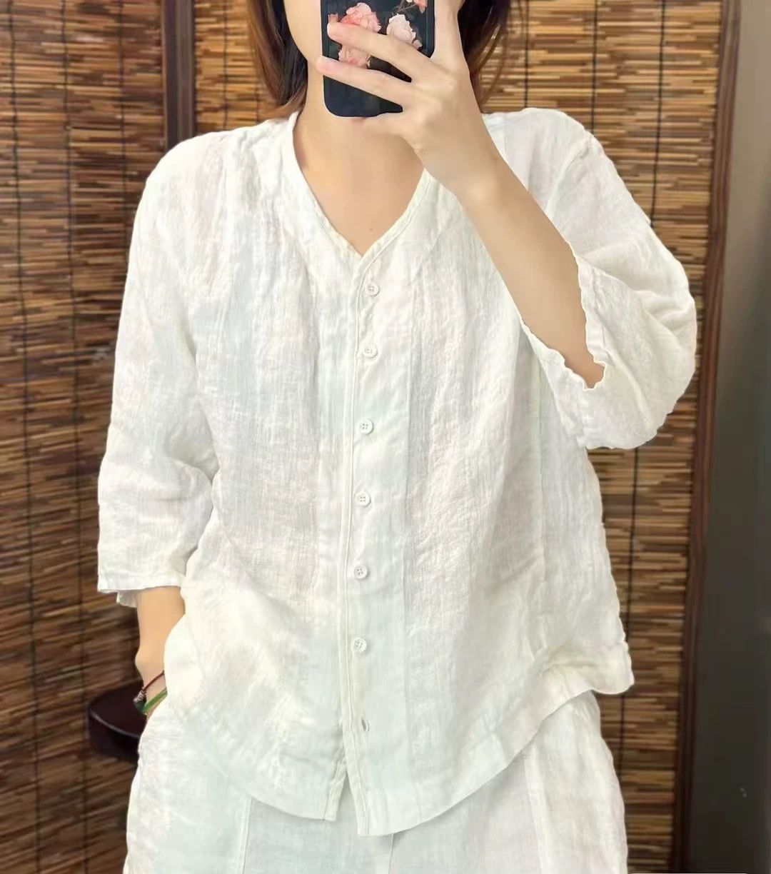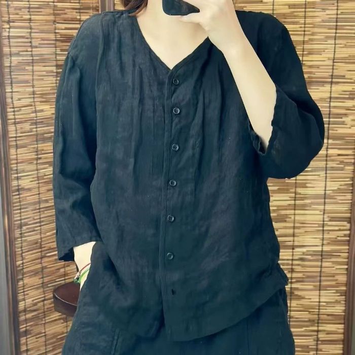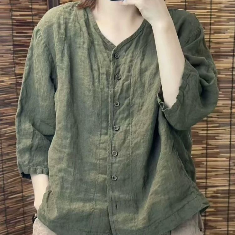 여성을위한 코튼과 린넨 7부 소매 셔츠 2025 여름 새로운 스타일 예술적 복고풍 느슨한 슬림 v 넥 솔리드 컬러 카디건 탑