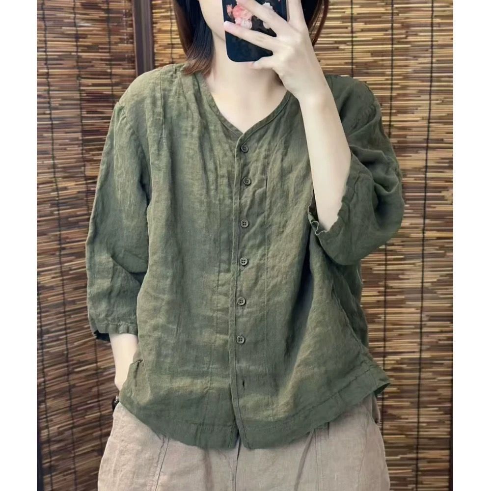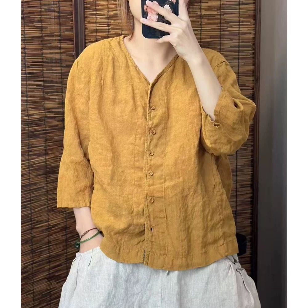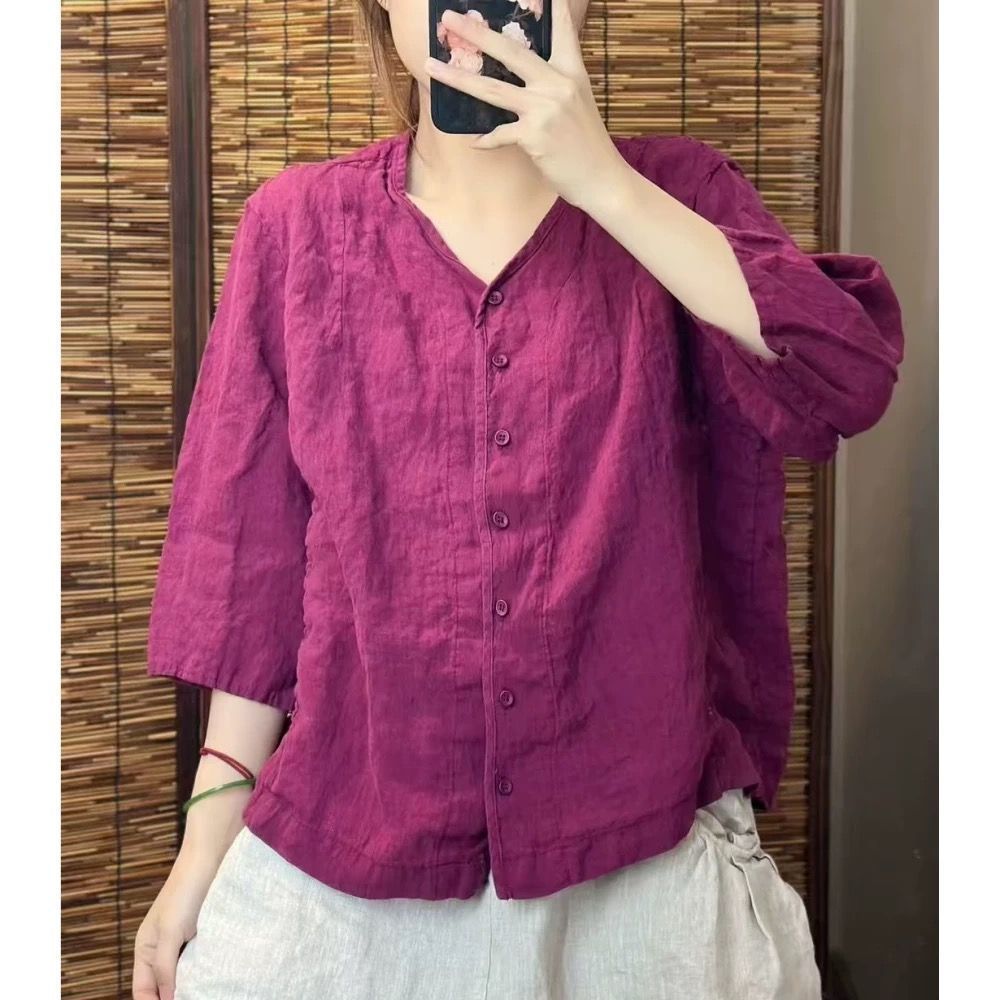 여성을위한 코튼과 린넨 7부 소매 셔츠 2025 여름 새로운 스타일 예술적 복고풍 느슨한 슬림 v 넥 솔리드 컬러 카디건 탑스토어 가기