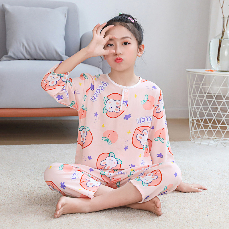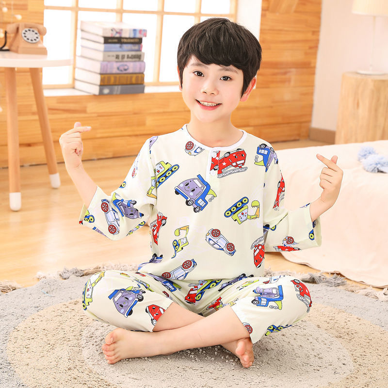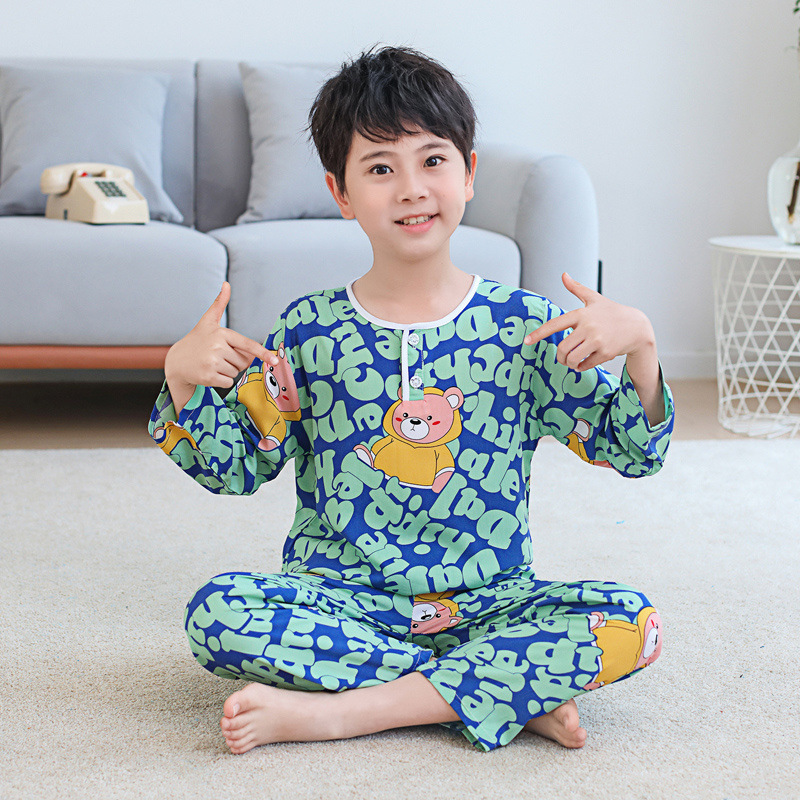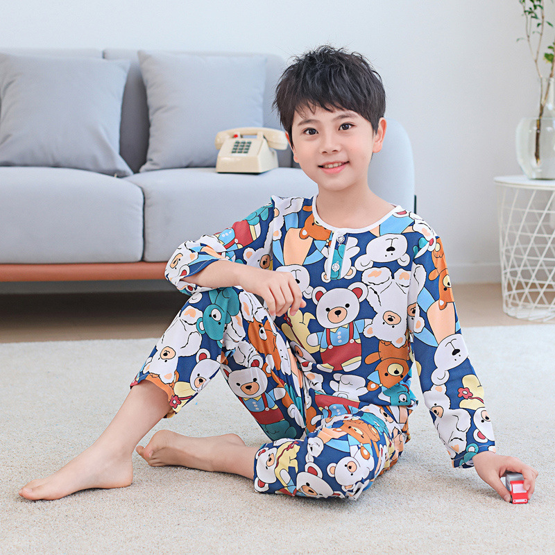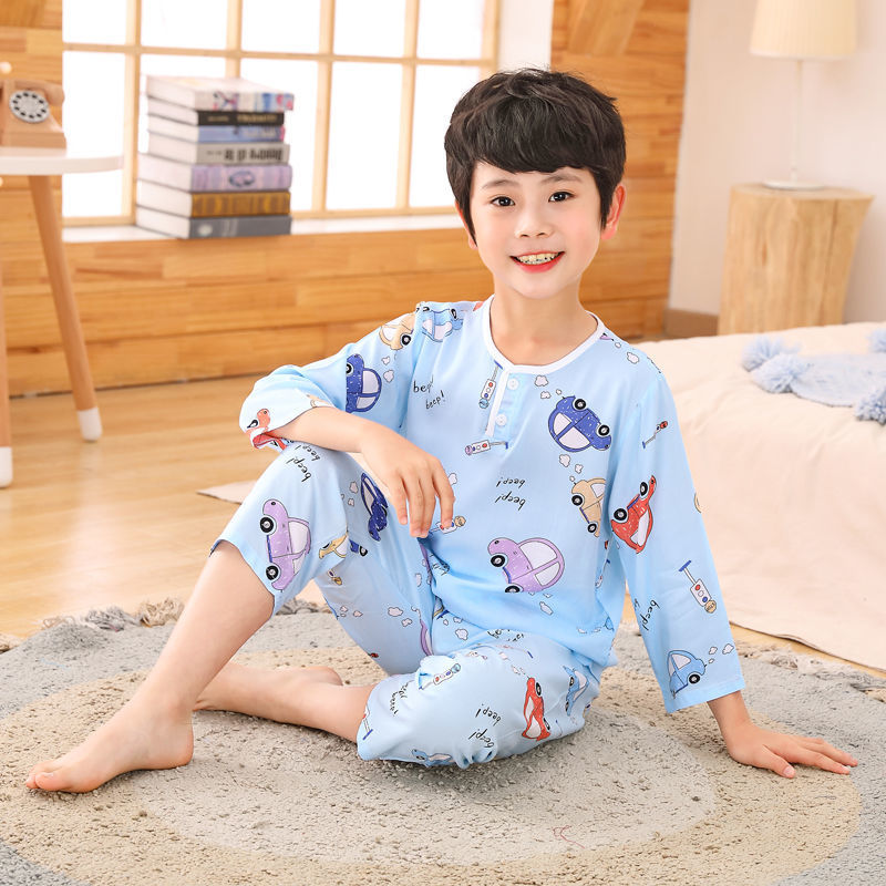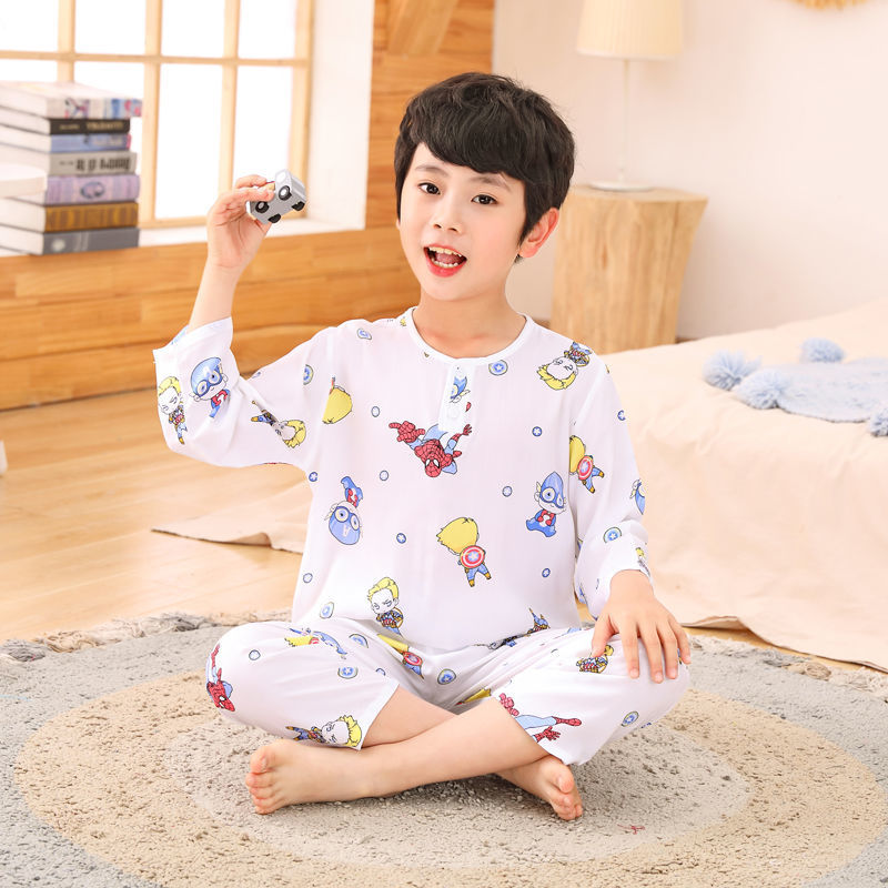 소년과 소녀를위한 여름 어린이 면화 실크 잠옷, 중대형 어린이 얇은 면화 실크 아기 에어컨 가정 의류 긴팔 양복스토어 가기